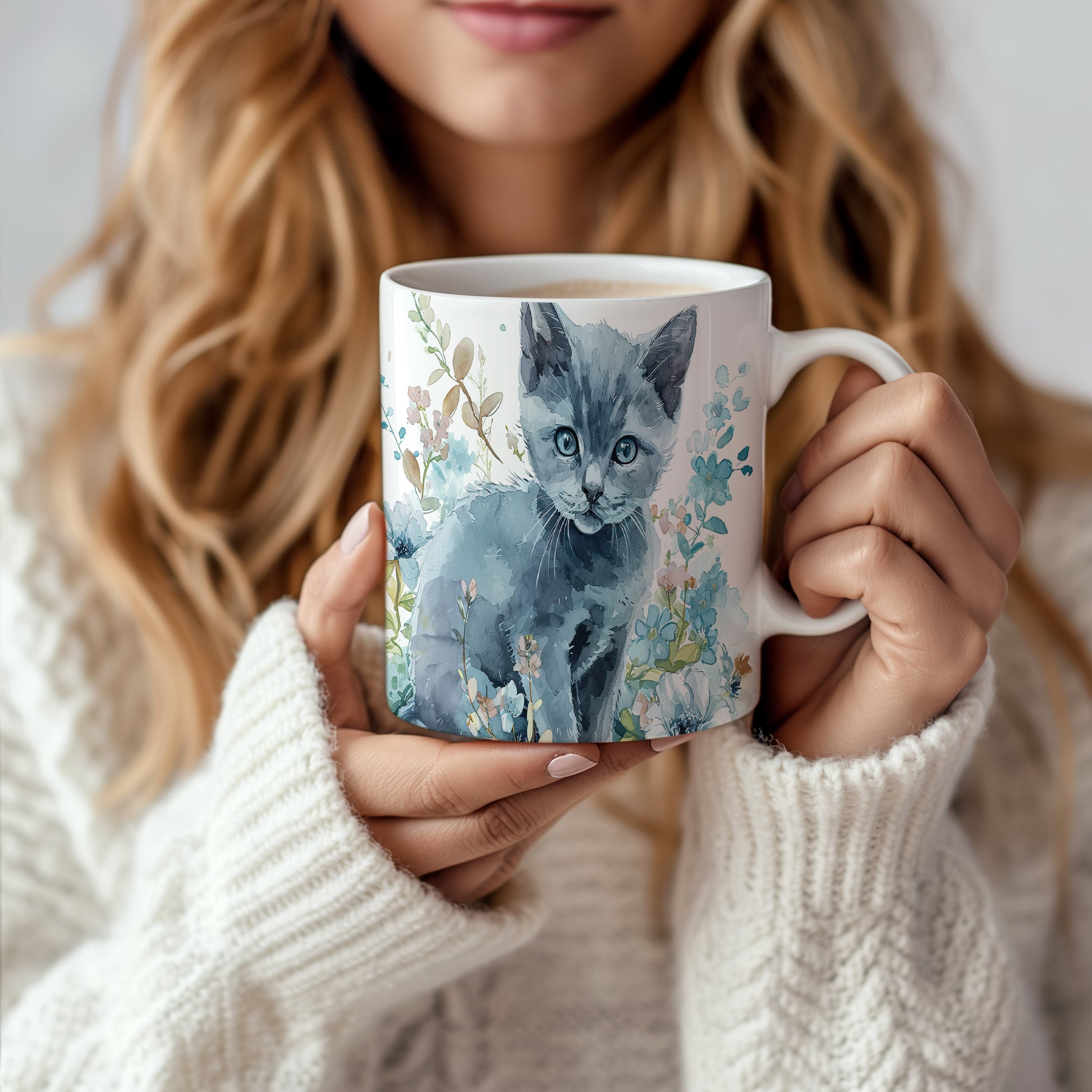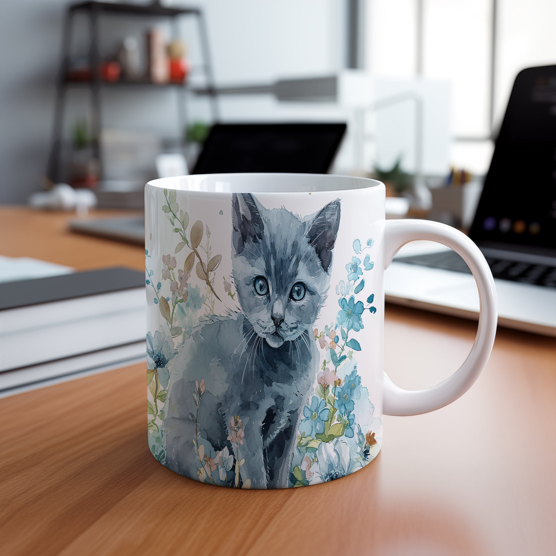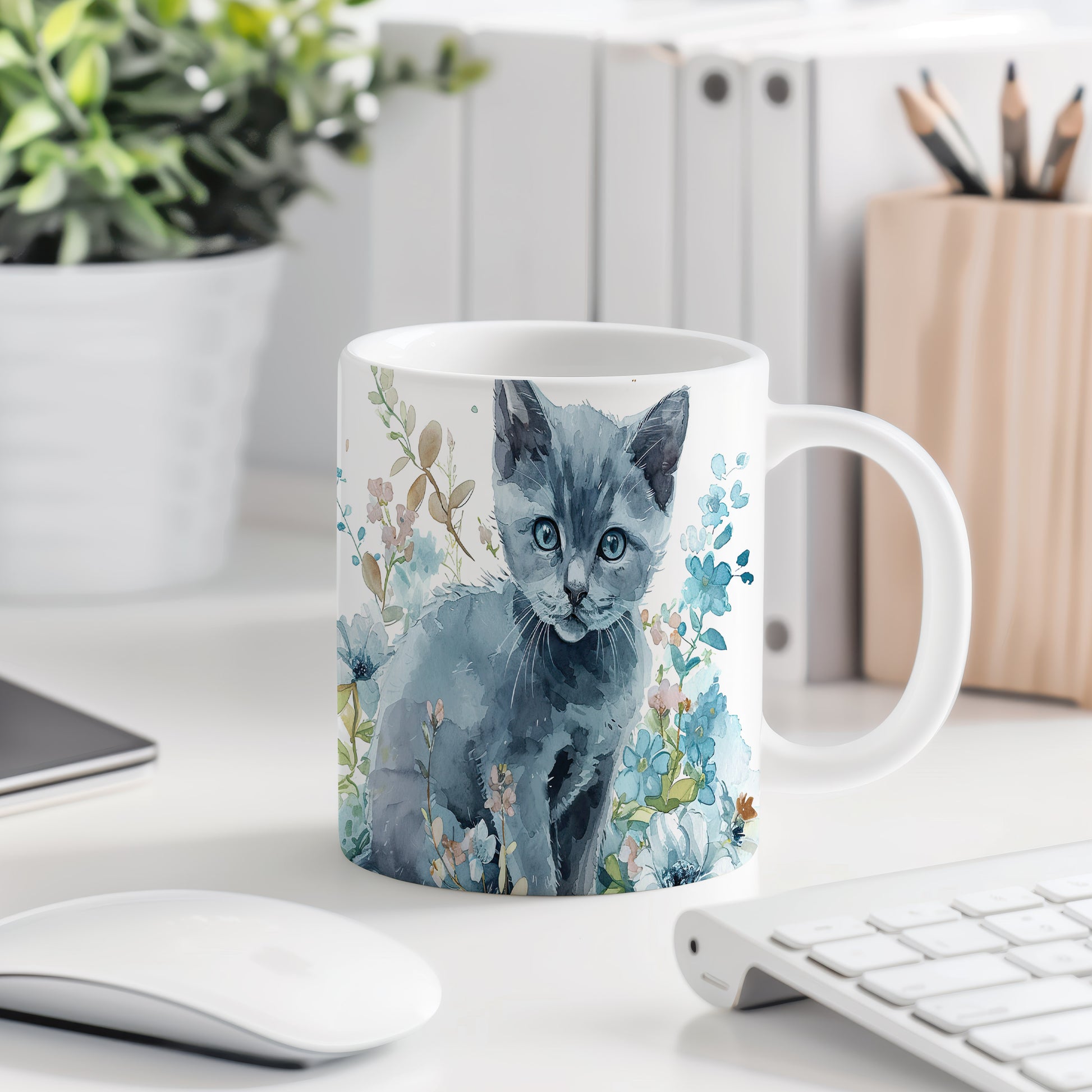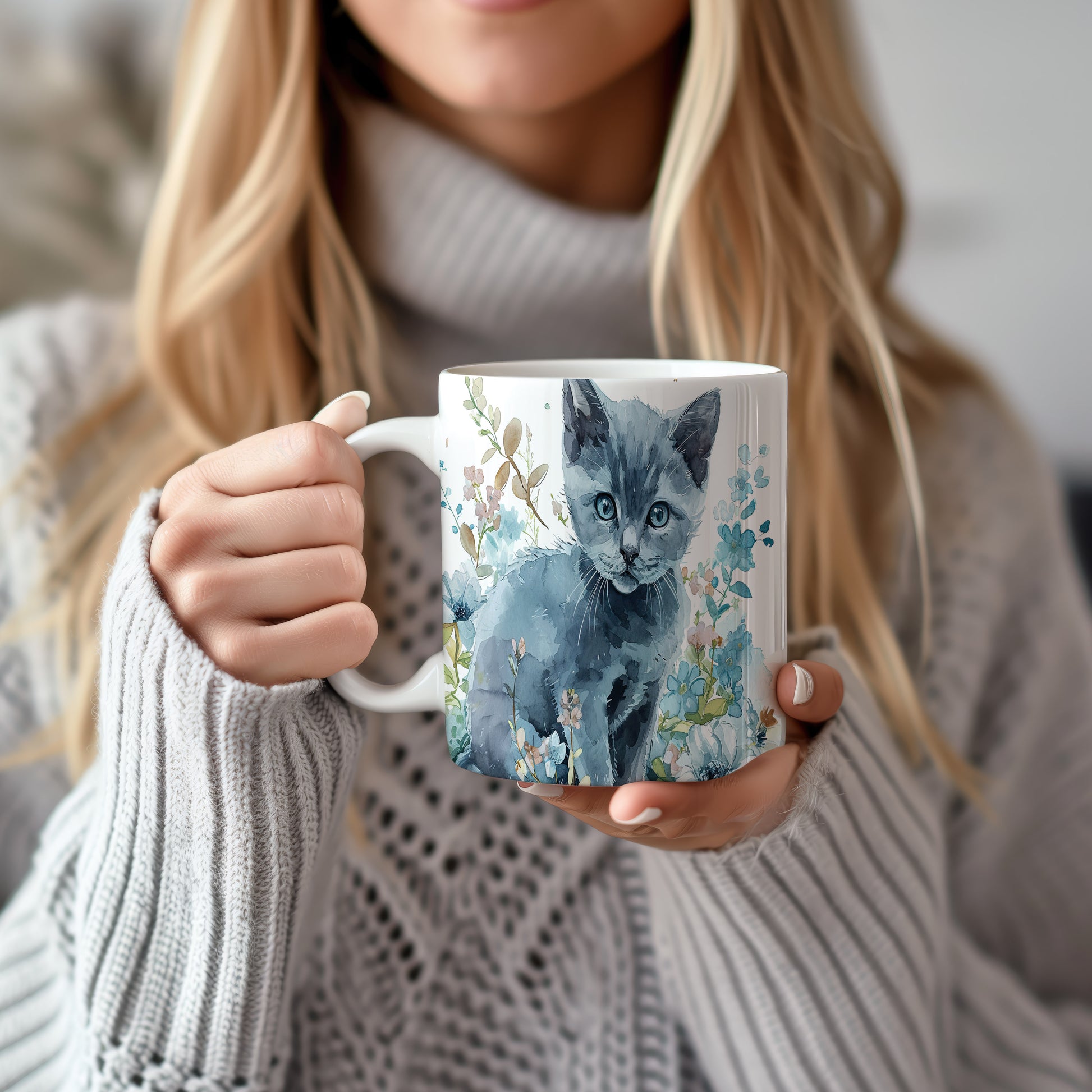 Hrnek s roztomilou kočkou mezi květinami – modrými detaily