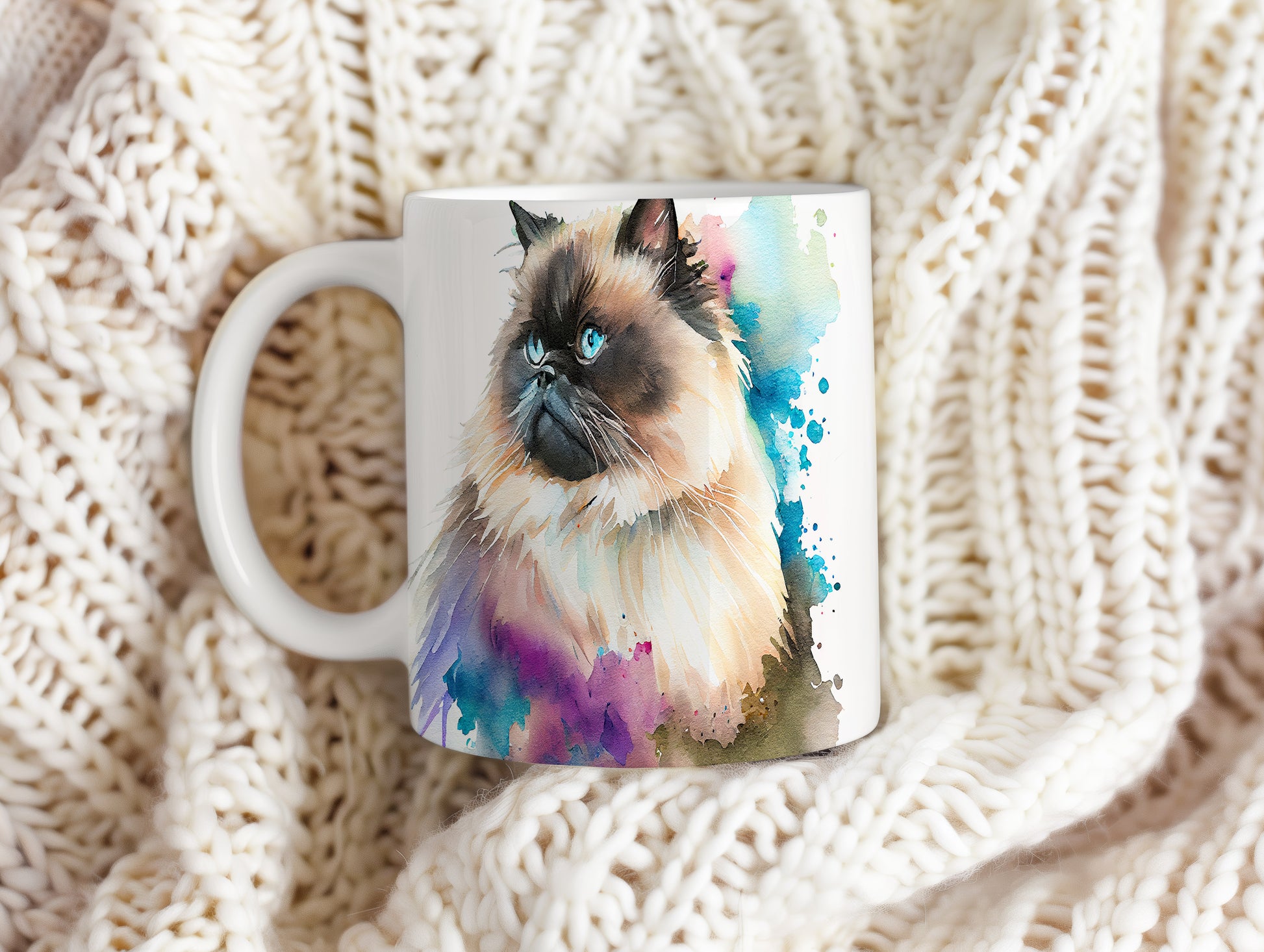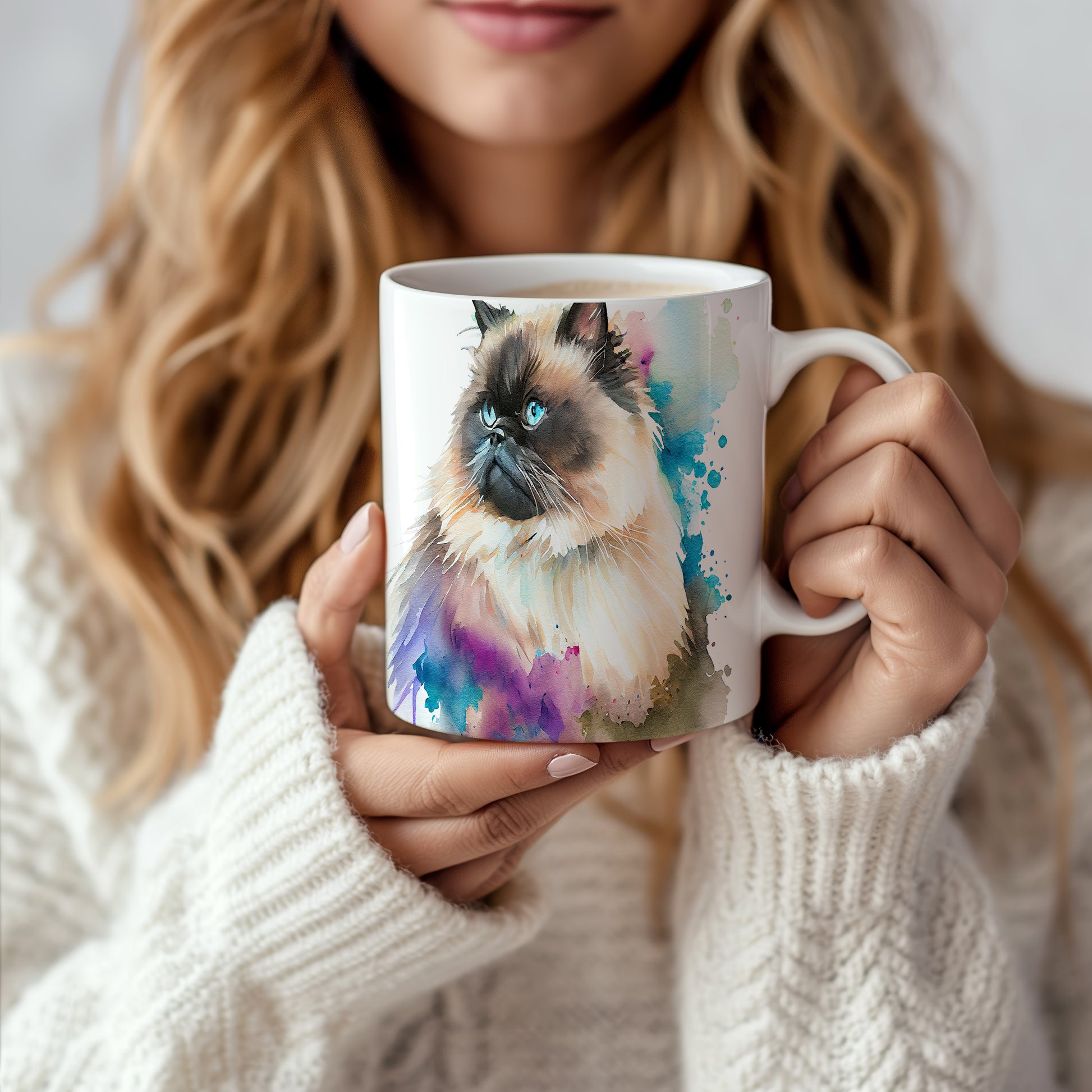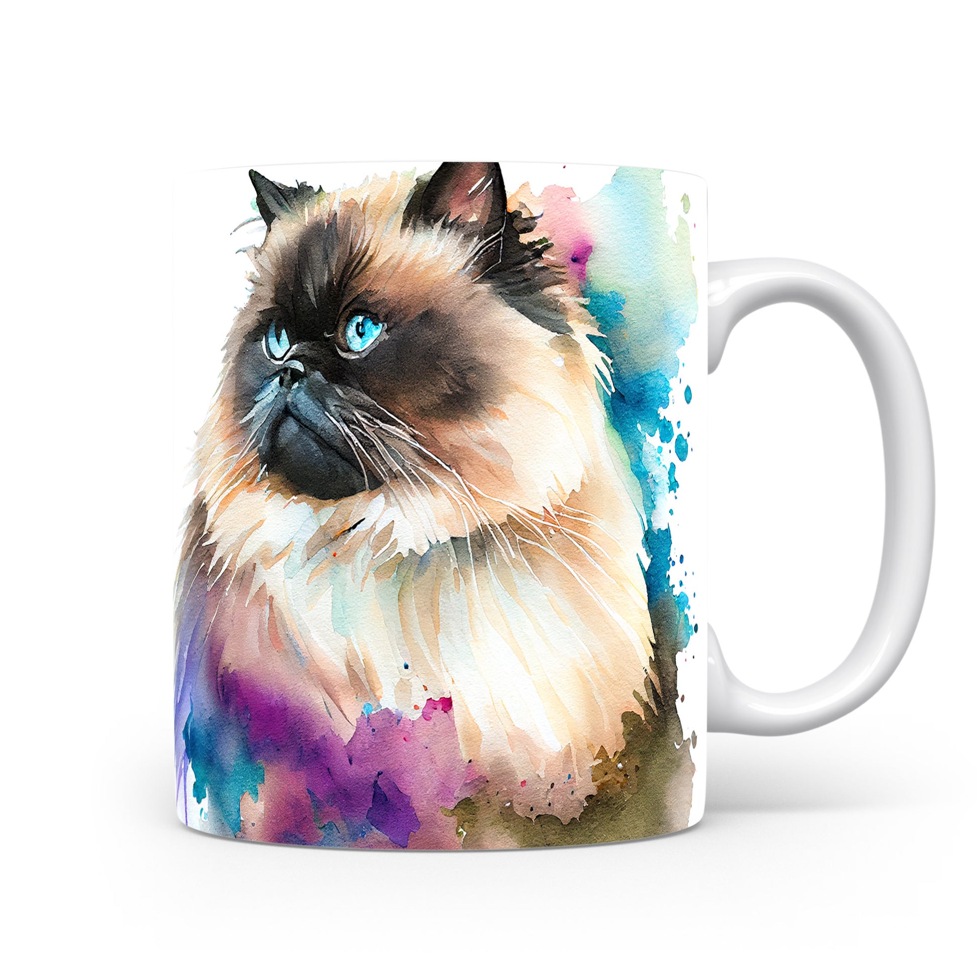 Tento hrnek zobrazuje roztomilou kočku s modrýma očima a barevnými akvarelovými skvrnami. Je ideální pro milovníky koček a skvělým dárkem pro přátele či rodinu. Materiál: keramika. Objem: 330 ml. Vhodné do myčky i mikrovlnky. Užívejte si svůj oblíbený nápoj s nádechem umění.