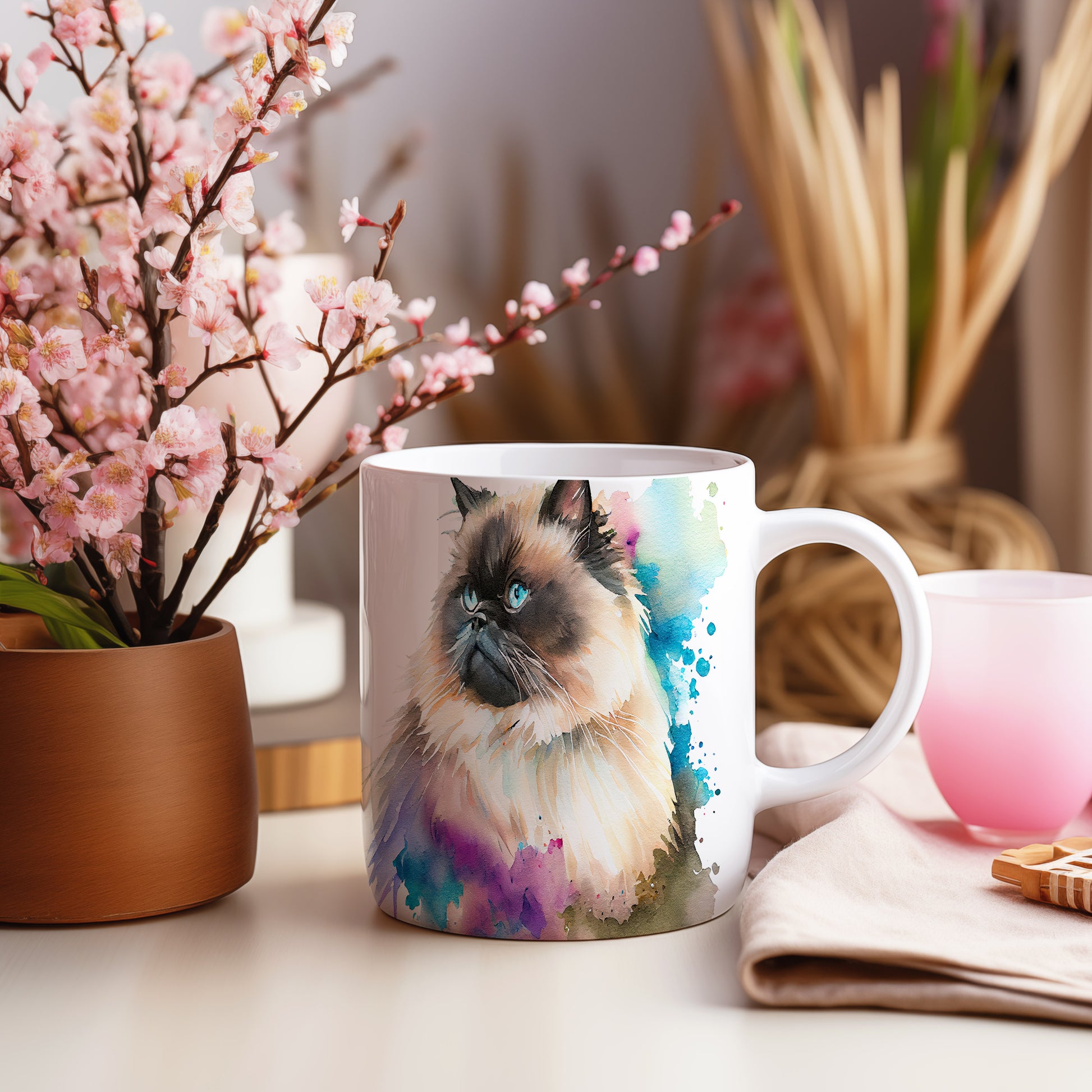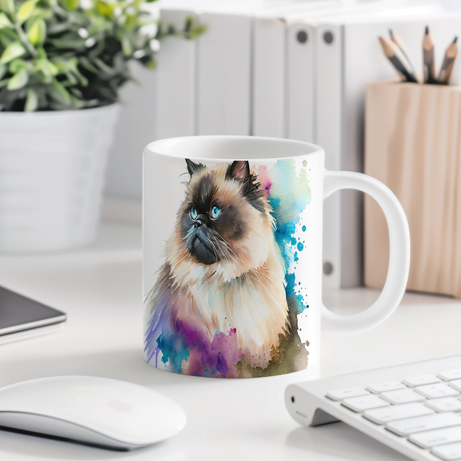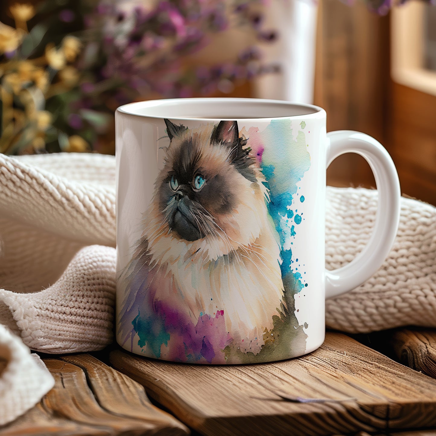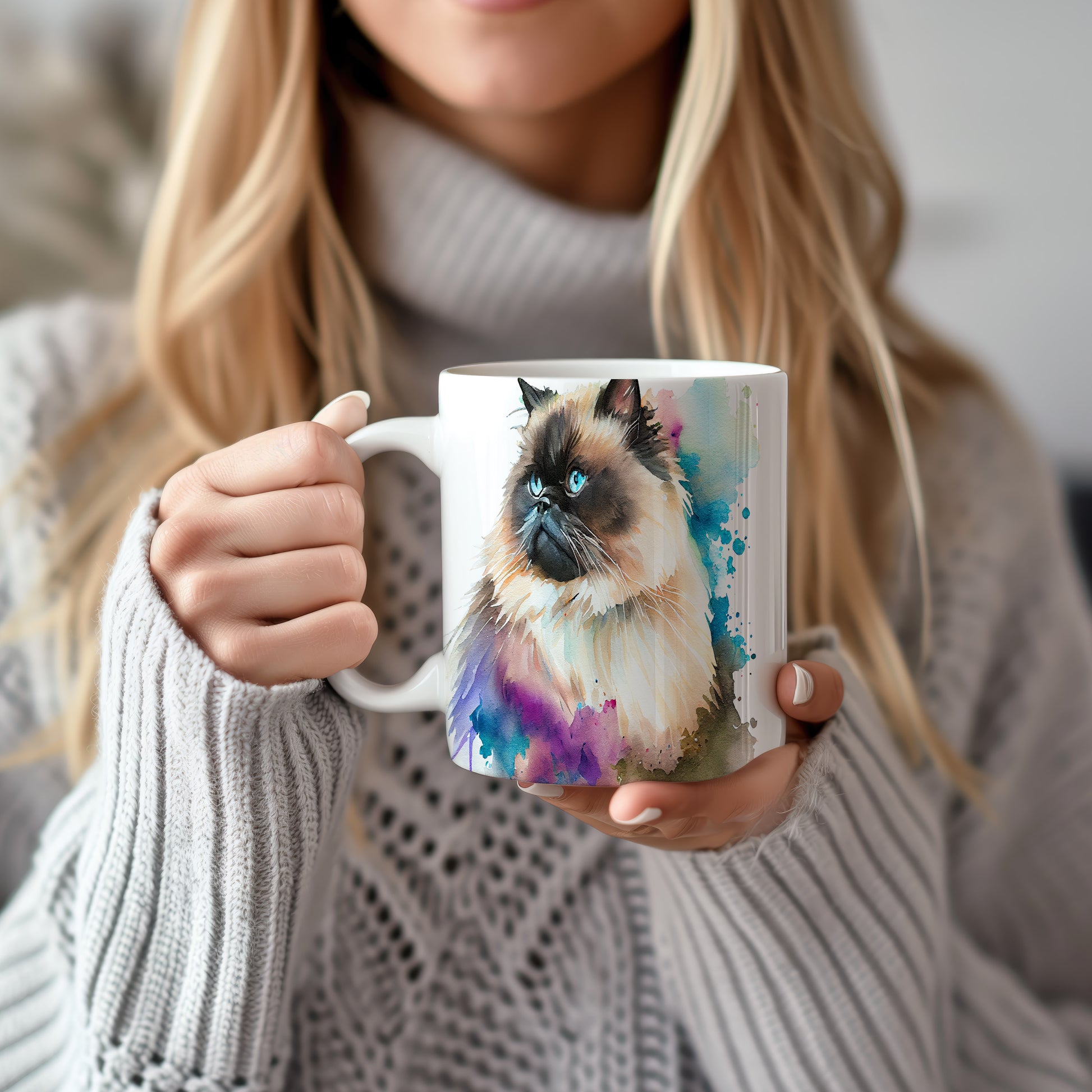 Tento hrnek zobrazuje roztomilou kočku s modrýma očima a barevnými akvarelovými skvrnami. Je ideální pro milovníky koček a skvělým dárkem pro přátele či rodinu. Materiál: keramika. Objem: 330 ml. Vhodné do myčky i mikrovlnky. Užívejte si svůj oblíbený nápoj s nádechem umění.