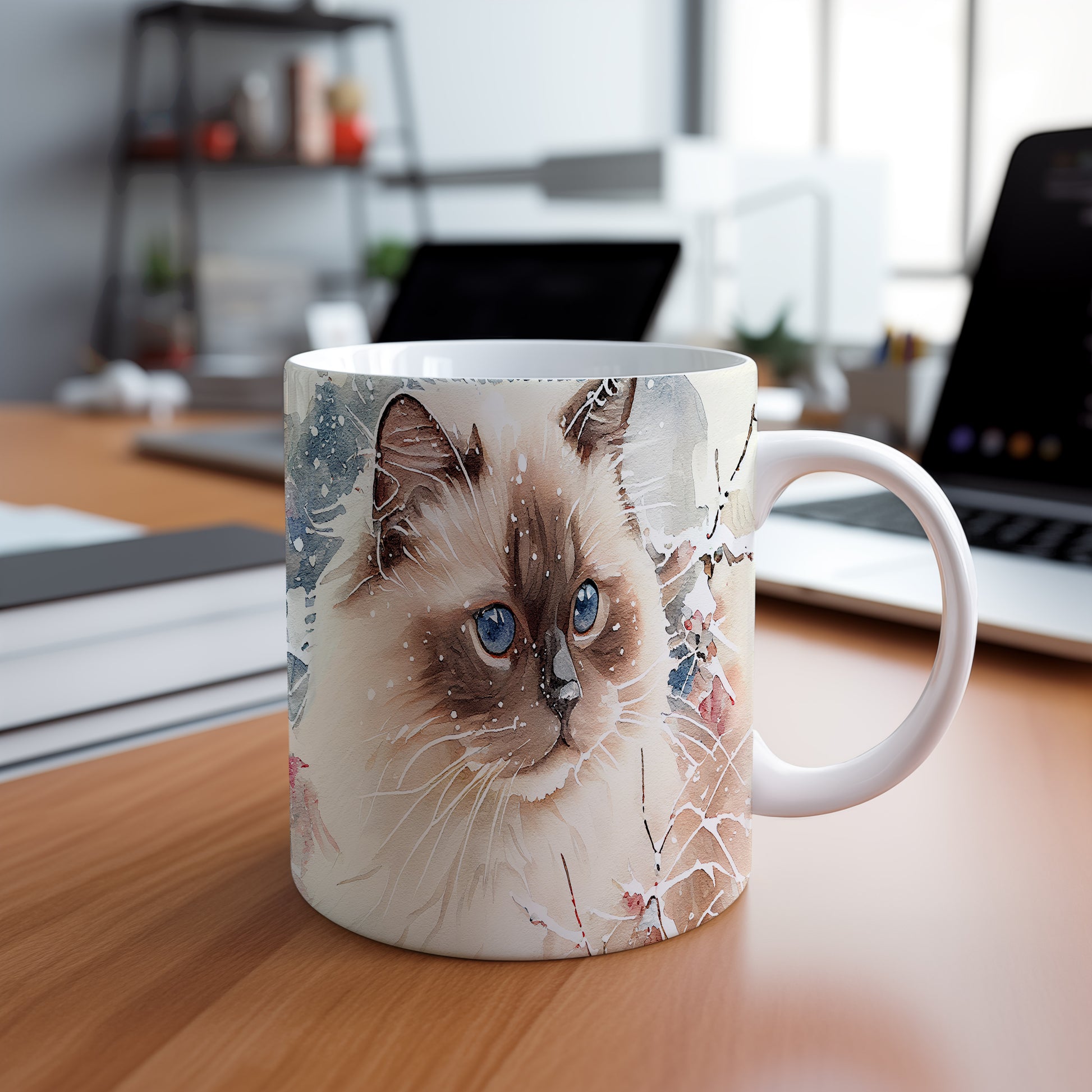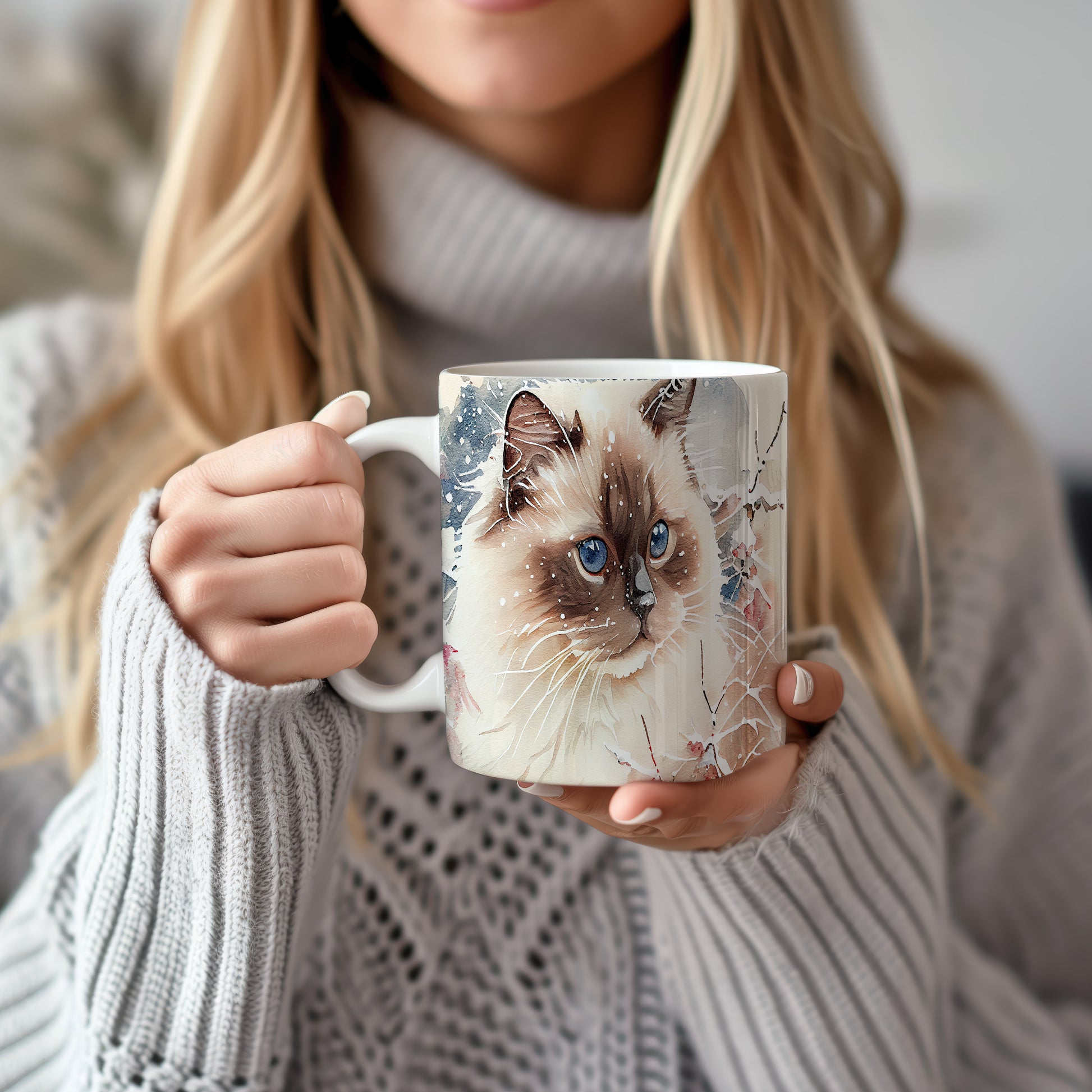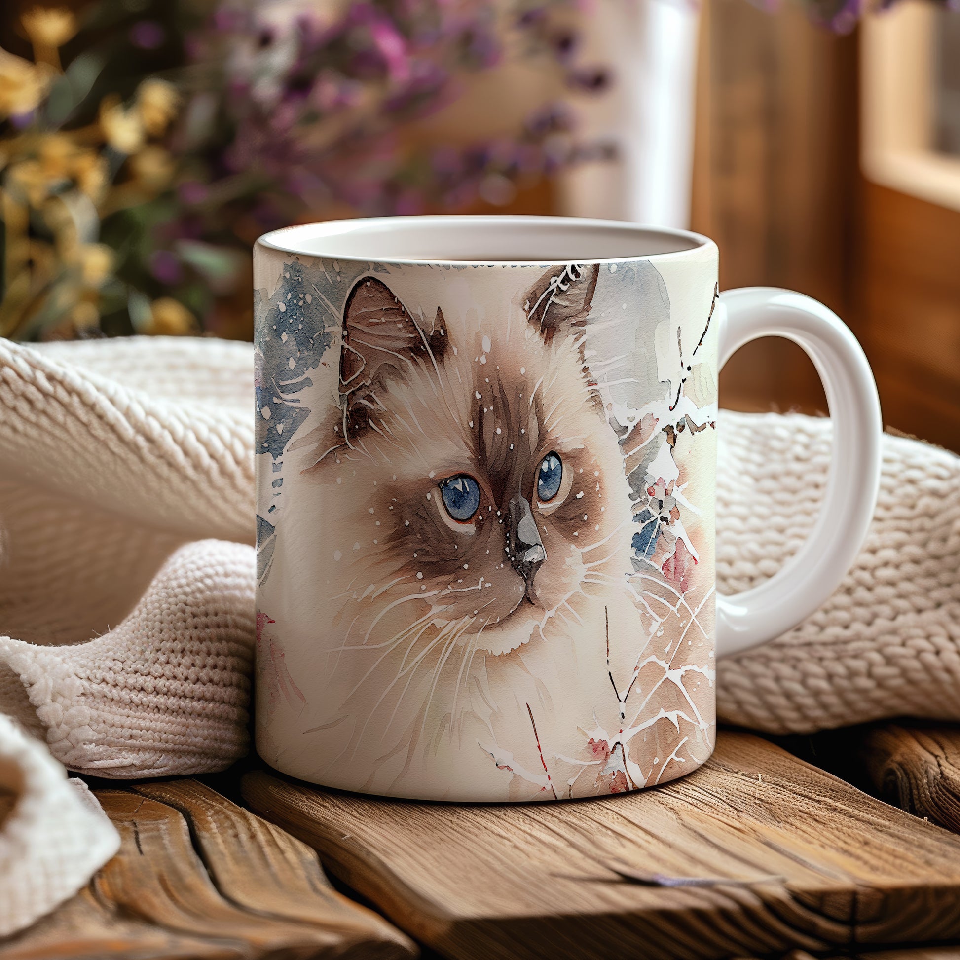 Elegantní hrnek s motivem kočky s modrýma očima v akvarelovém stylu. Tento hrnek je ideální pro milovníky koček a skvělým dárkem pro přátele nebo rodinu. Materiál: keramika. Objem: 330 ml. Vhodné do myčky i mikrovlnky. Užívejte si svůj oblíbený nápoj s osobitým nádechem.