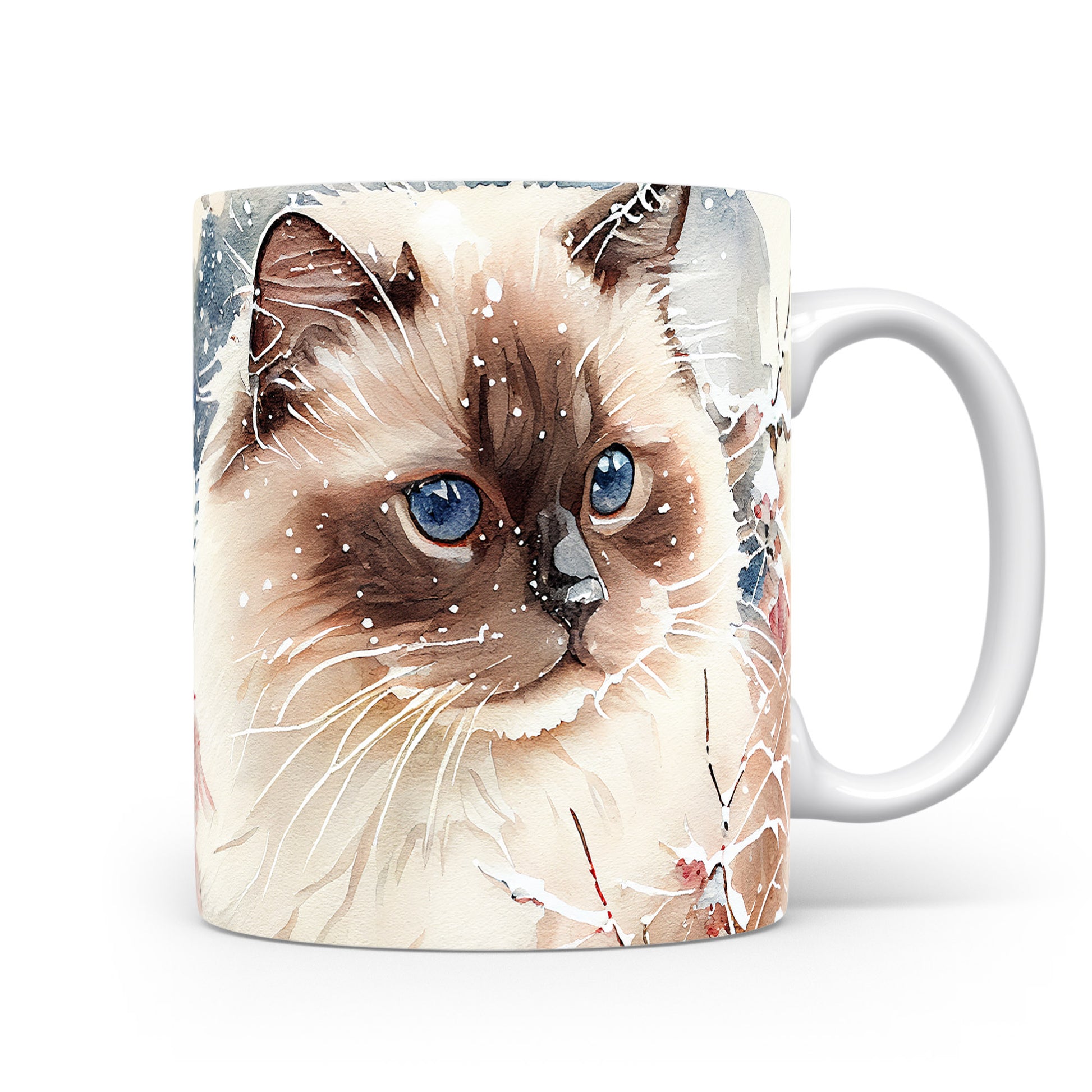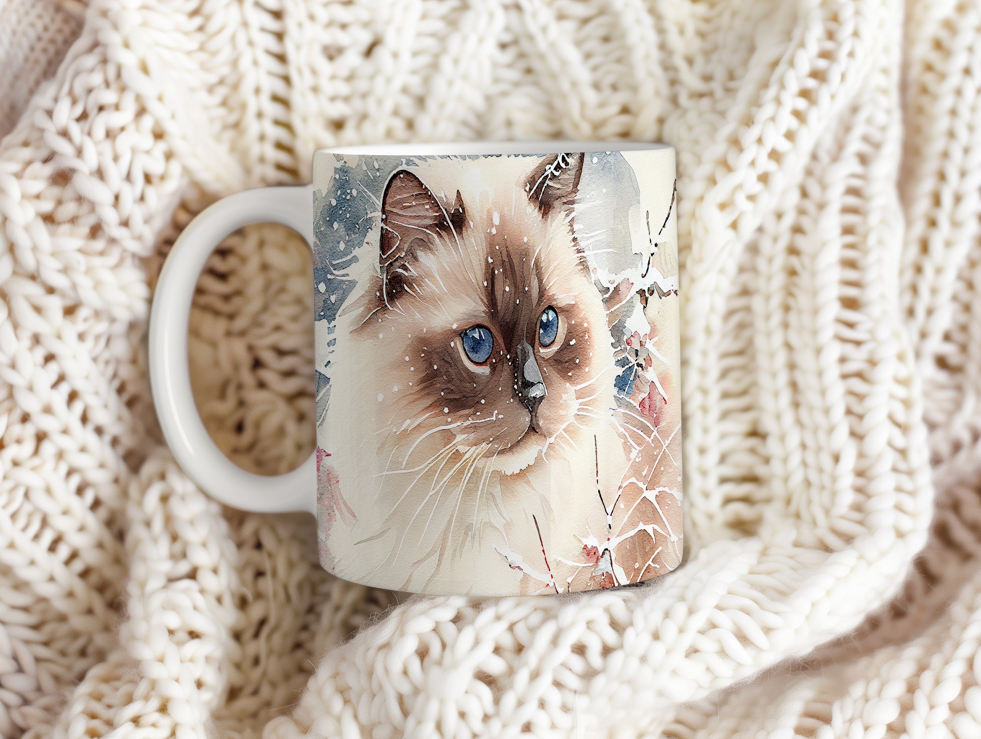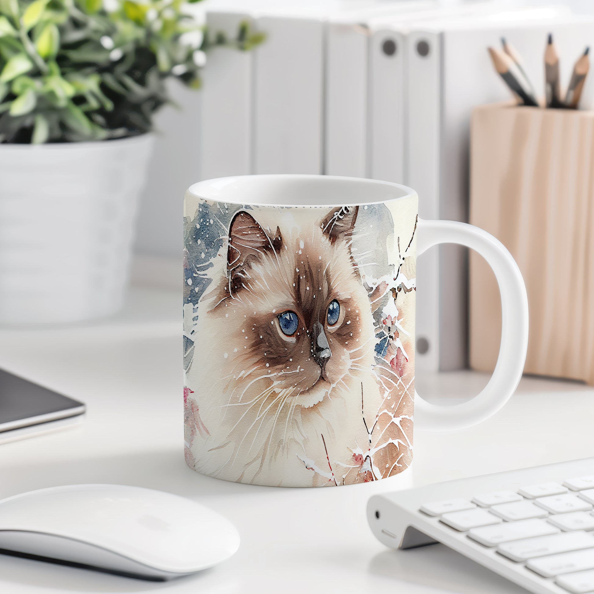 Elegantní hrnek s motivem kočky s modrýma očima v akvarelovém stylu. Tento hrnek je ideální pro milovníky koček a skvělým dárkem pro přátele nebo rodinu. Materiál: keramika. Objem: 330 ml. Vhodné do myčky i mikrovlnky. Užívejte si svůj oblíbený nápoj s osobitým nádechem.