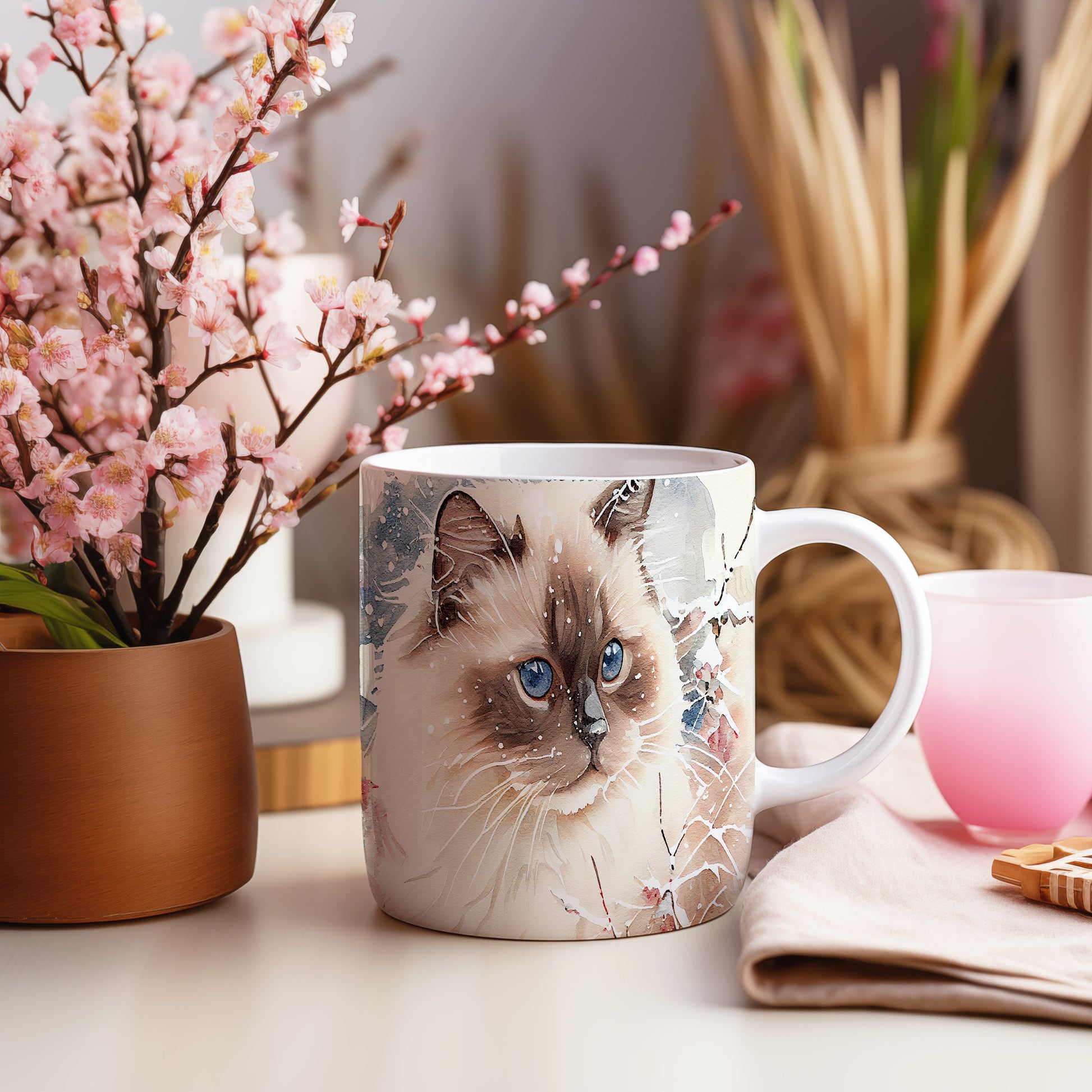 Hrnek s roztomilou kočkou v akvarelovém stylu – modrýma očima