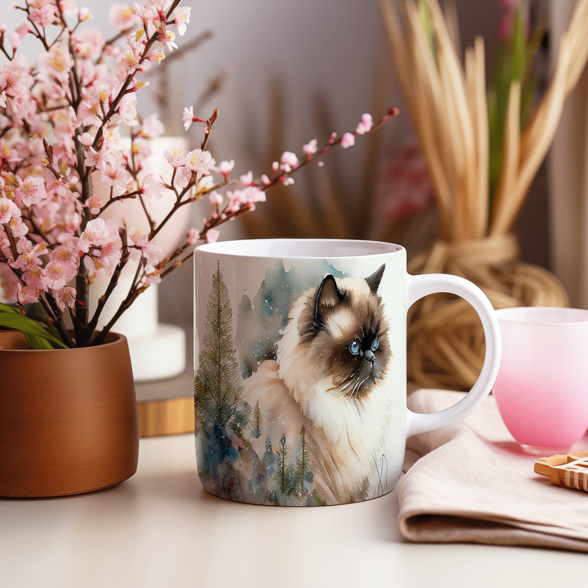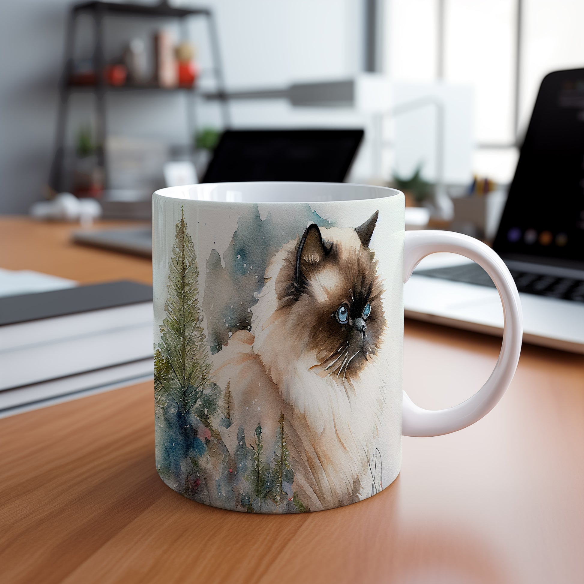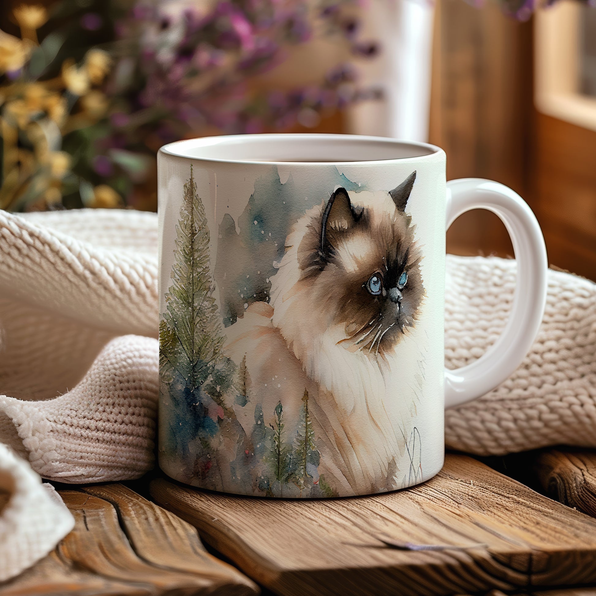 Tento keramický hrnek zobrazuje roztomilou kočku v přírodě, obklopenou stromy a jemným sněžením. Je ideální pro milovníky koček a skvělým dárkem pro každého, kdo si rád vychutnává svůj oblíbený nápoj. Materiál: keramika. Objem: 330 ml. Vhodné do myčky i mikrovlnky. Používání tohoto hrnku přináší útulný zážitek při každém doušku.