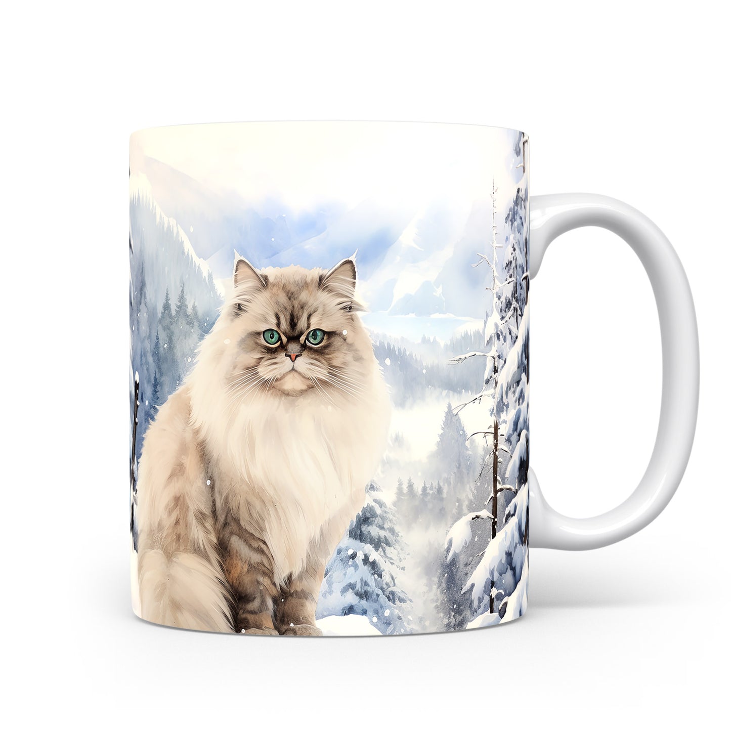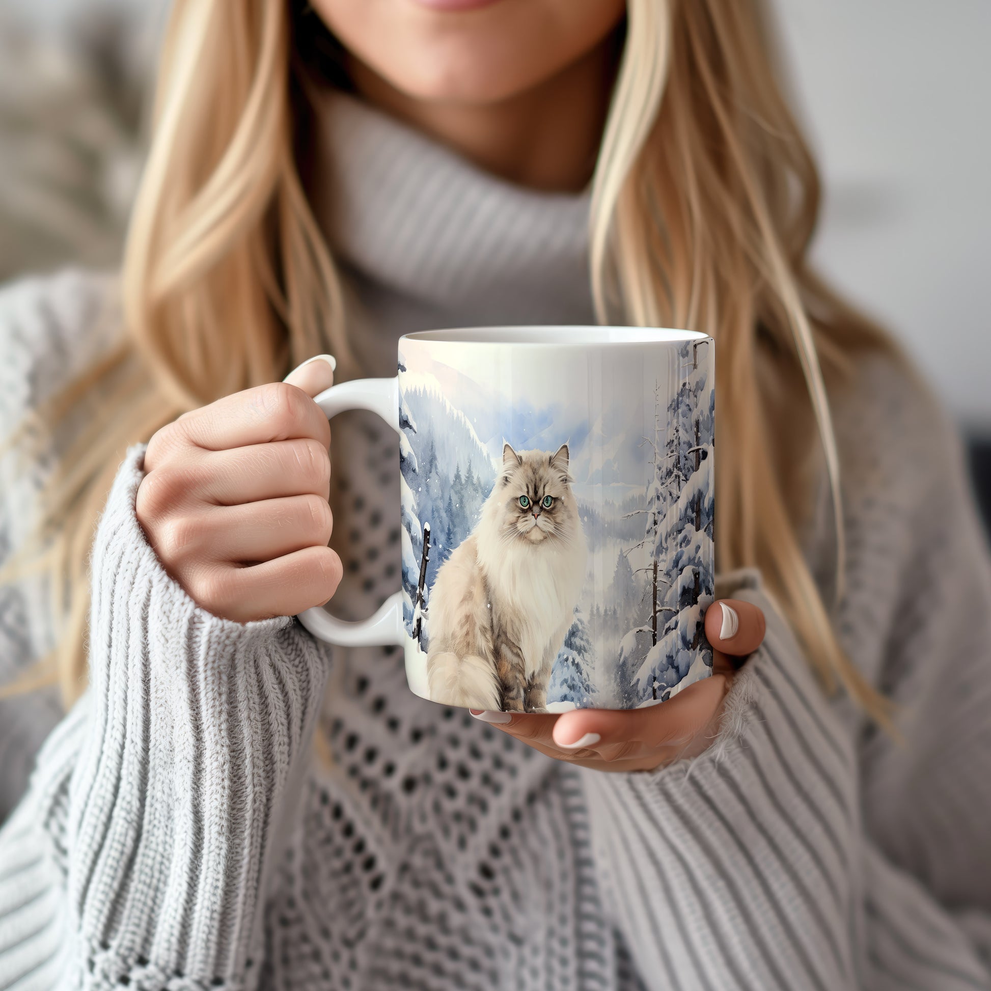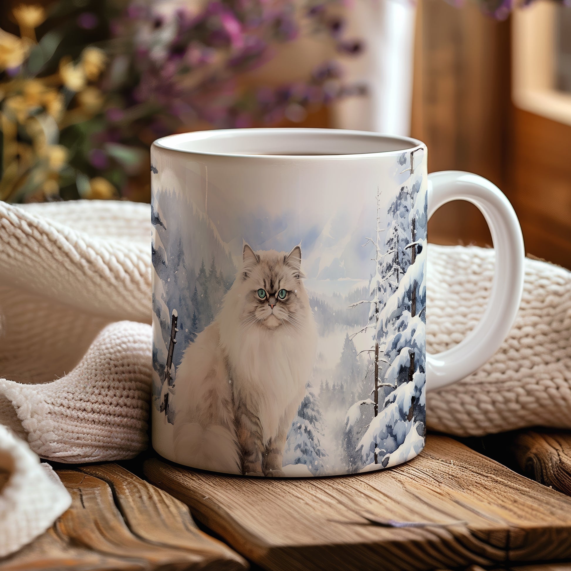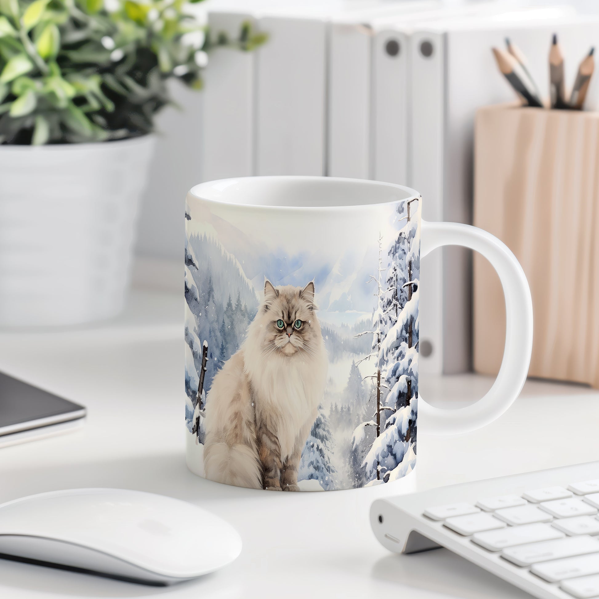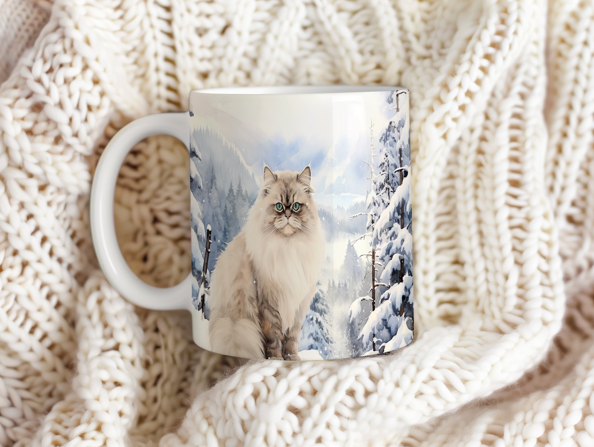 Hrnek s roztomilou kočkou v zasněžené krajině
