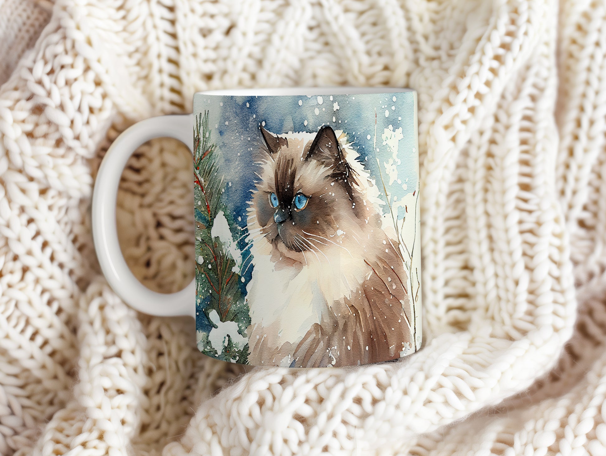 Hrnek s roztomilou kočkou v zimní scenérii – modrýma očima