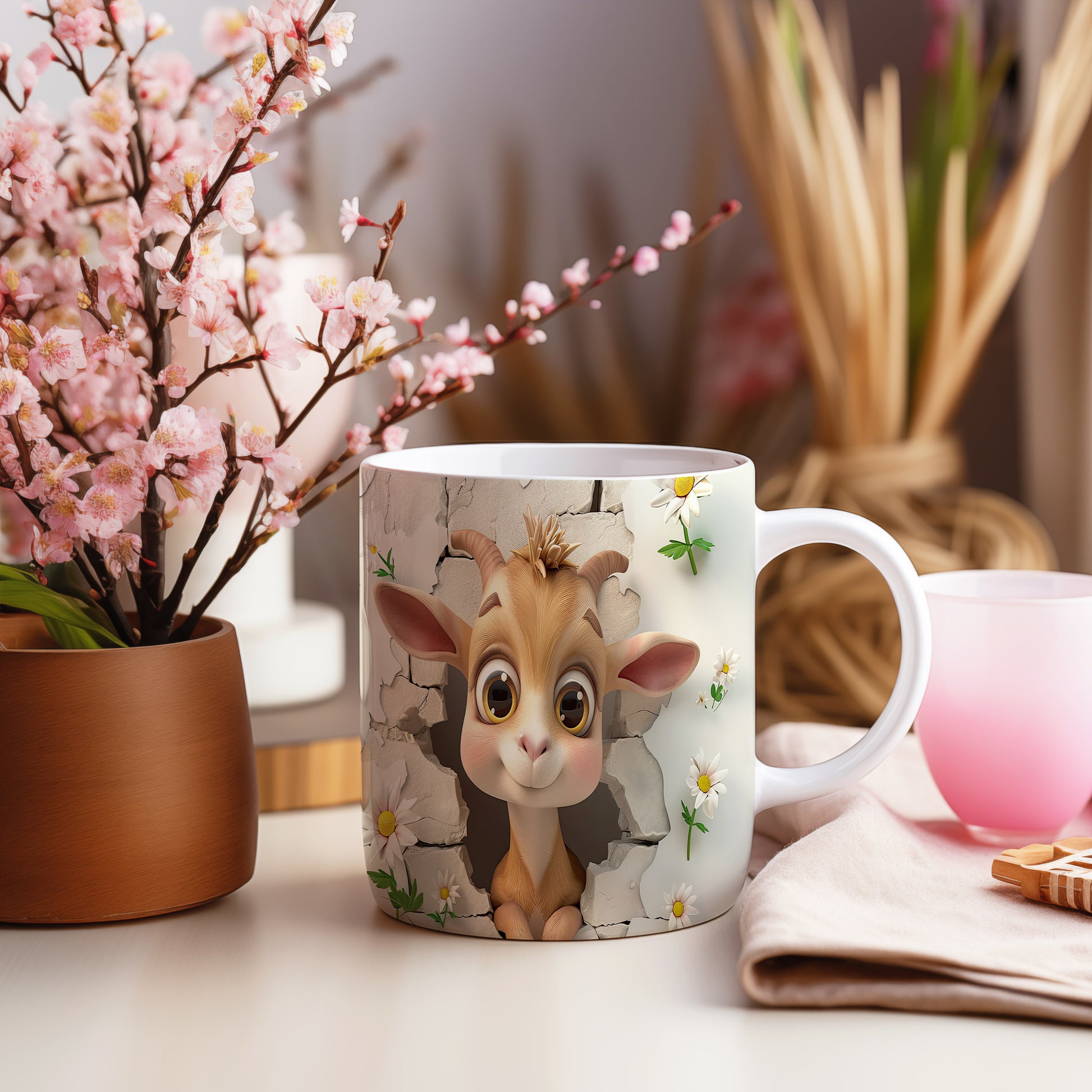 Hrnek s roztomilou kozičkou a květinami