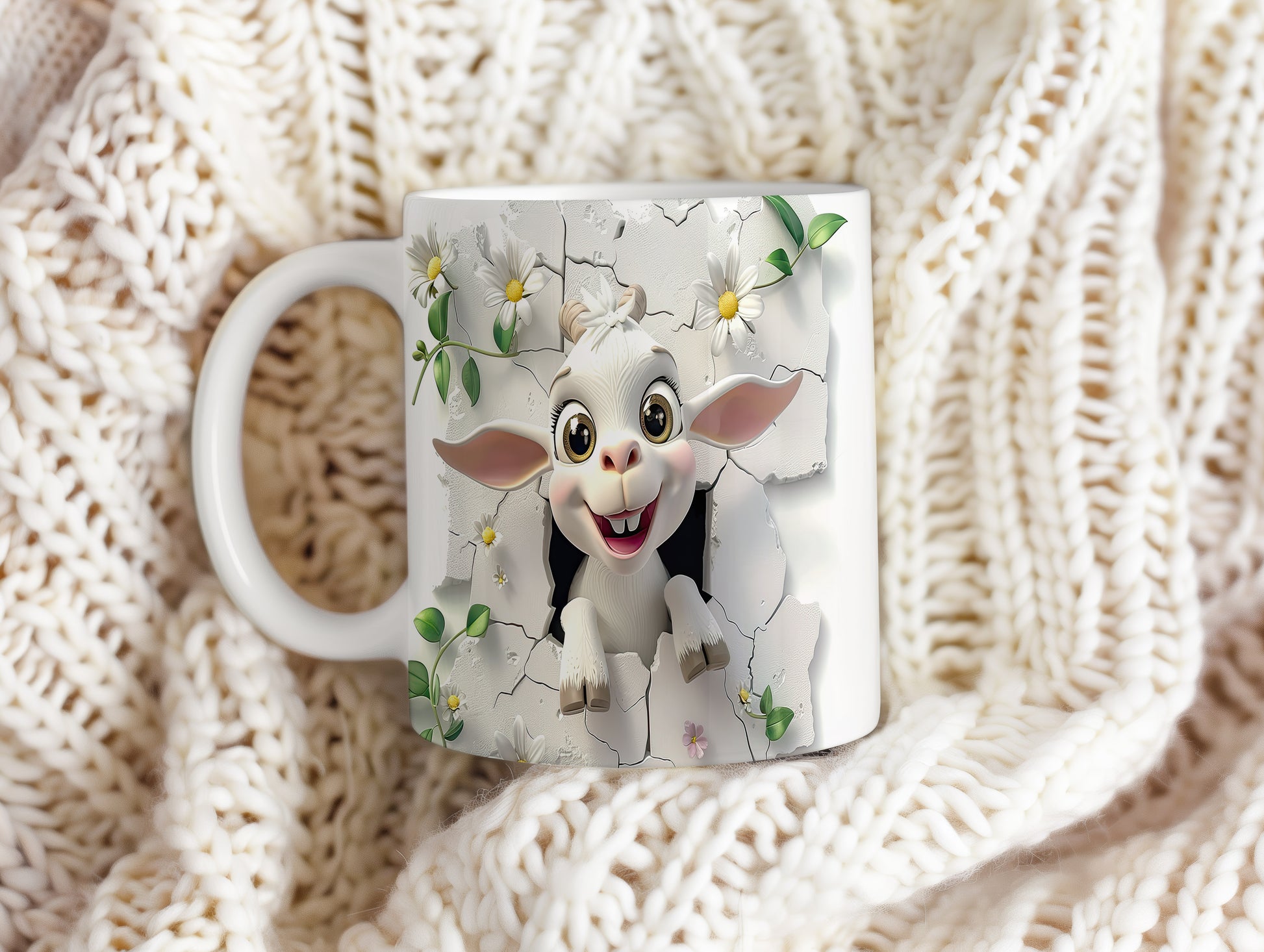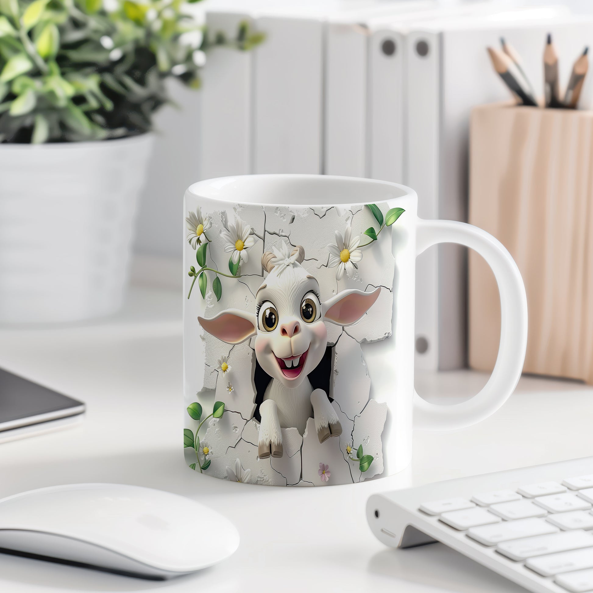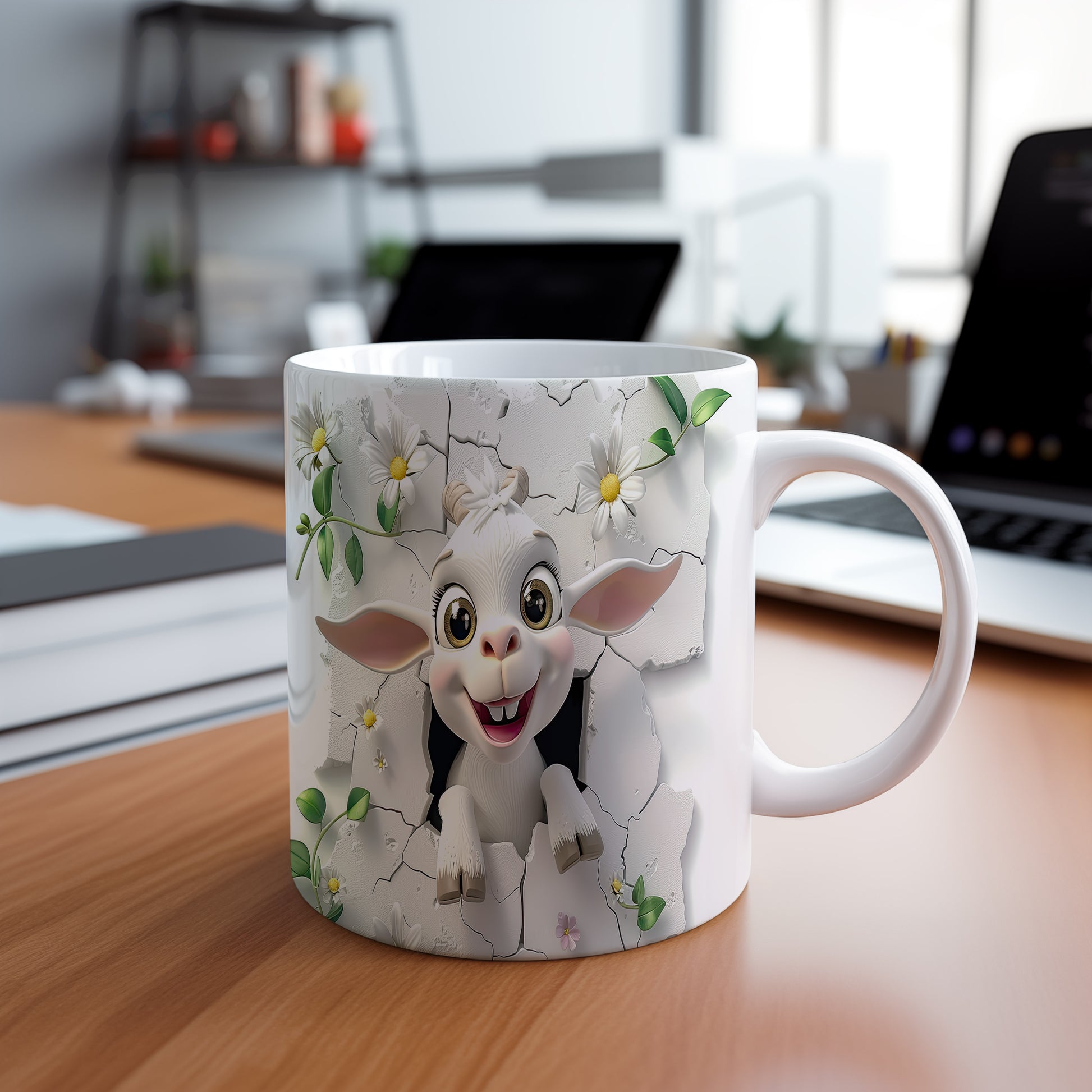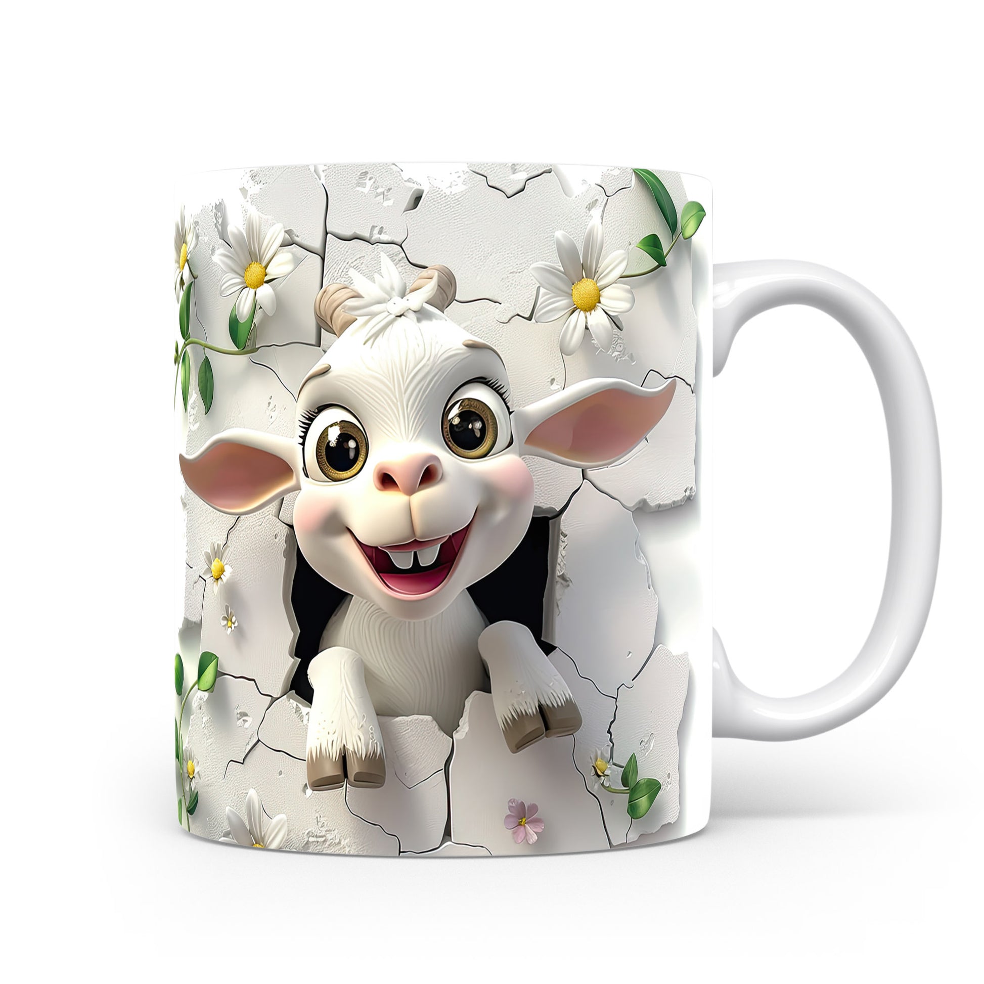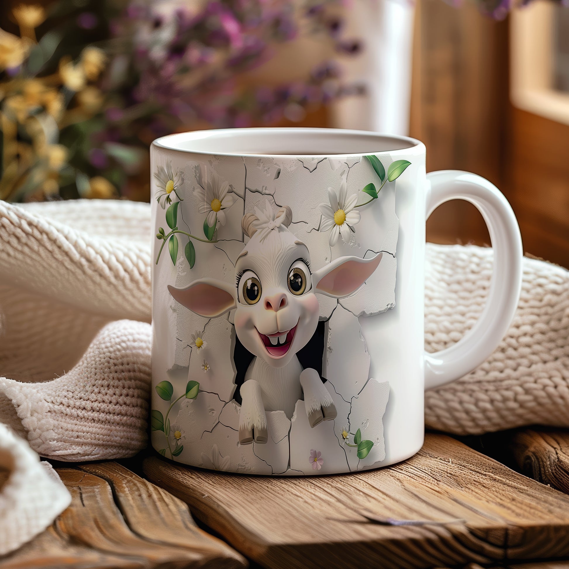Tento hrnek zobrazuje veselou kozu s úsměvem, která vypadá, jako by se vynořovala z pozadí. Je ideální pro milovníky zvířat a skvělým dárkem pro přátele nebo rodinu. Materiál: keramika. Objem: 330 ml. Vhodné do myčky i mikrovlnky. Používání tohoto hrnku přináší radost a oživí každé ráno.