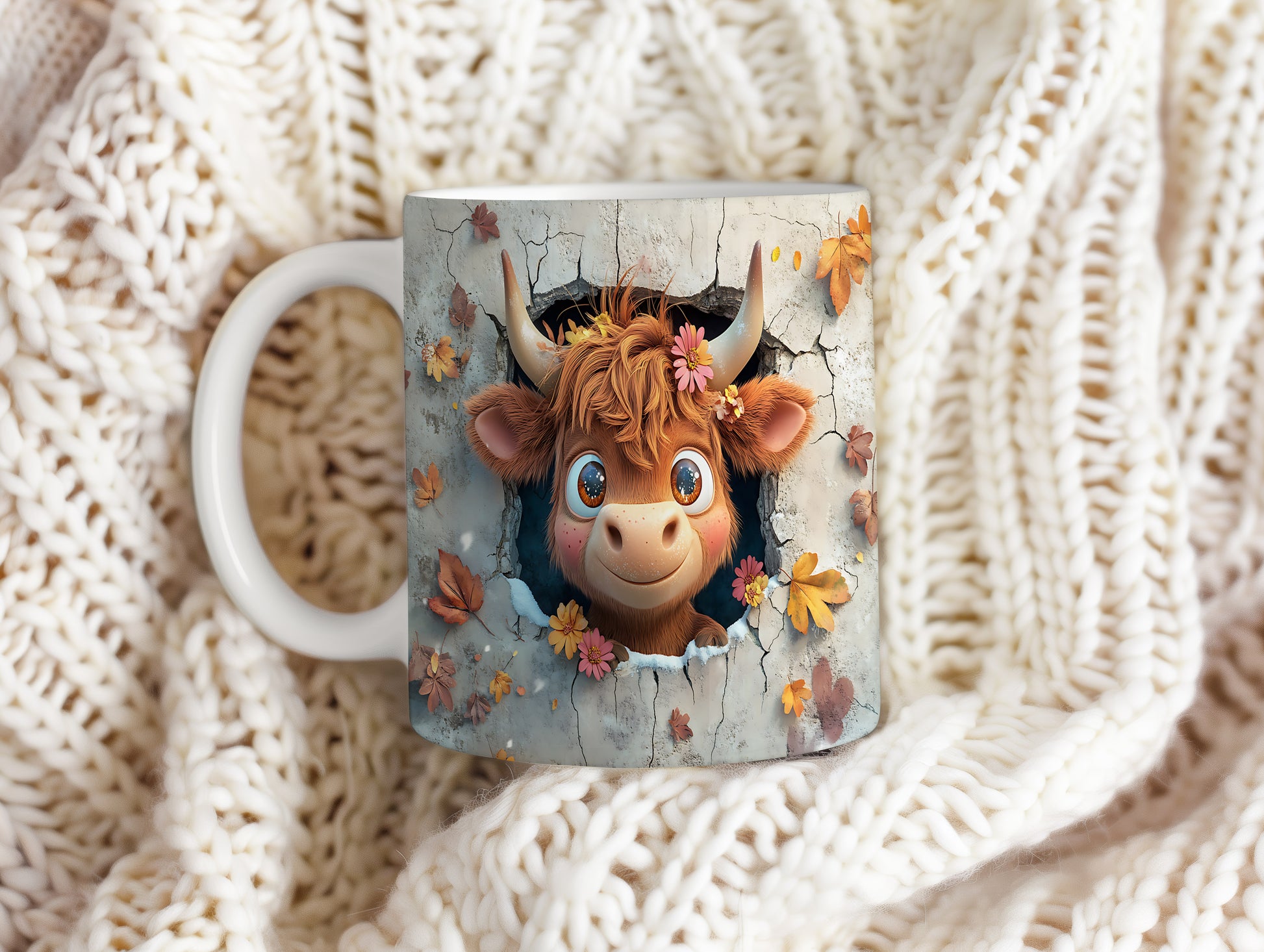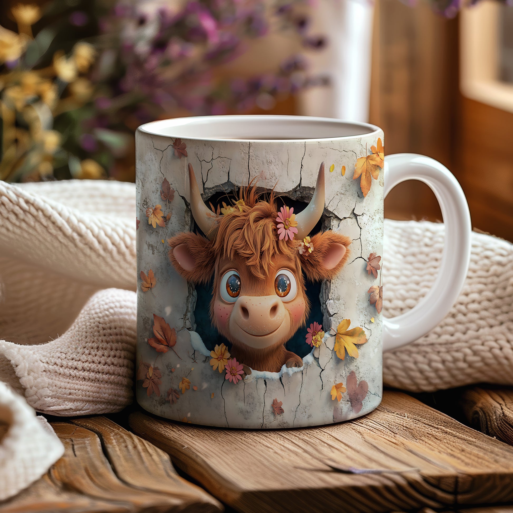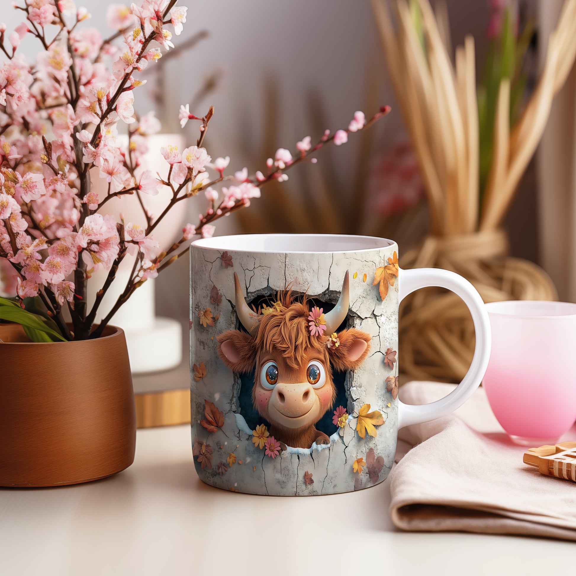 Hrnek s roztomilou krávou v květinách