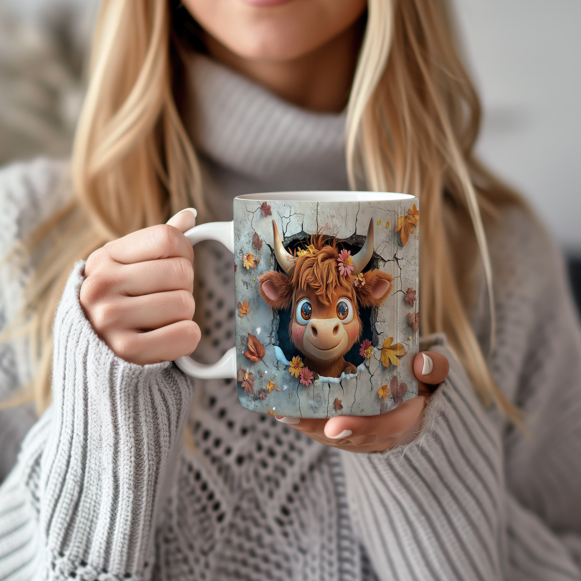 Na hrnku je vyobrazena roztomilá kráva s hnědými vlasy a velkýma očima, která dodává designu veselý nádech. Tento hrnek je ideální pro milovníky zvířat a přírody, skvělý tip na dárek pro přátele nebo rodinu. Materiál: keramika. Objem: 330 ml. Vhodné do myčky i mikrovlnky. Používání tohoto hrnku přináší radost a zábavu při každém doušku.