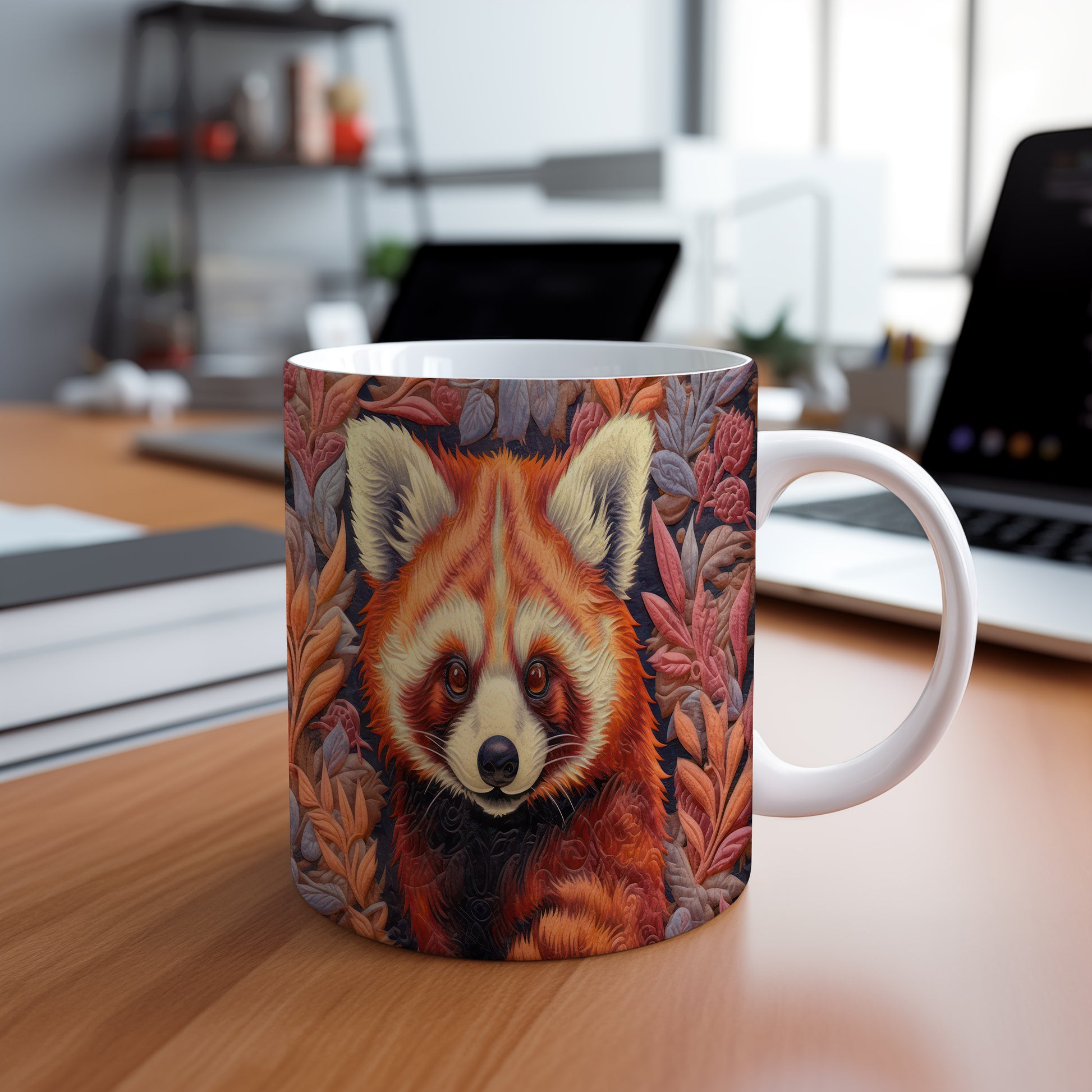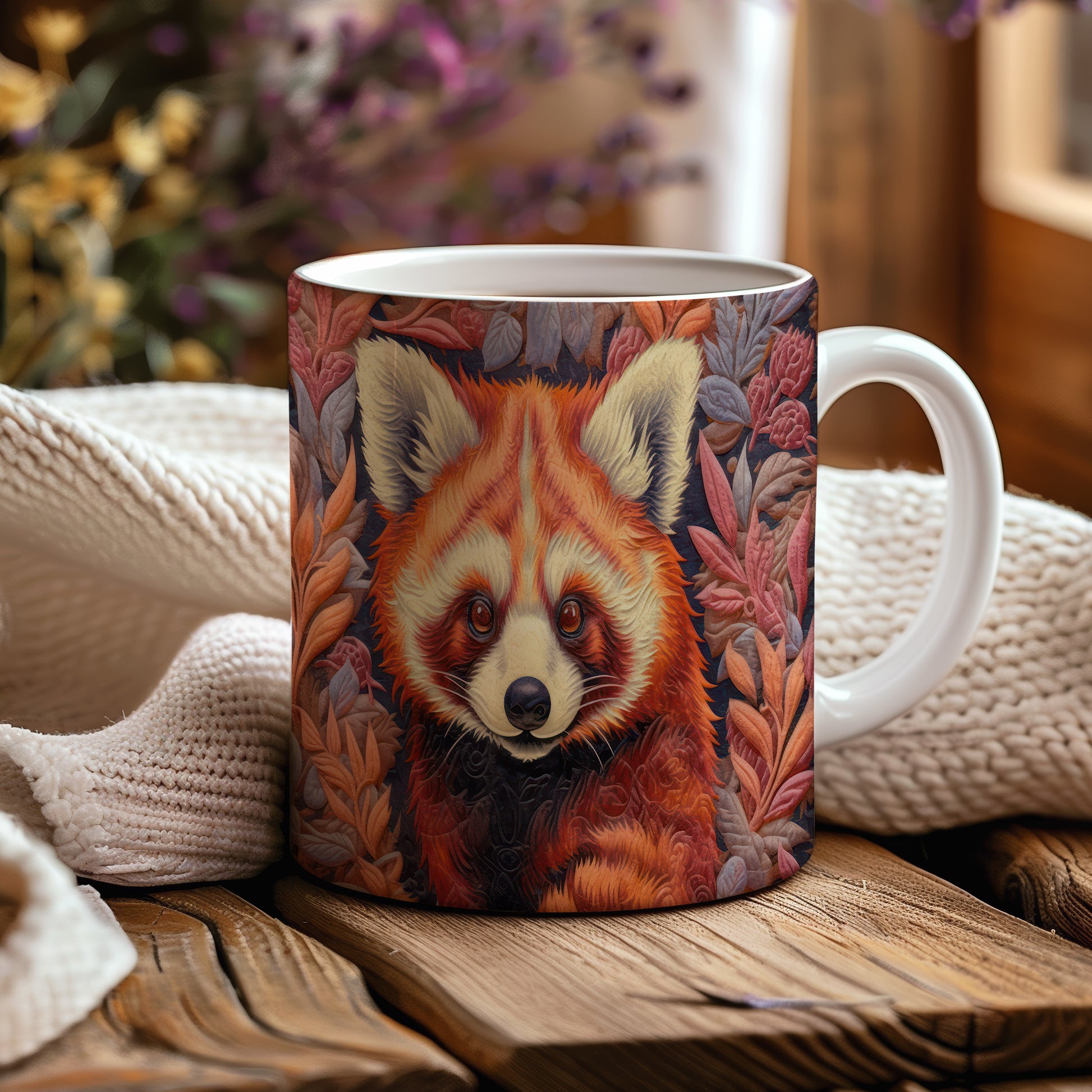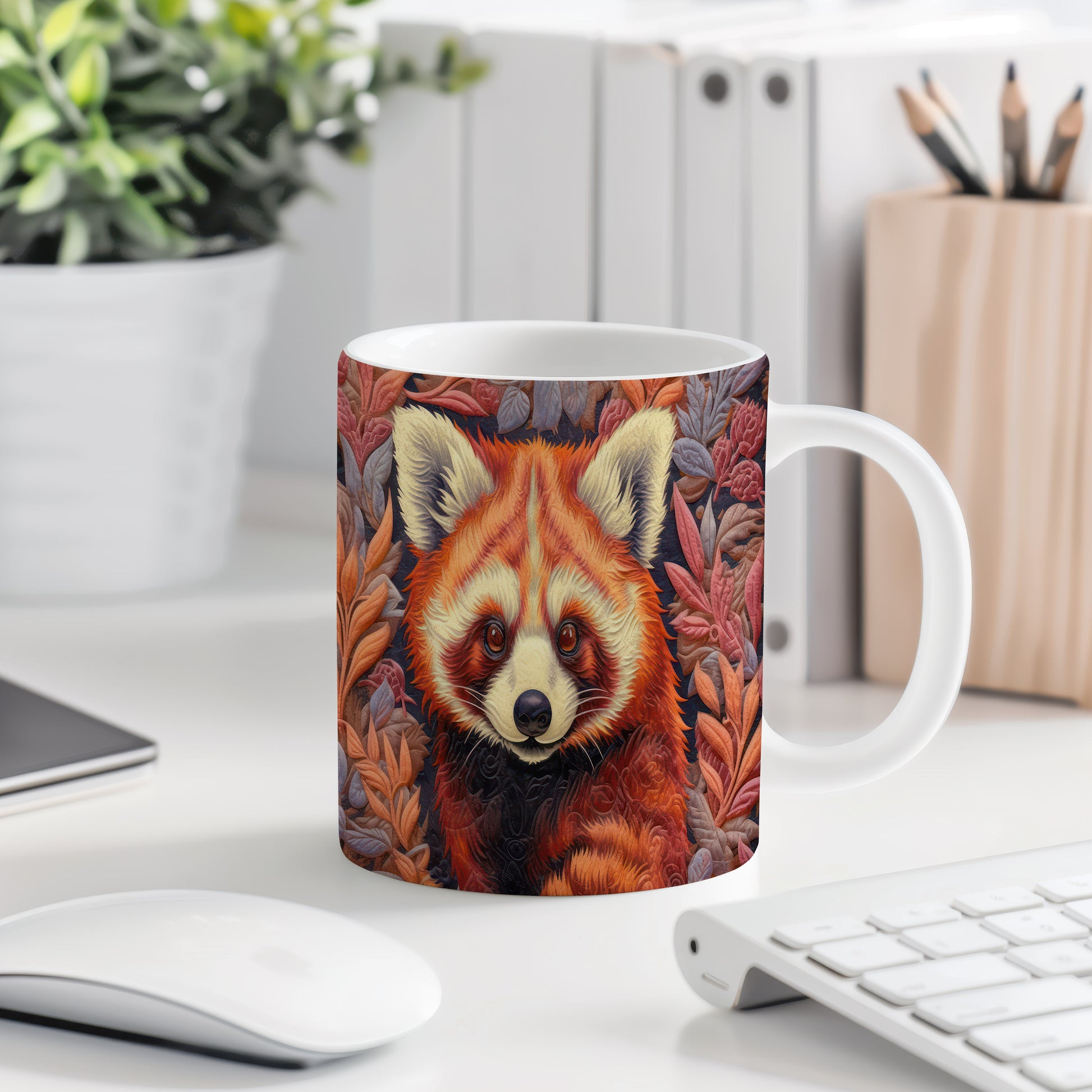 Tento keramický hrnek s motivem roztomilé pandy a barevných listů přináší přírodní kouzlo do každého nápoje. Je ideální pro milovníky zvířat a přírody, skvělý tip na dárek pro přátele nebo rodinu. Materiál: keramika. Objem: 330 ml. Vhodné do myčky i mikrovlnky. Používání tohoto hrnku vám zpříjemní každé sousto a dodá vašim nápojům jedinečný styl.