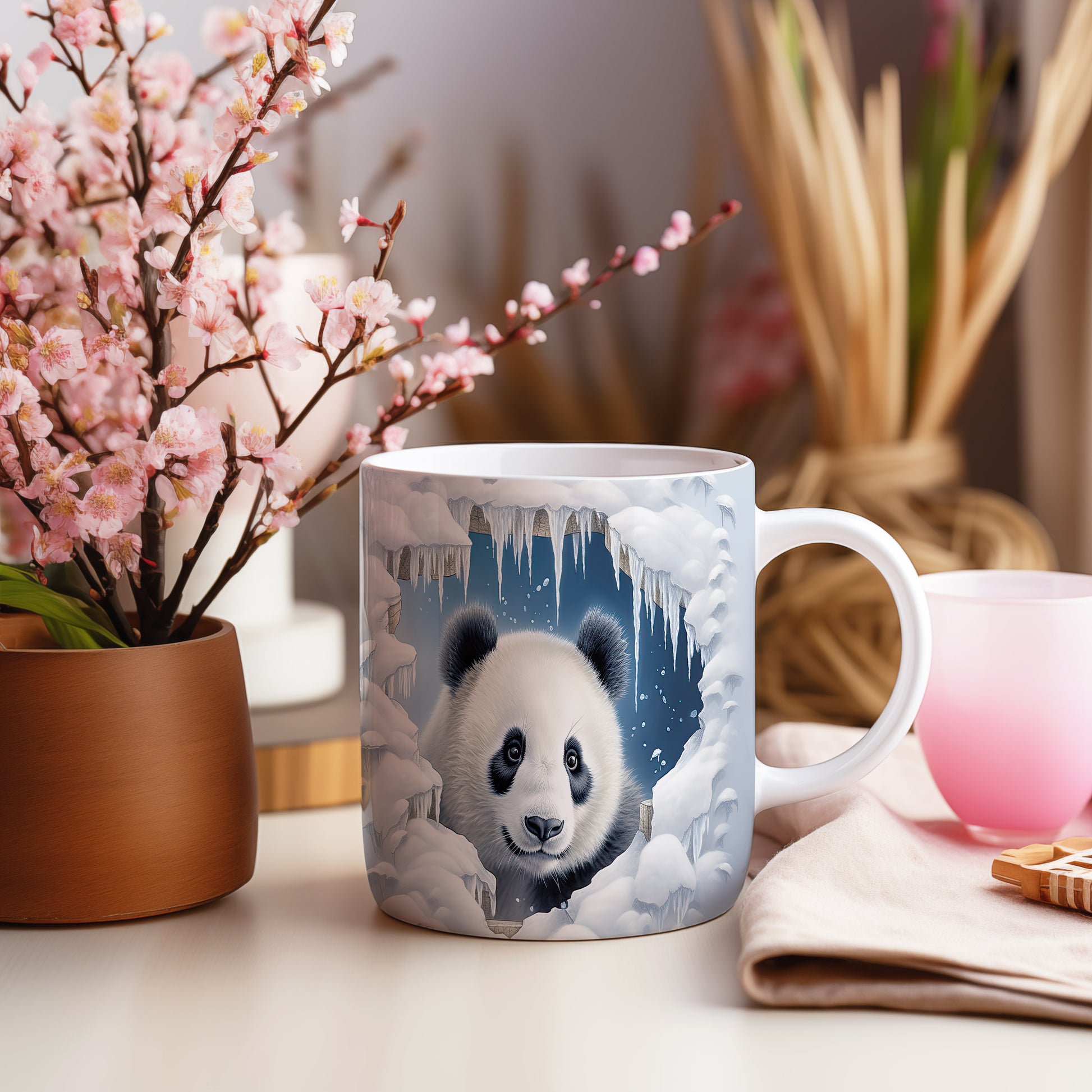 Hrnek s roztomilou pandou ve sněhu