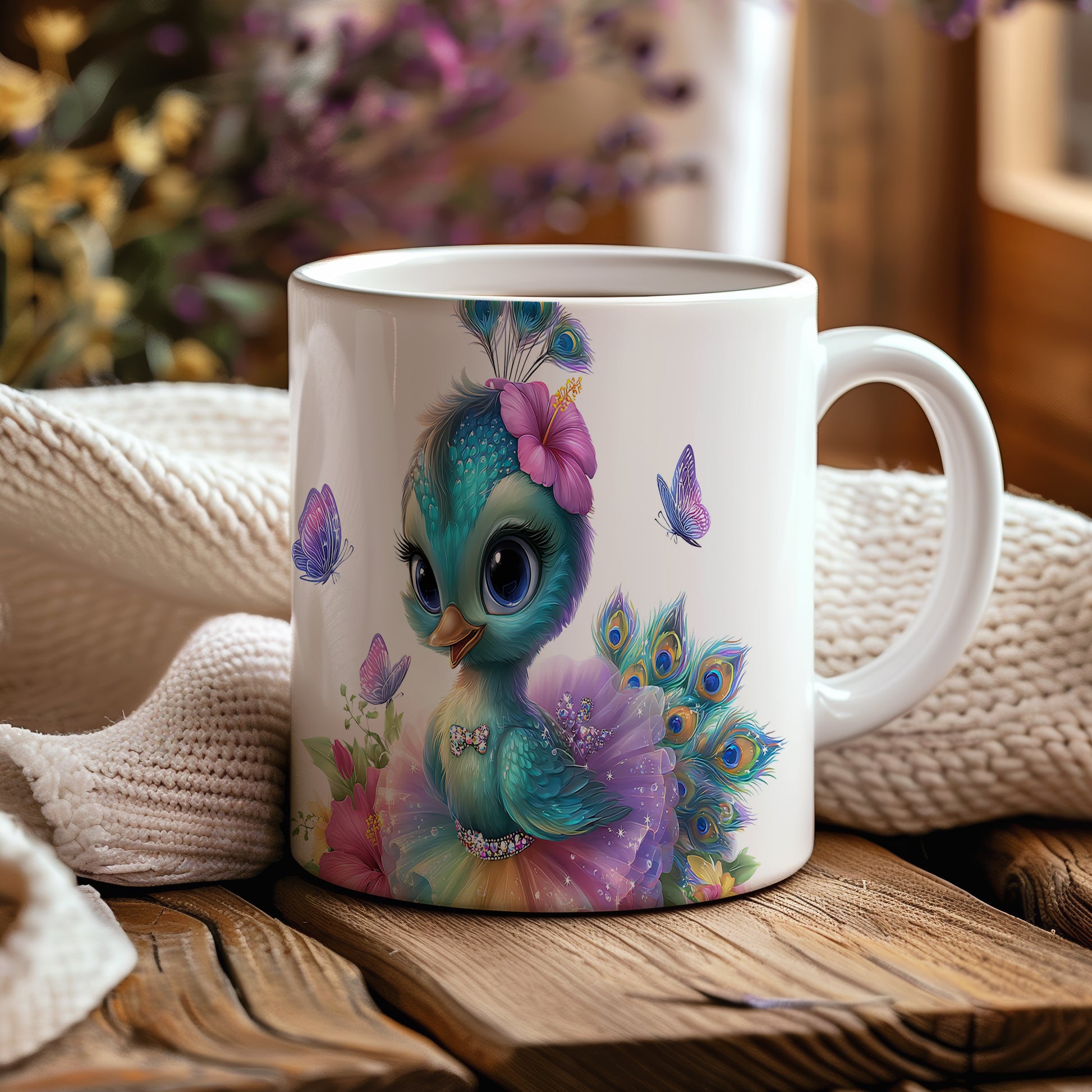 Hrnek s roztomilou pávkou a květinami
