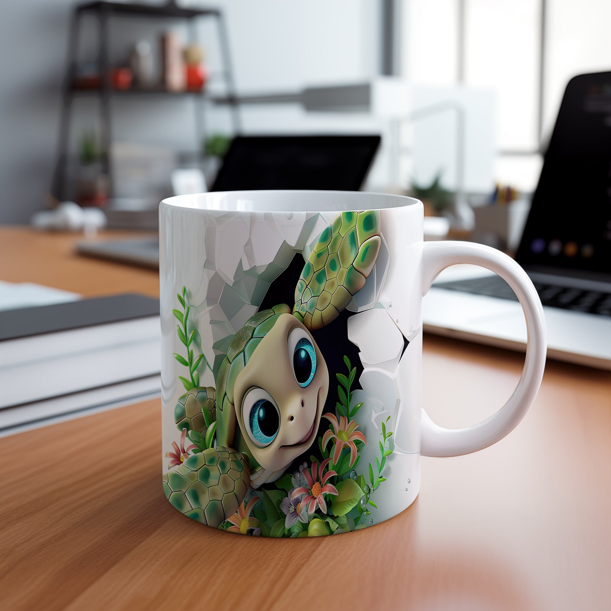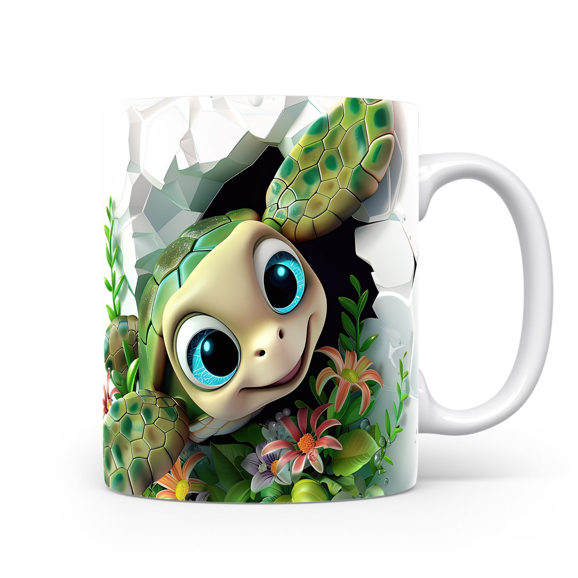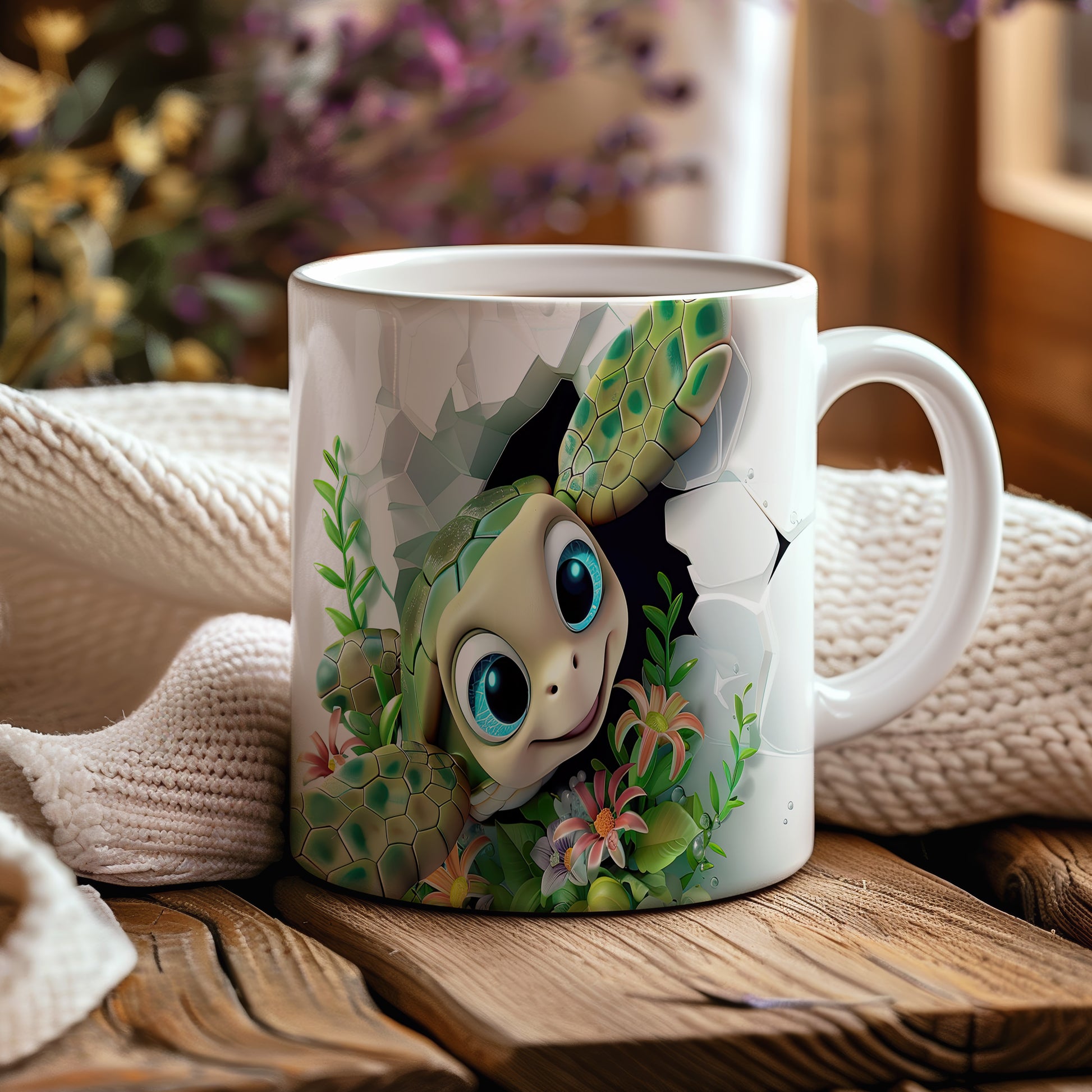 Hrnek s roztomilou želvou a květinami