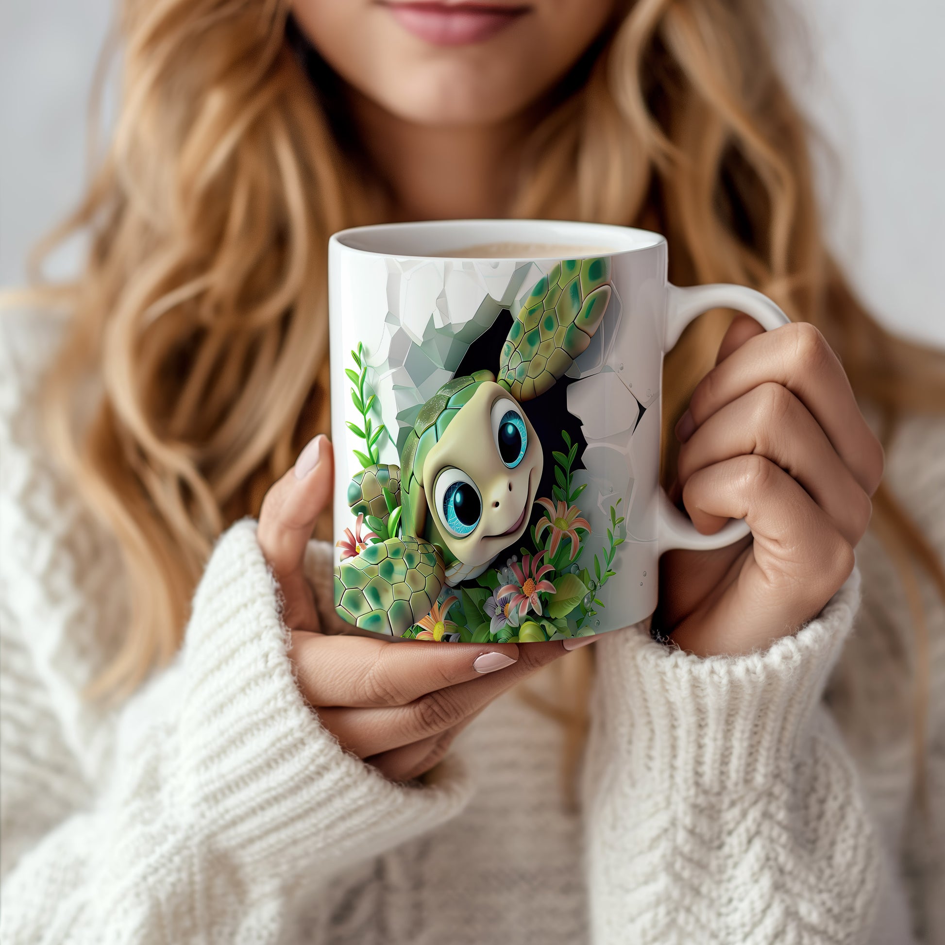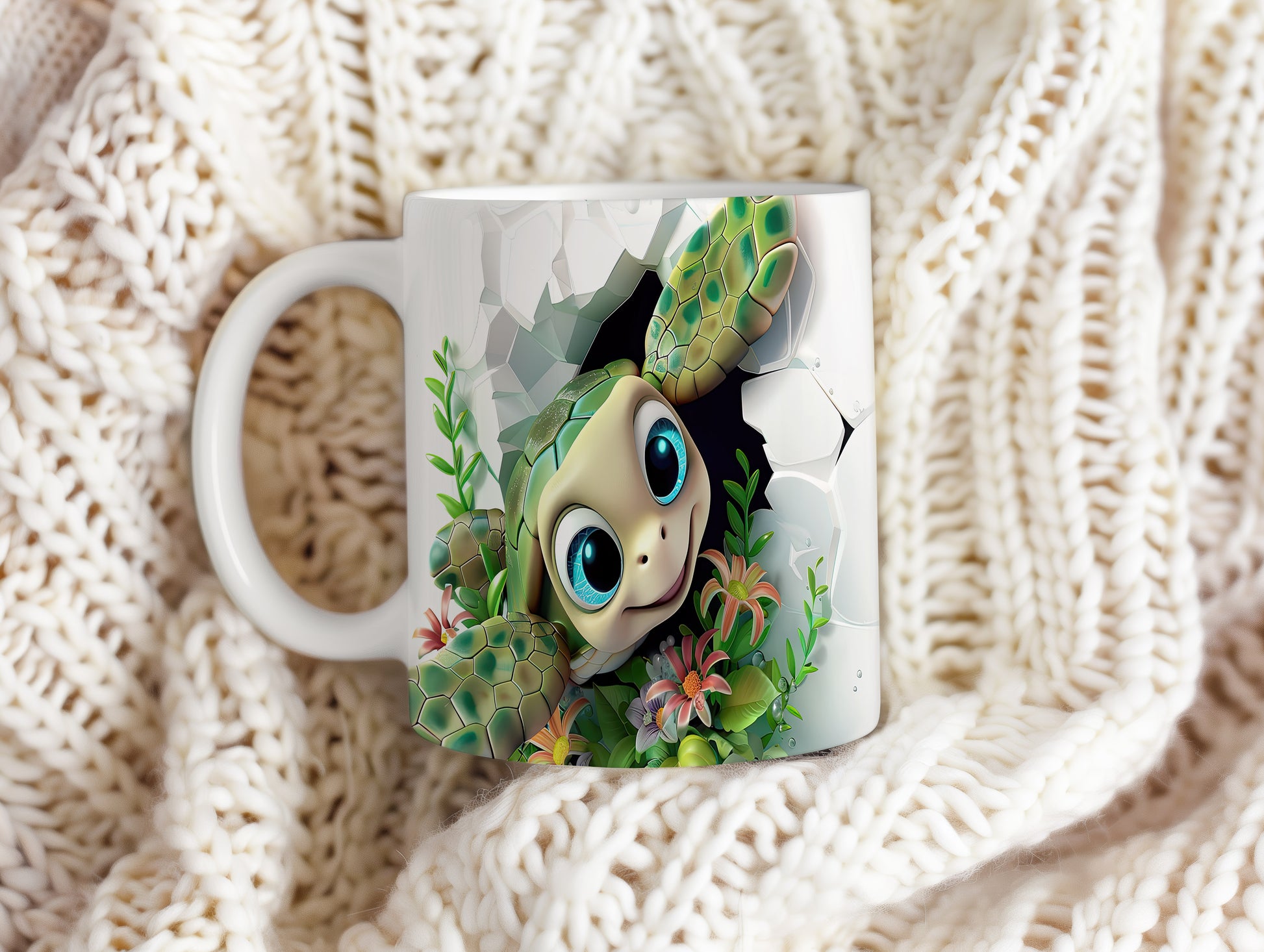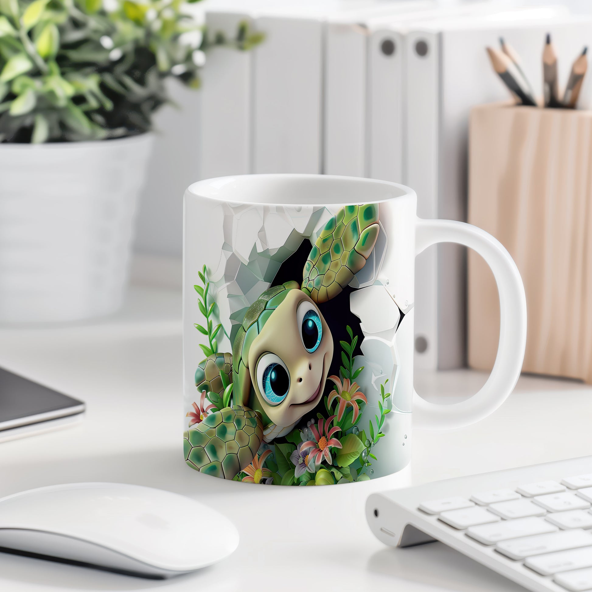 Hrnek s roztomilou želvou a květinami