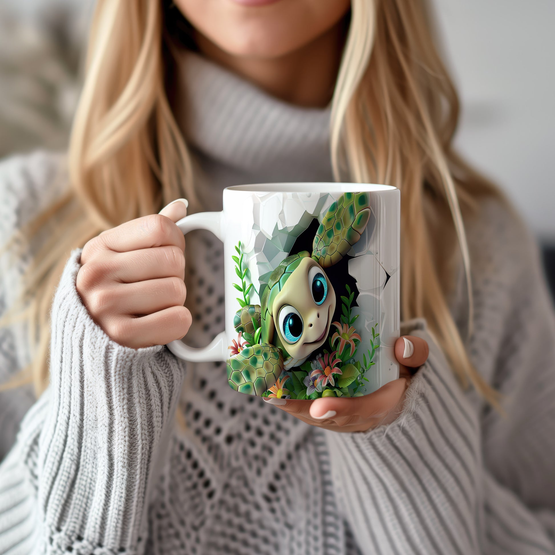 Tento keramický hrnek zobrazuje roztomilou želvu s velkýma očima a květinami, což mu dodává hravý a veselý vzhled. Je ideální pro milovníky přírody a zvířat, skvělý tip na dárek pro děti i dospělé. Materiál: keramika. Objem: 330 ml. Vhodné do myčky i mikrovlnky. Používání tohoto hrnku přináší radost a oživuje každodenní pití.