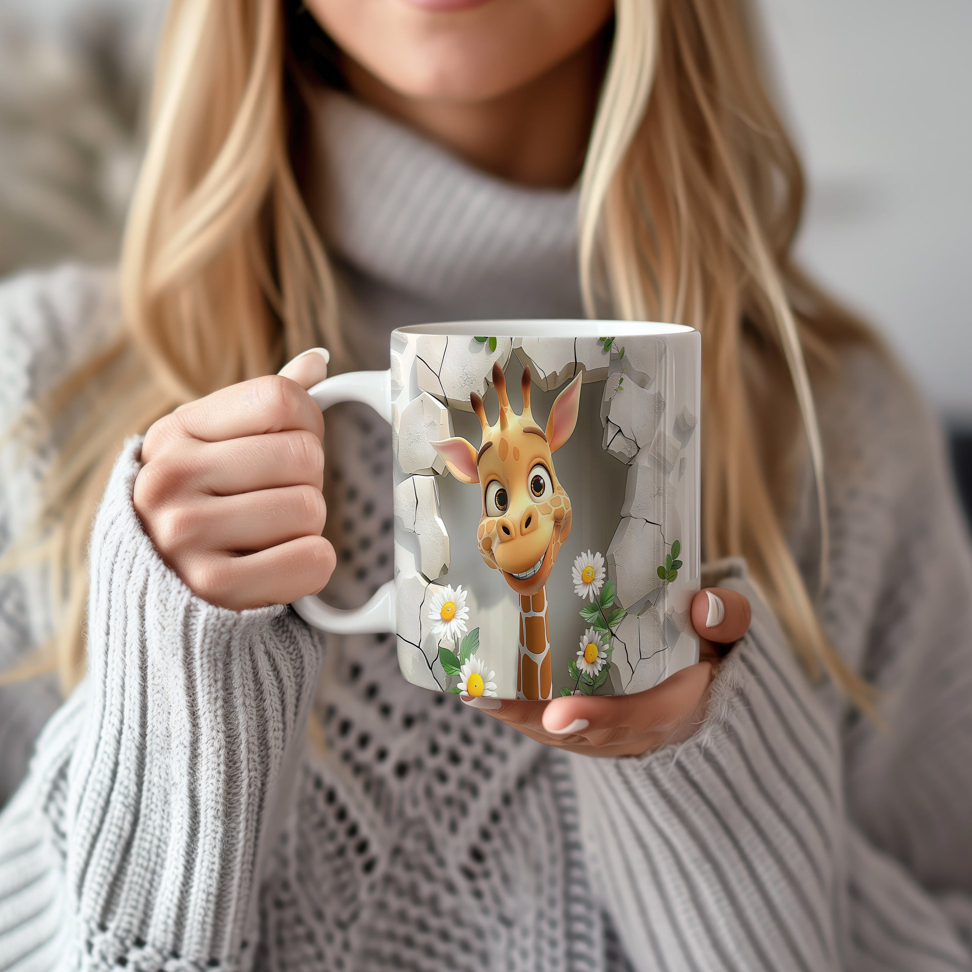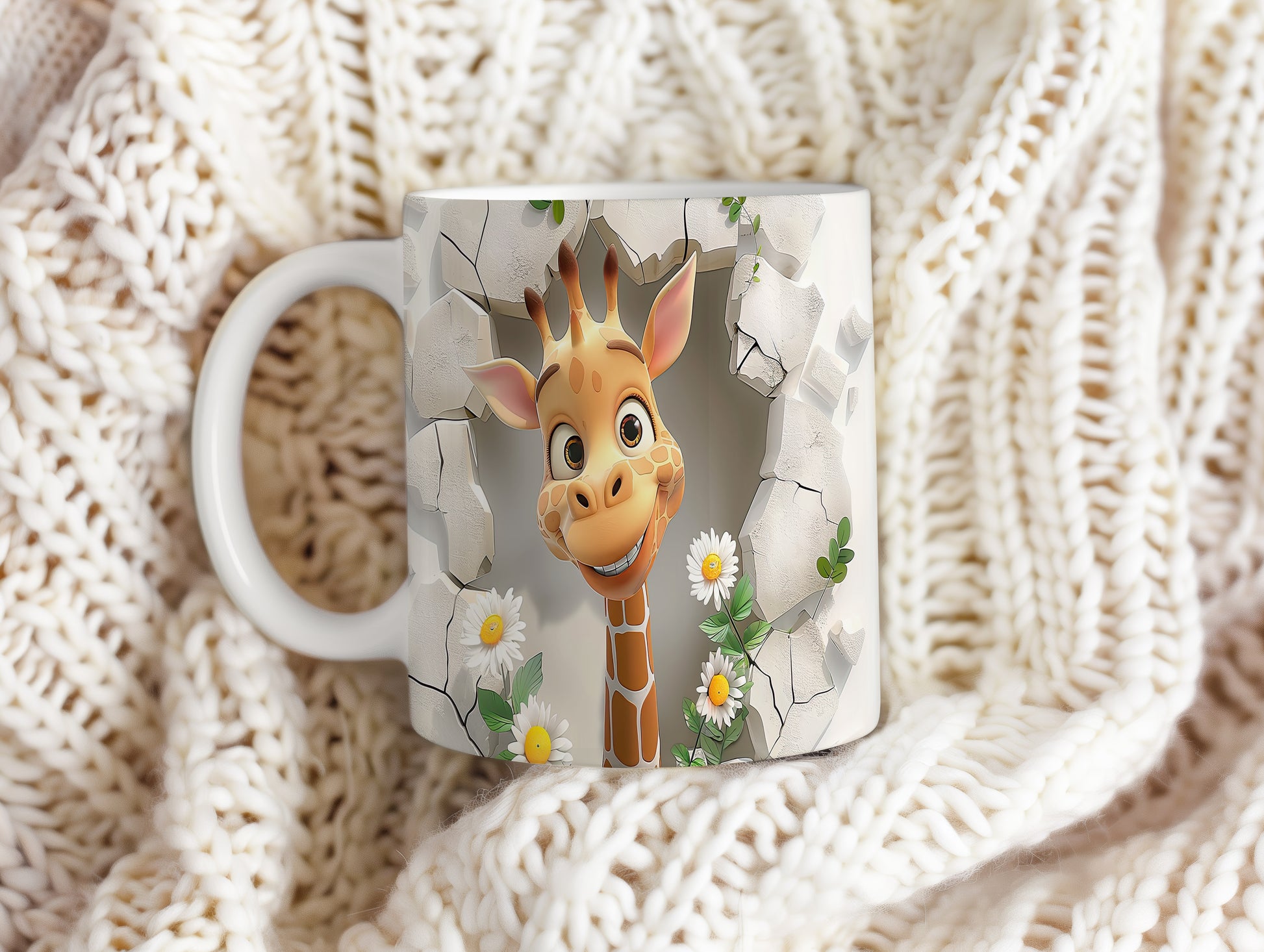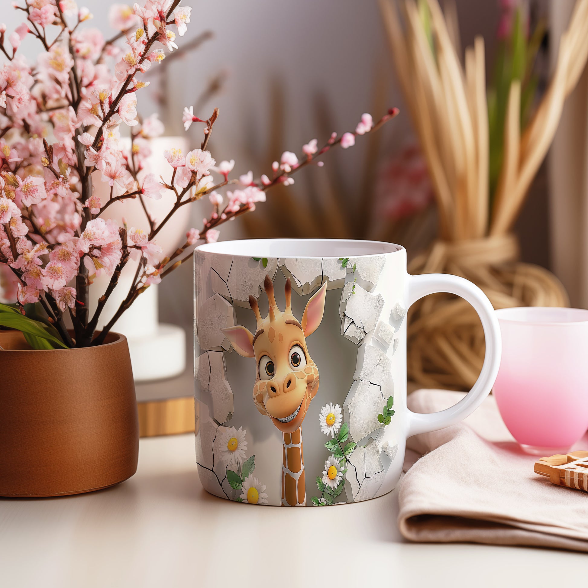 Tento hrnek zobrazuje roztomilou žirafu s 3D efektem, která vykukuje z květinového pozadí. Je ideální pro milovníky zvířat a skvělým dárkem pro děti i dospělé. Materiál: keramika. Objem: 330 ml. Vhodné do myčky i mikrovlnky. Užívejte si svůj oblíbený nápoj s úsměvem na tváři.
