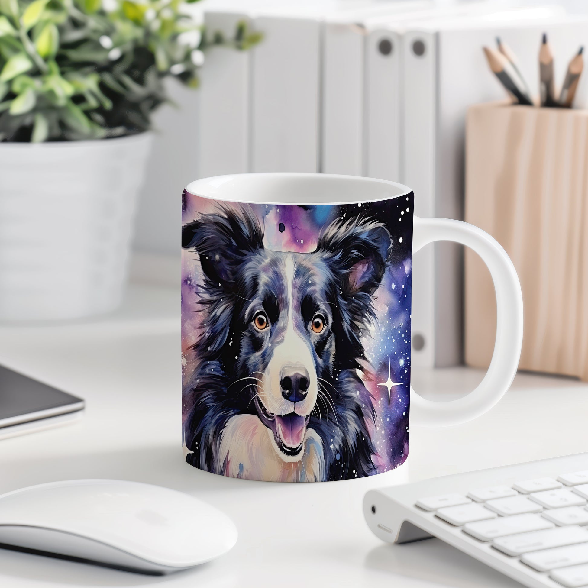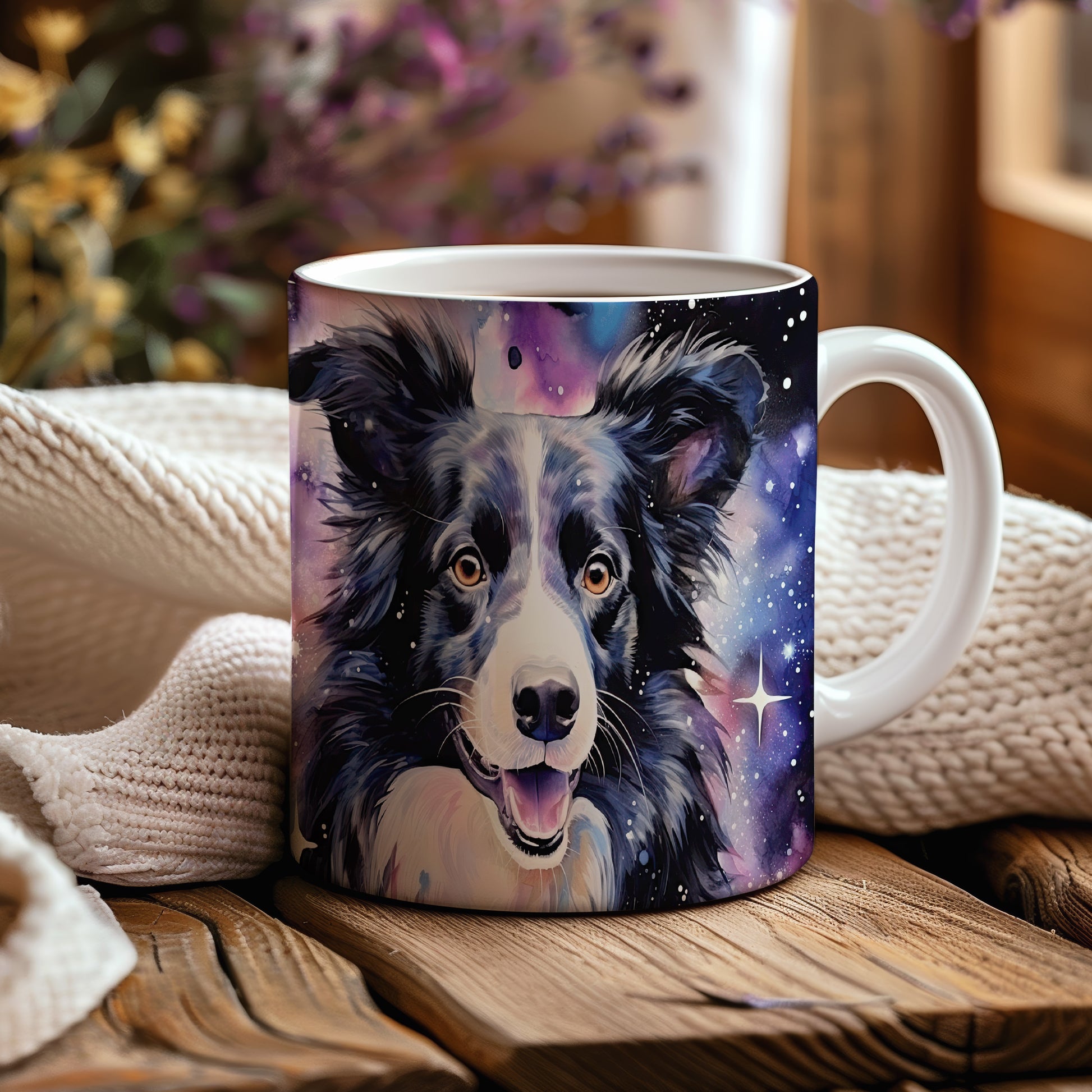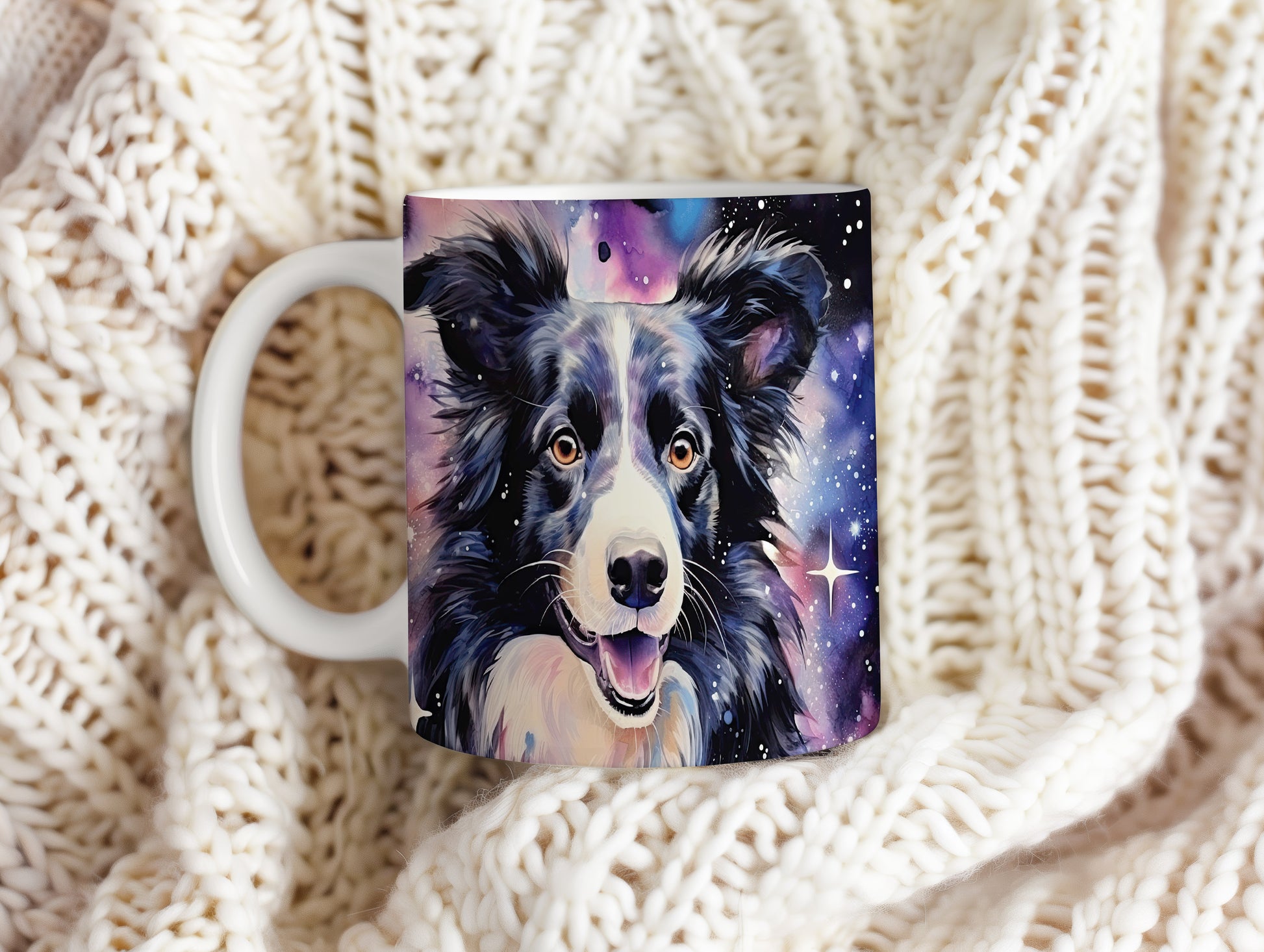 Hrnek s roztomilou border kolií v galaktickém stylu