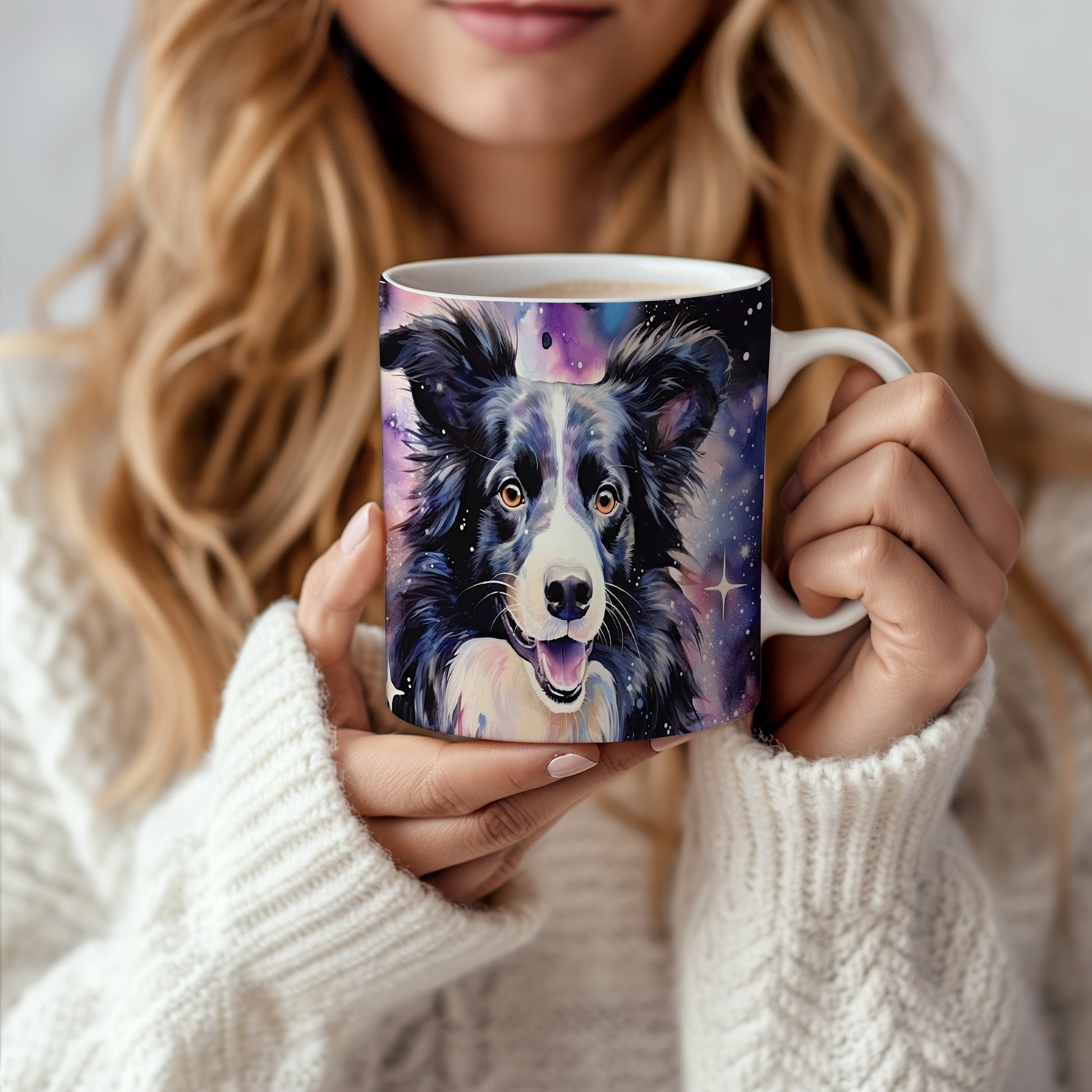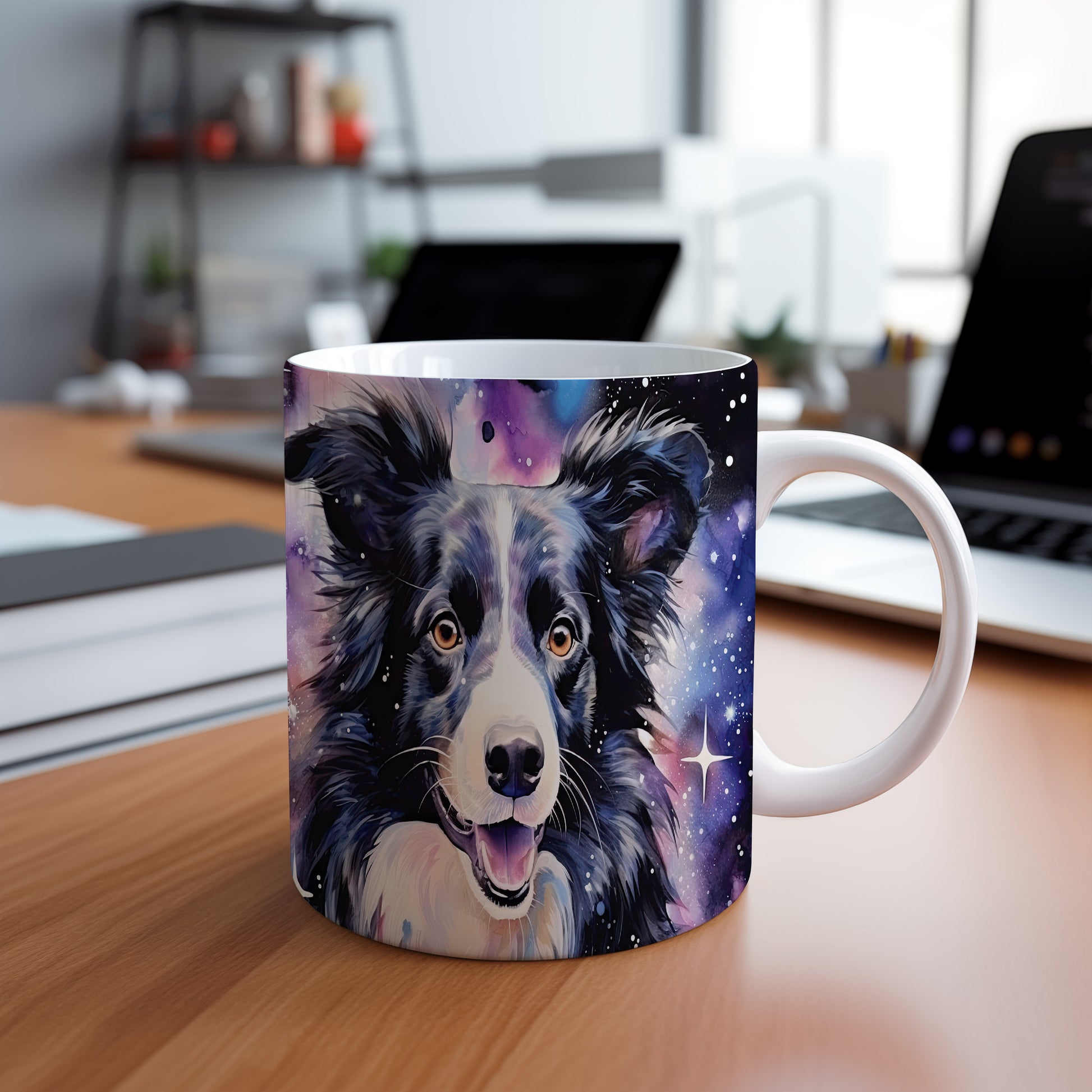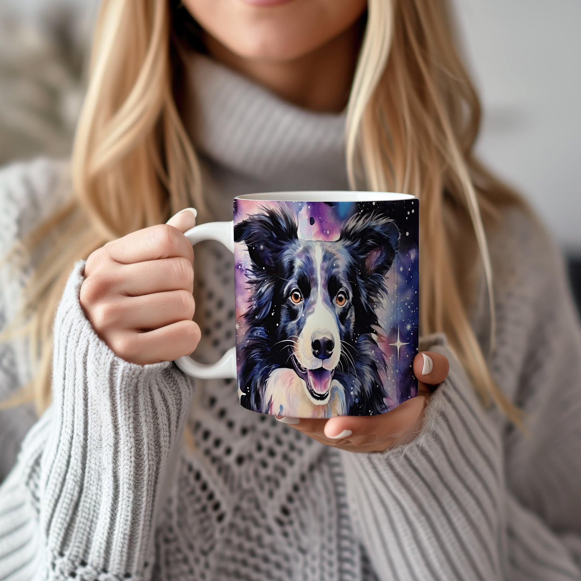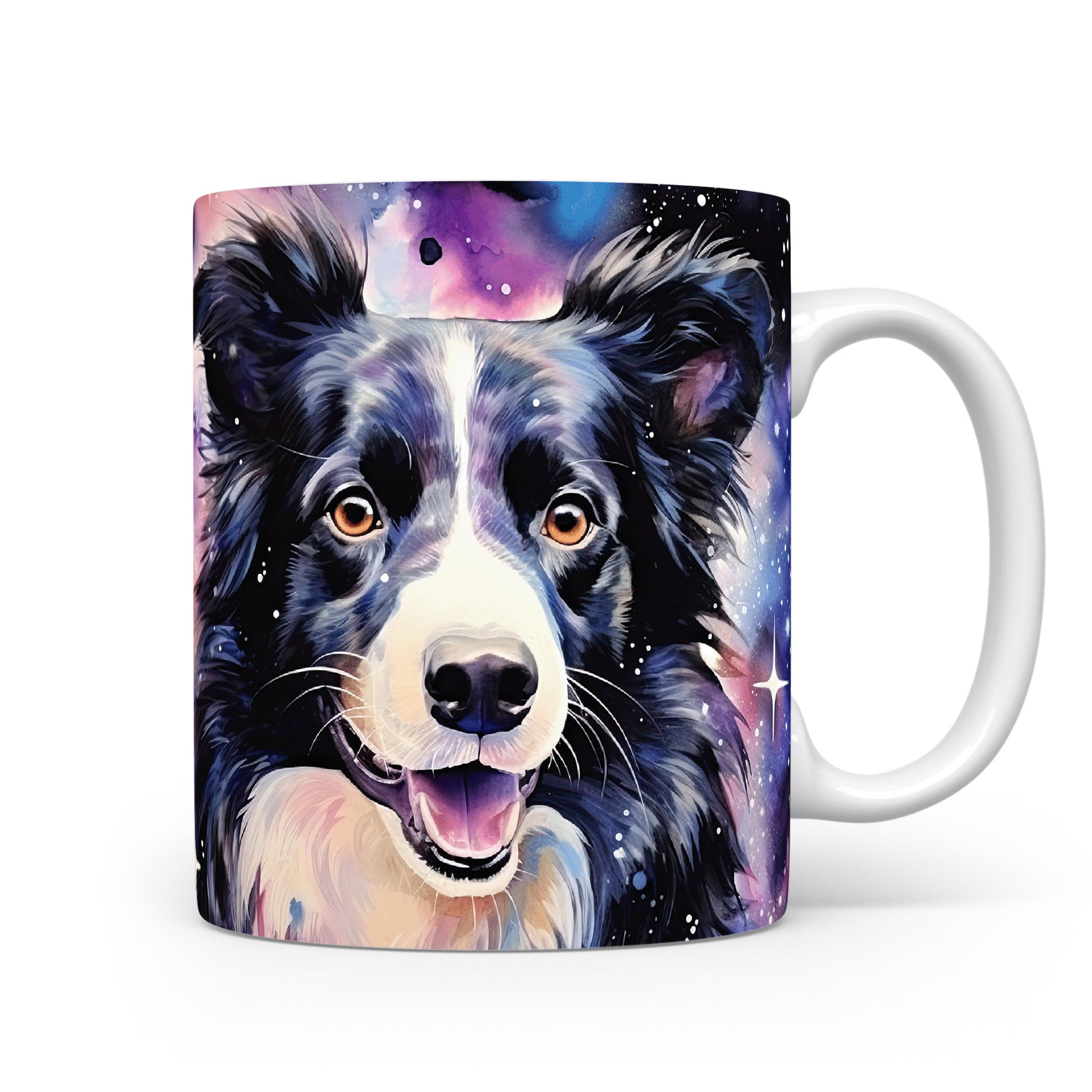 Hrnek s roztomilou border kolií v galaktickém stylu