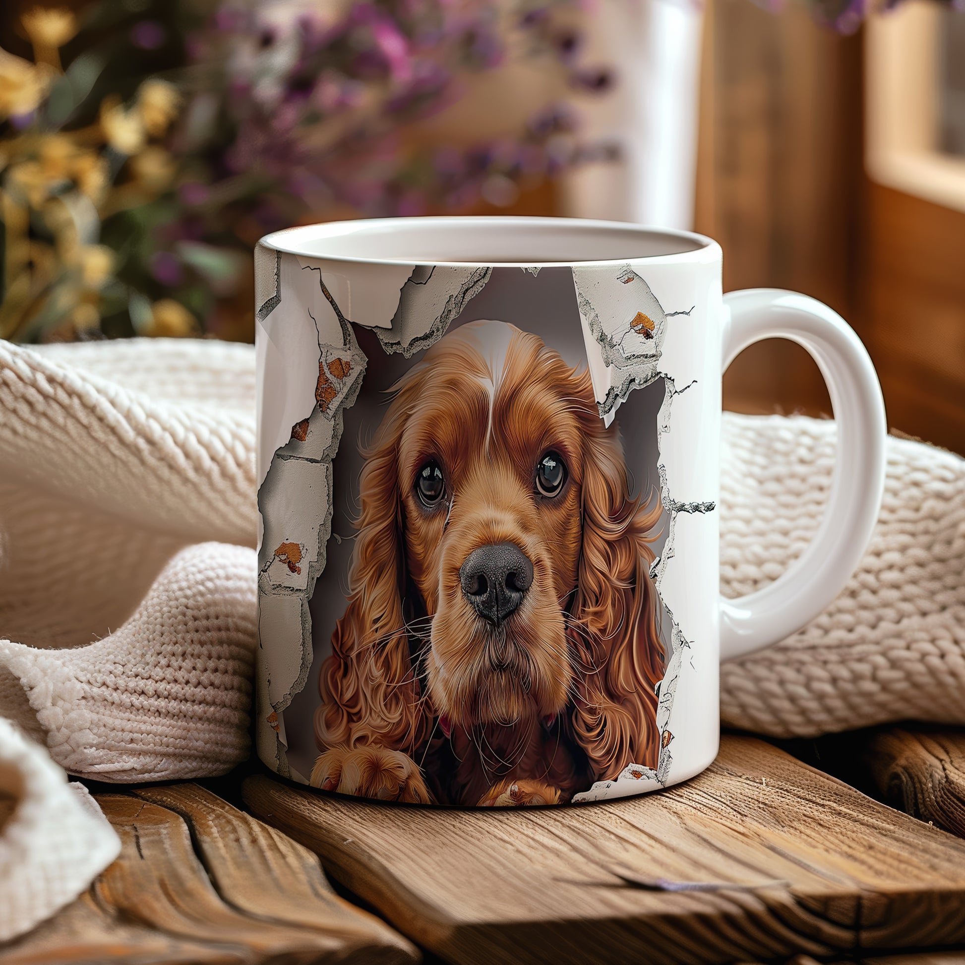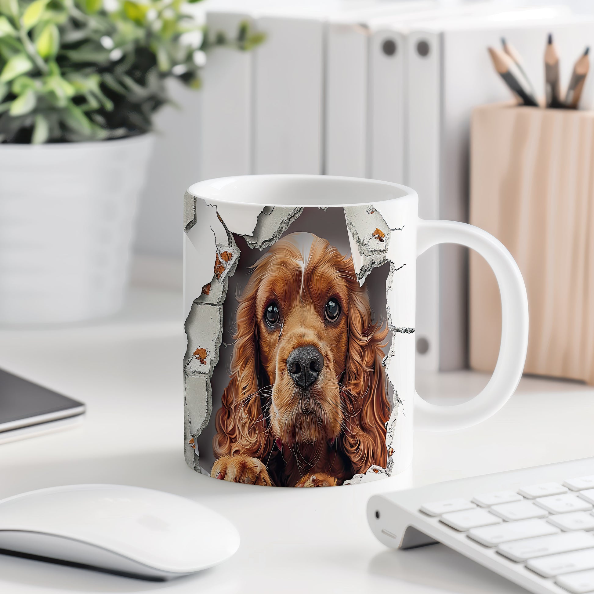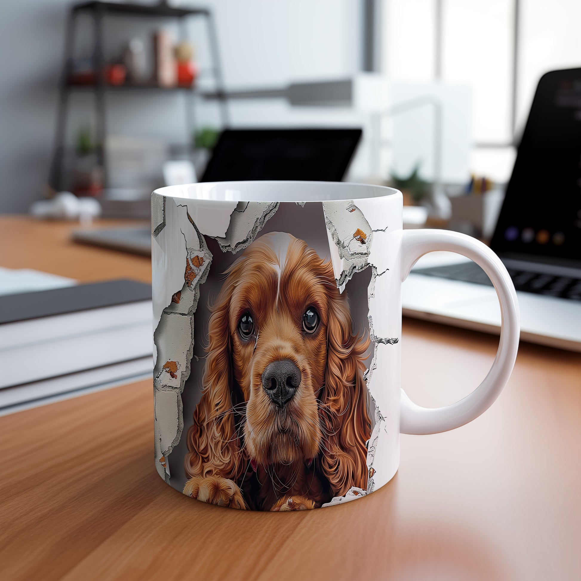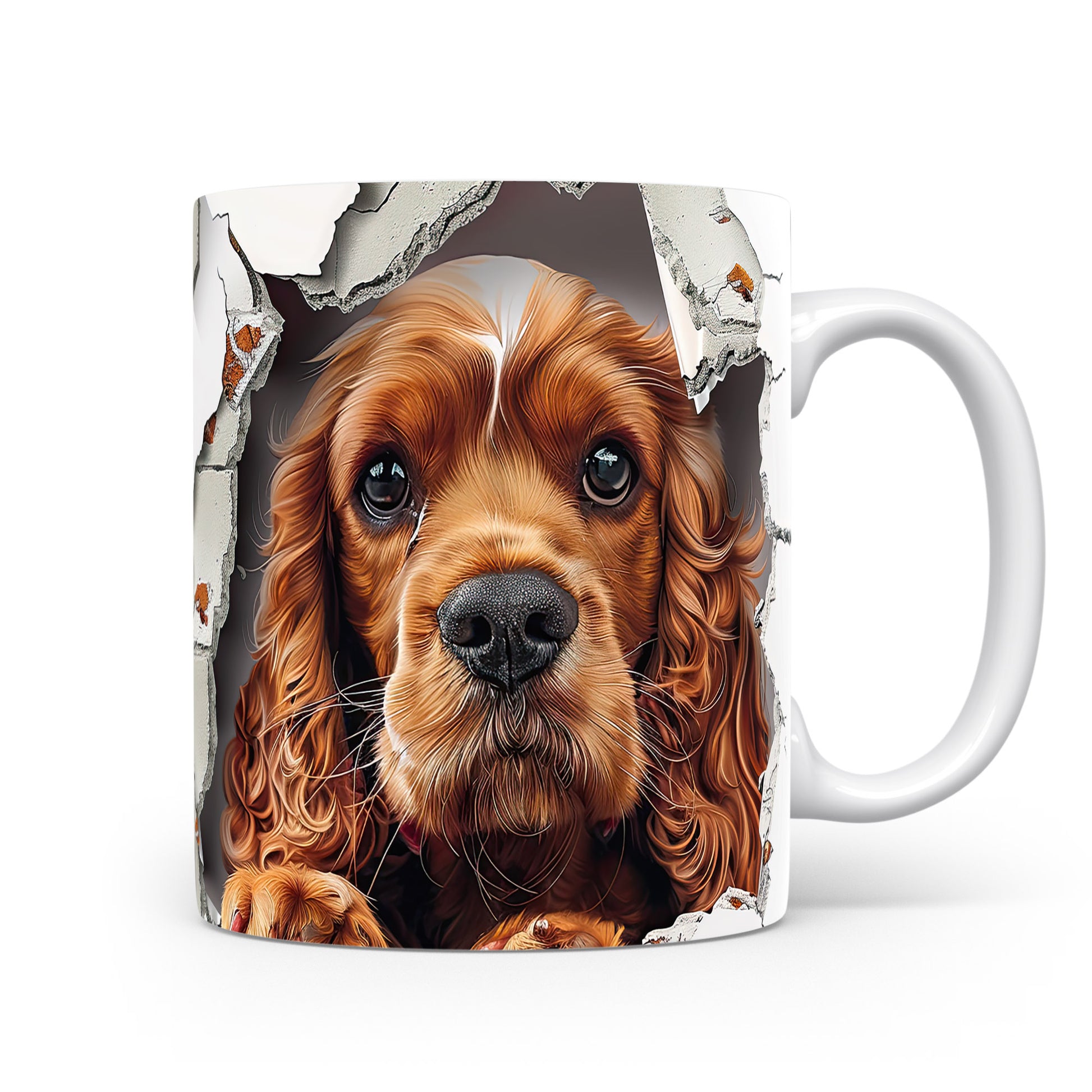 Hrnek s realistickým motivem roztomilého cocker španěla, který vypadá, jako by vykukoval. Tento hrnek je ideální pro milovníky psů a skvělým dárkem pro každého, kdo má rád zvířata. Materiál: keramika. Objem: 330 ml. Vhodné do myčky i mikrovlnky. Používání tohoto hrnku přináší radost a útulnost do každodenního pití.