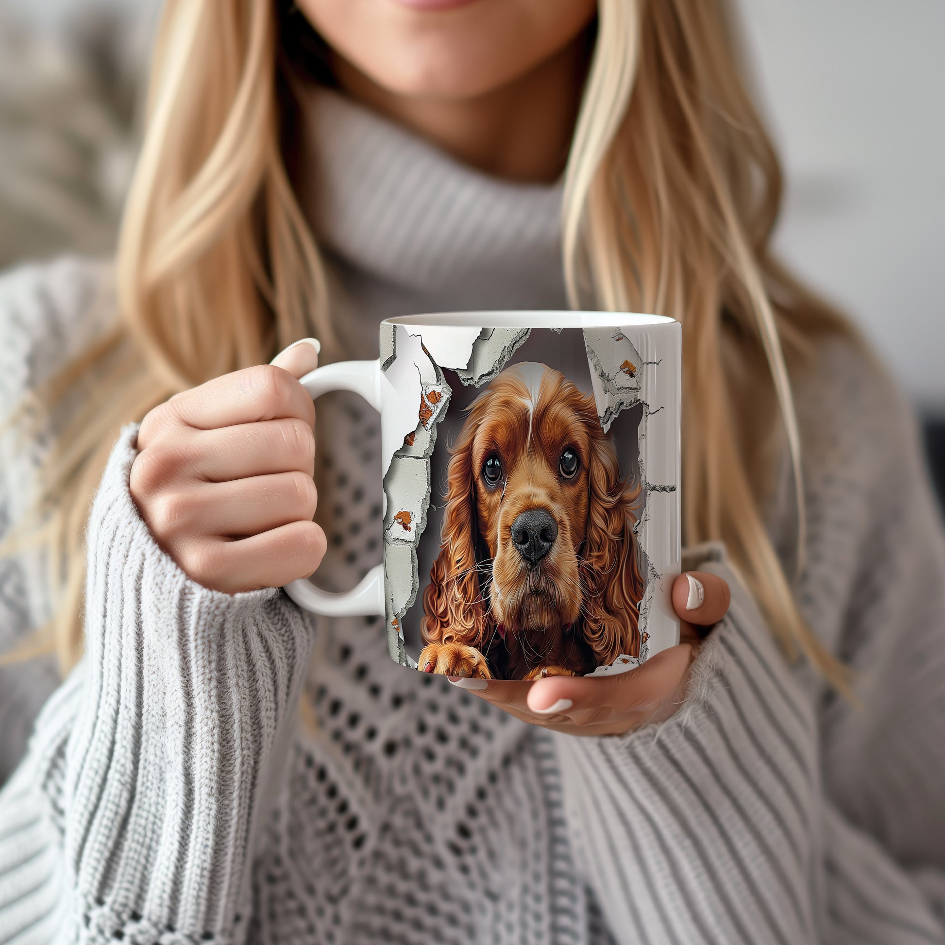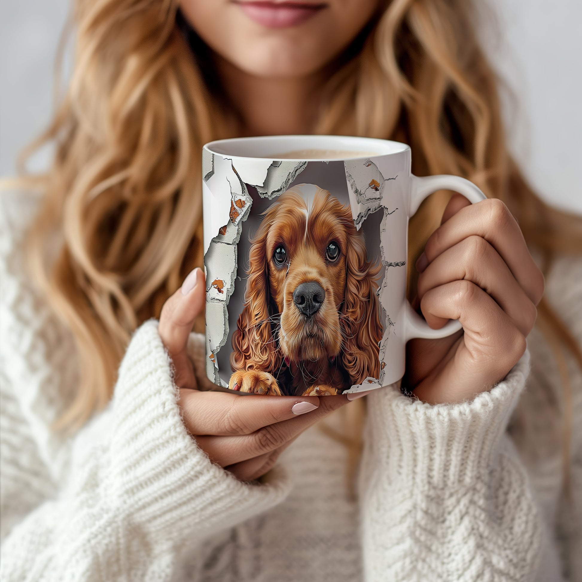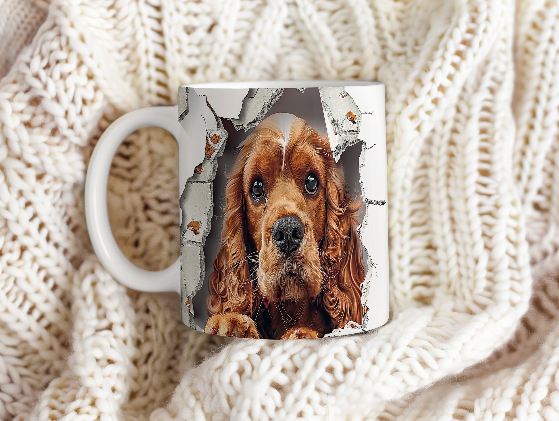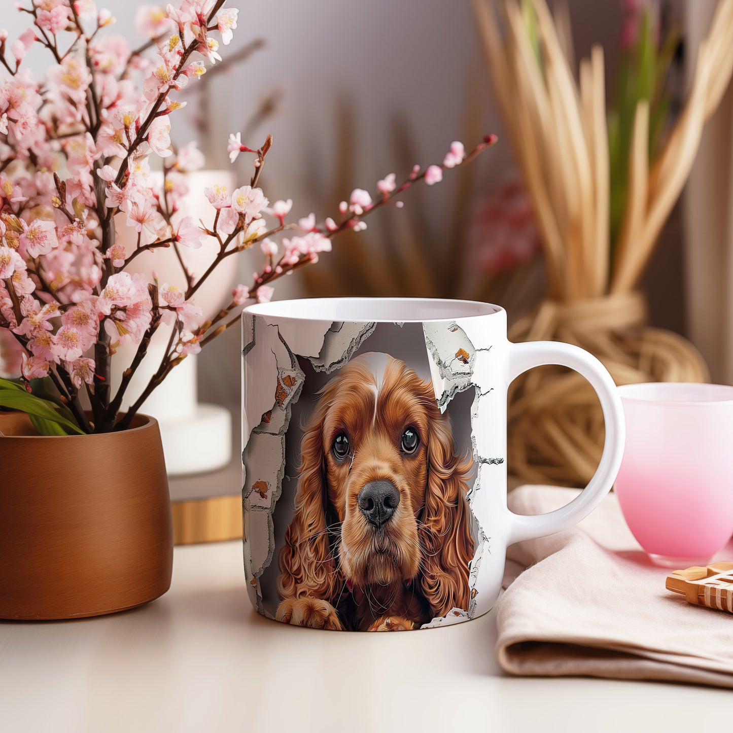 Hrnek s realistickým motivem roztomilého cocker španěla, který vypadá, jako by vykukoval. Tento hrnek je ideální pro milovníky psů a skvělým dárkem pro každého, kdo má rád zvířata. Materiál: keramika. Objem: 330 ml. Vhodné do myčky i mikrovlnky. Používání tohoto hrnku přináší radost a útulnost do každodenního pití.