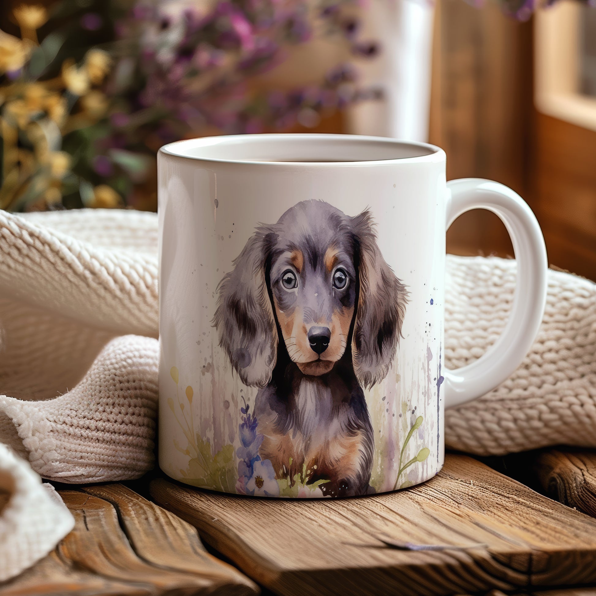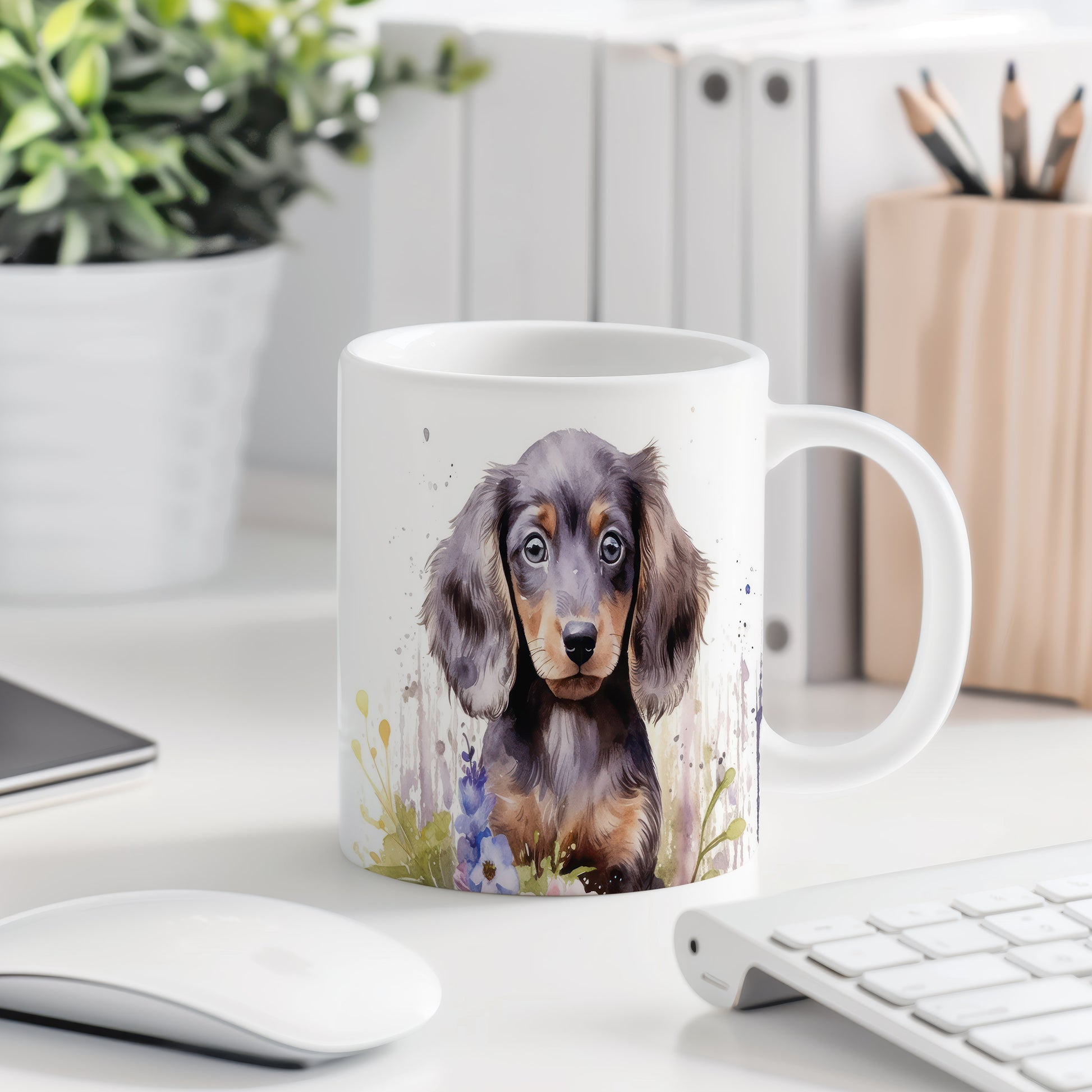 Hrnek s roztomilým dachshundem v květinovém stylu