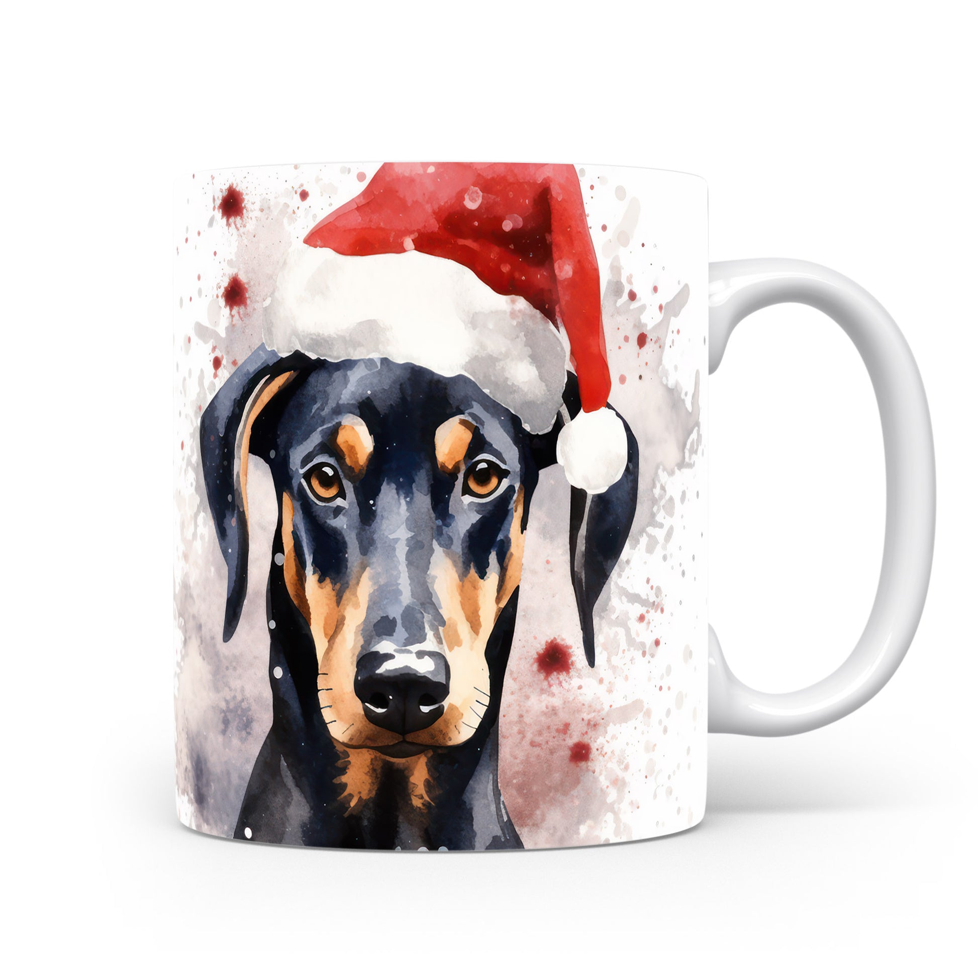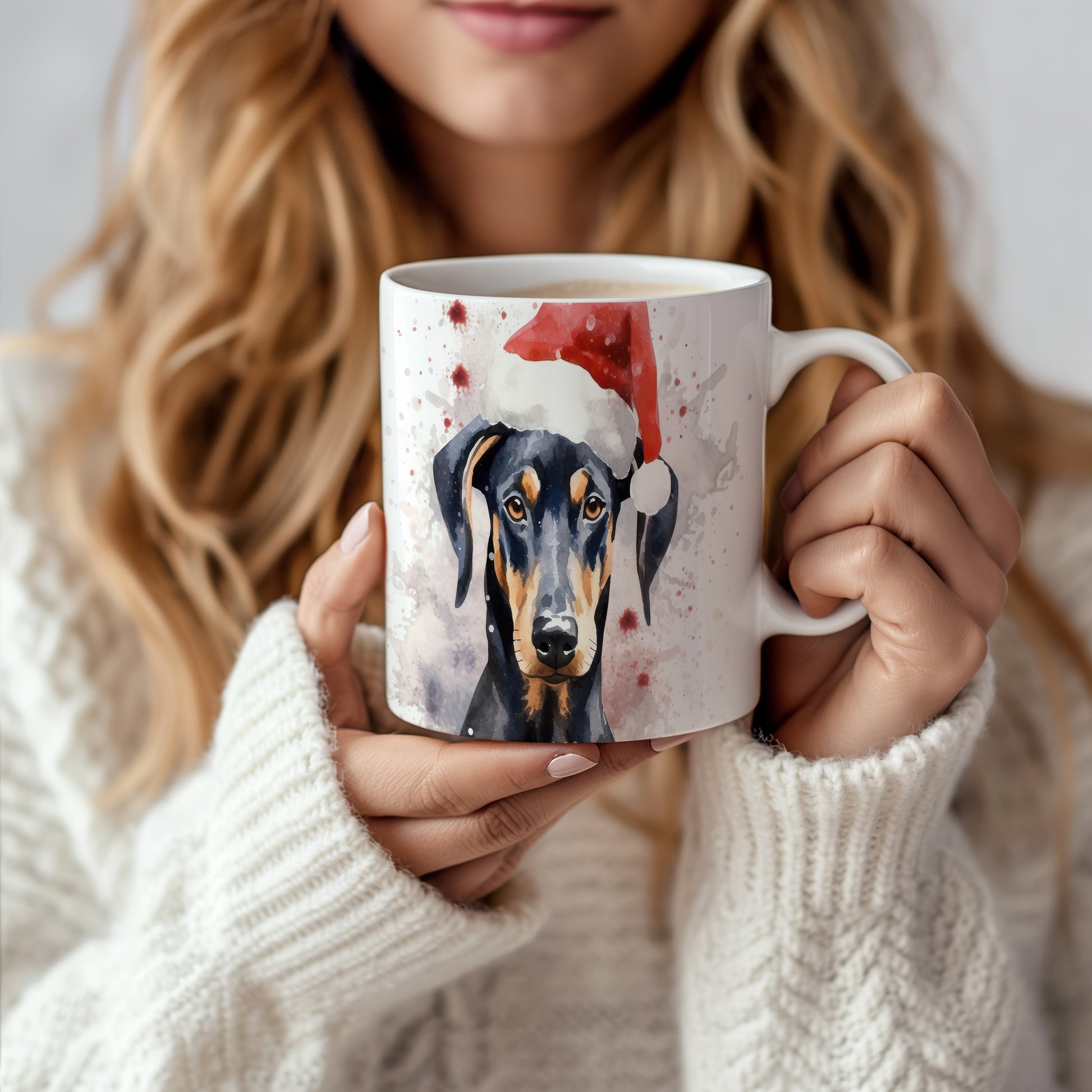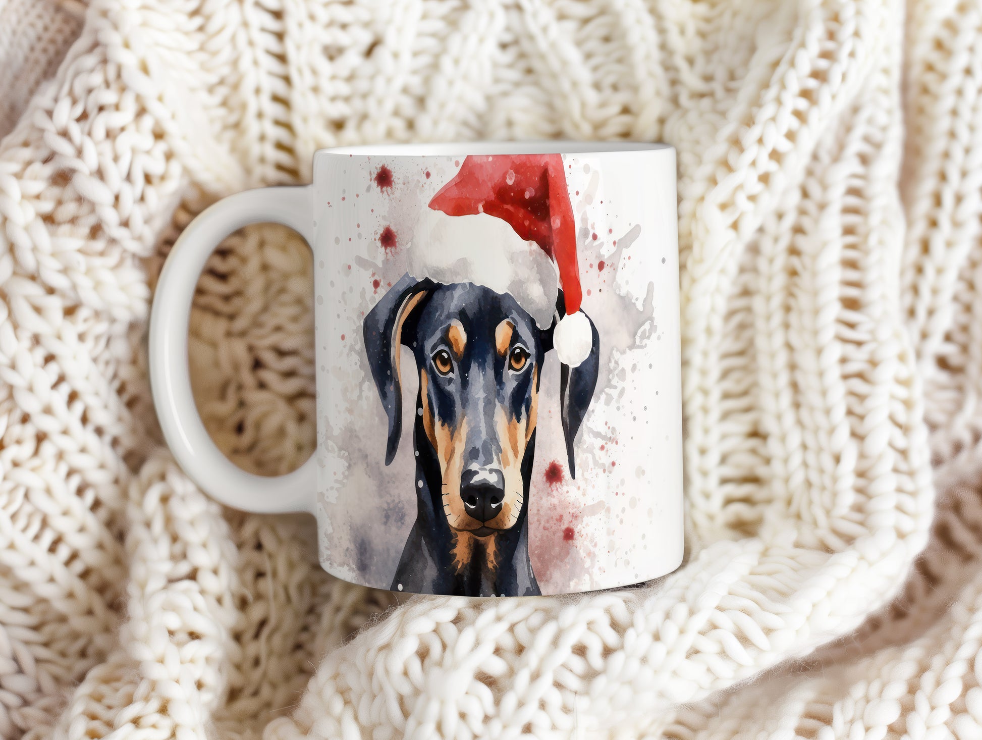 Hrnek s motivem roztomilého dobermannského psa v santovské čepici. Tento hrnek je ideální pro milovníky psů a skvělý tip na dárek pro přátele nebo rodinu. Materiál: keramika. Objem: 330 ml. Vhodné do myčky i mikrovlnky. Užijte si svůj oblíbený nápoj s tímto veselým hrnkem.