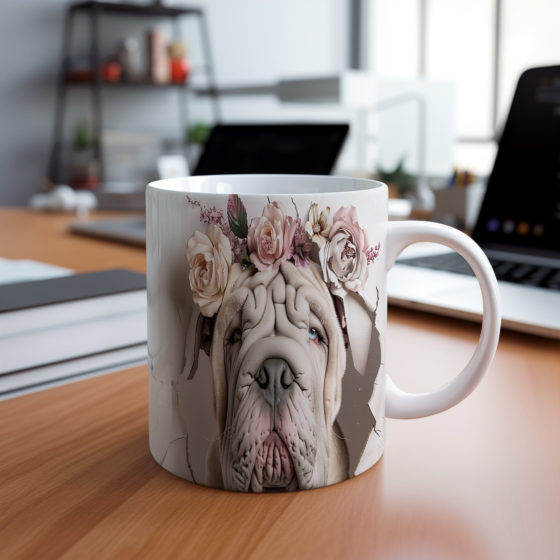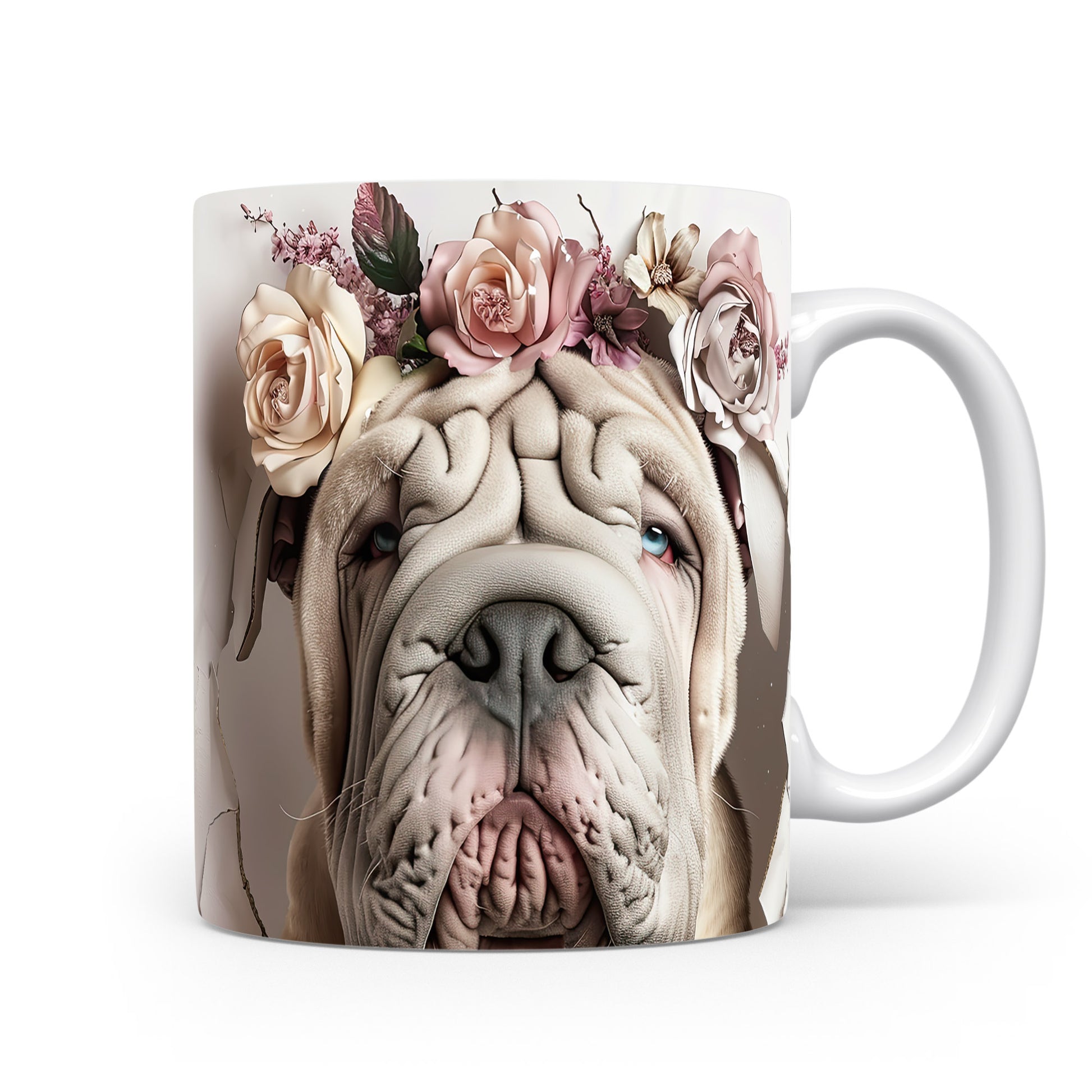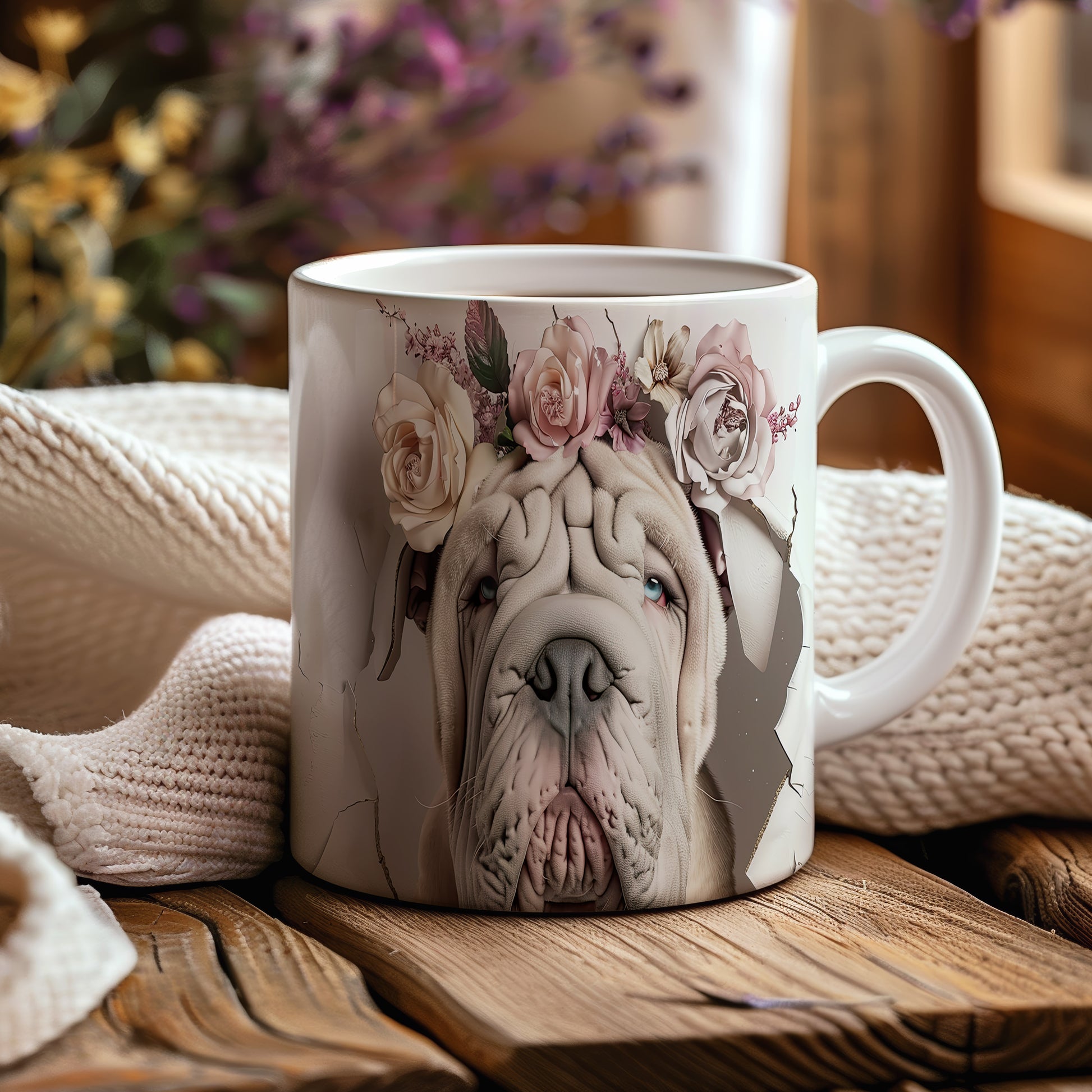 Hrnek s realistickým motivem psa plemene Shar Pei zdobeného květinami. Tento hrnek je ideální pro milovníky zvířat, kteří chtějí dodat svému pití styl. Skvělý tip na dárek pro přátele nebo rodinu. Materiál: keramika. Objem: 330 ml. Vhodné do myčky i mikrovlnky. Používání tohoto hrnku přináší radost a útulnost do každého dne.