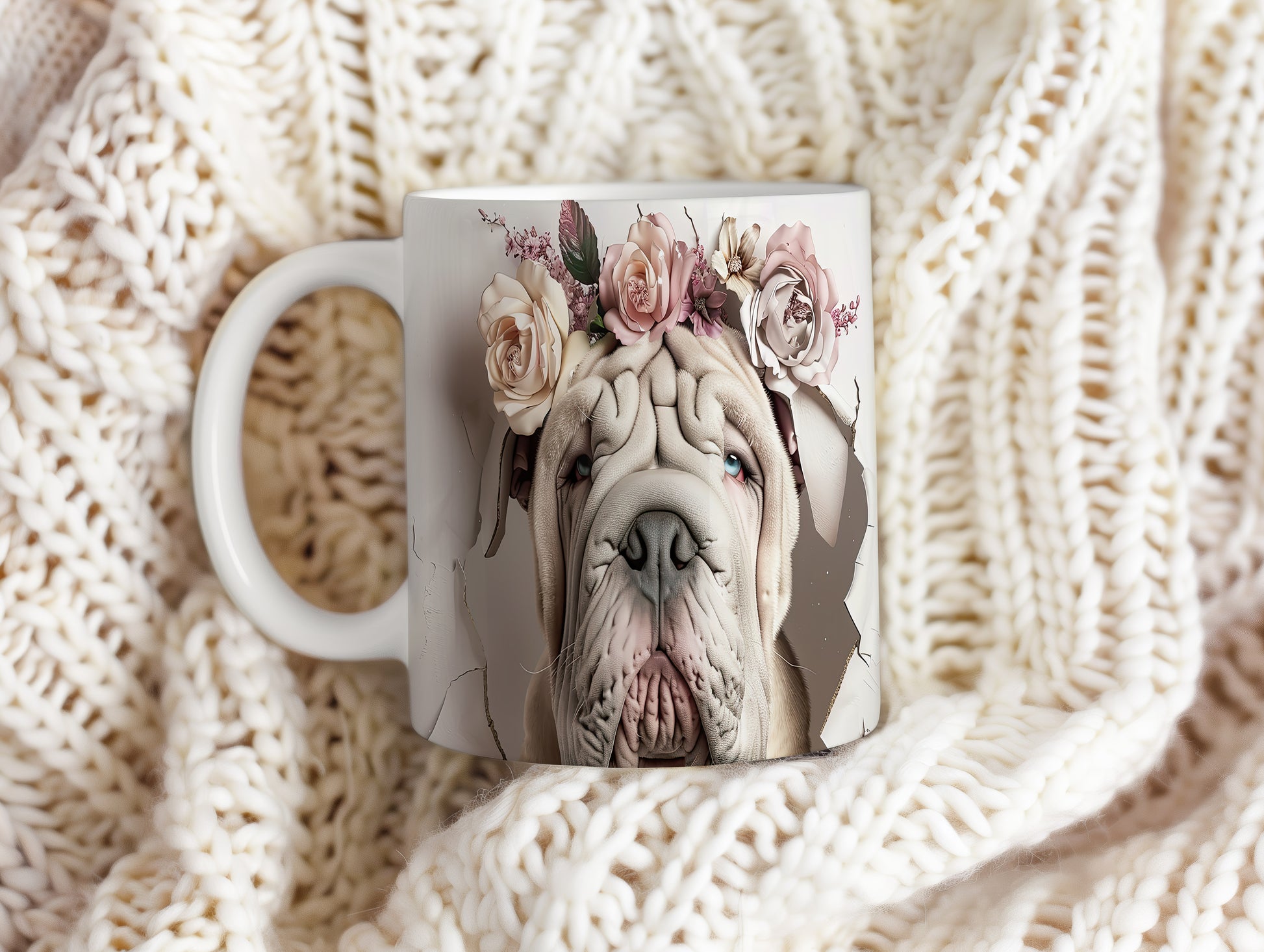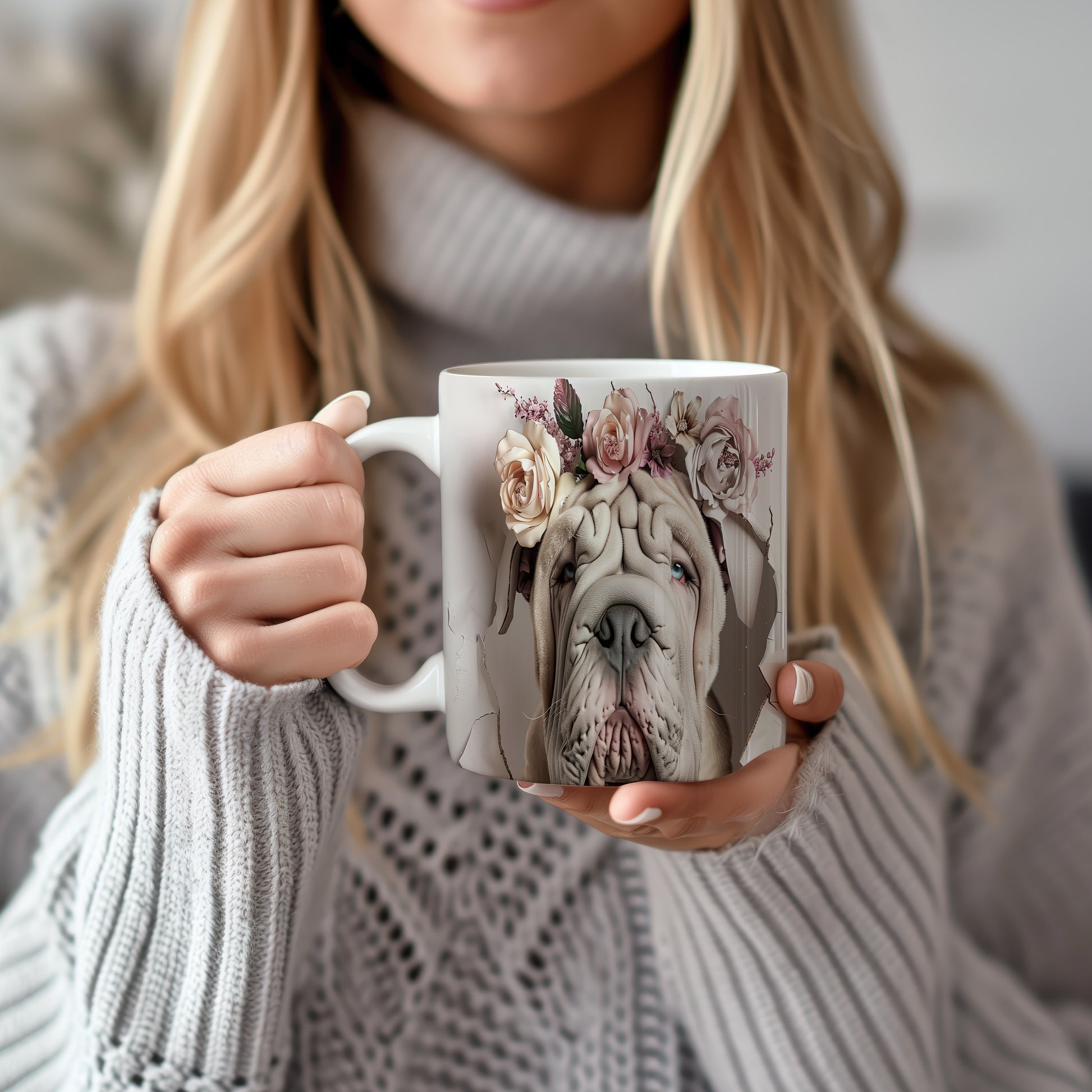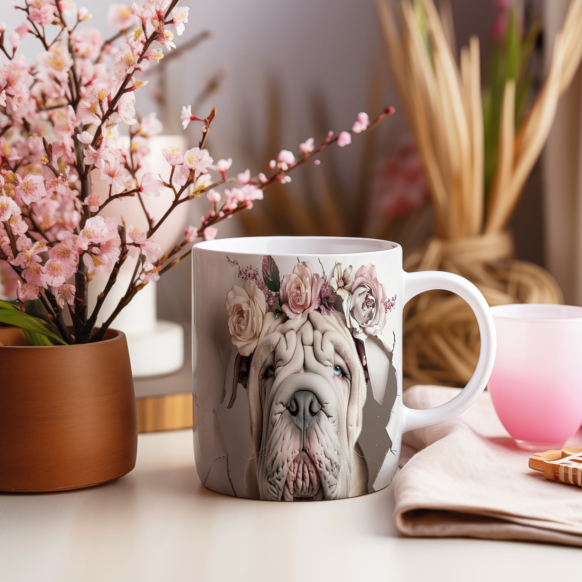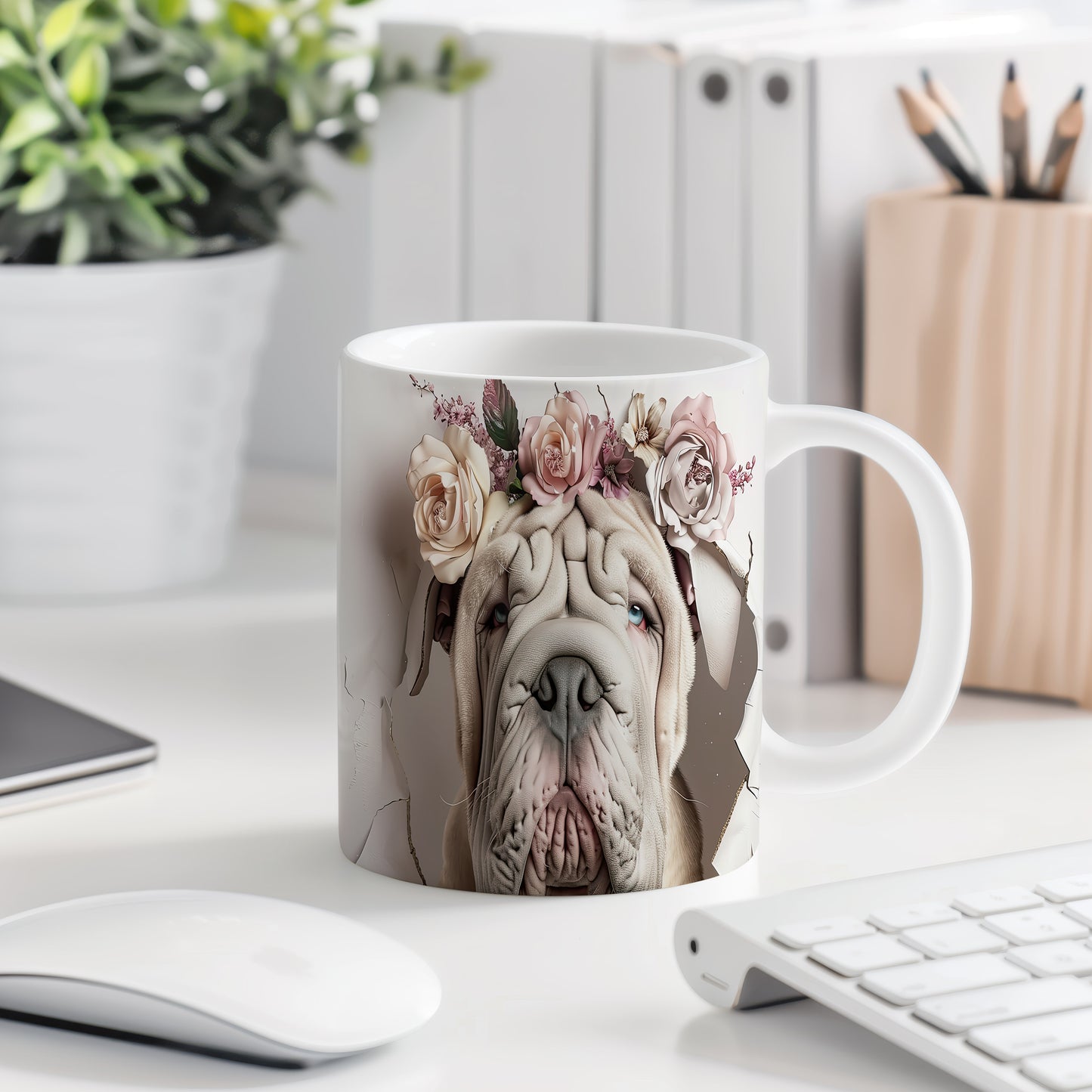 Hrnek s realistickým motivem psa plemene Shar Pei zdobeného květinami. Tento hrnek je ideální pro milovníky zvířat, kteří chtějí dodat svému pití styl. Skvělý tip na dárek pro přátele nebo rodinu. Materiál: keramika. Objem: 330 ml. Vhodné do myčky i mikrovlnky. Používání tohoto hrnku přináší radost a útulnost do každého dne.