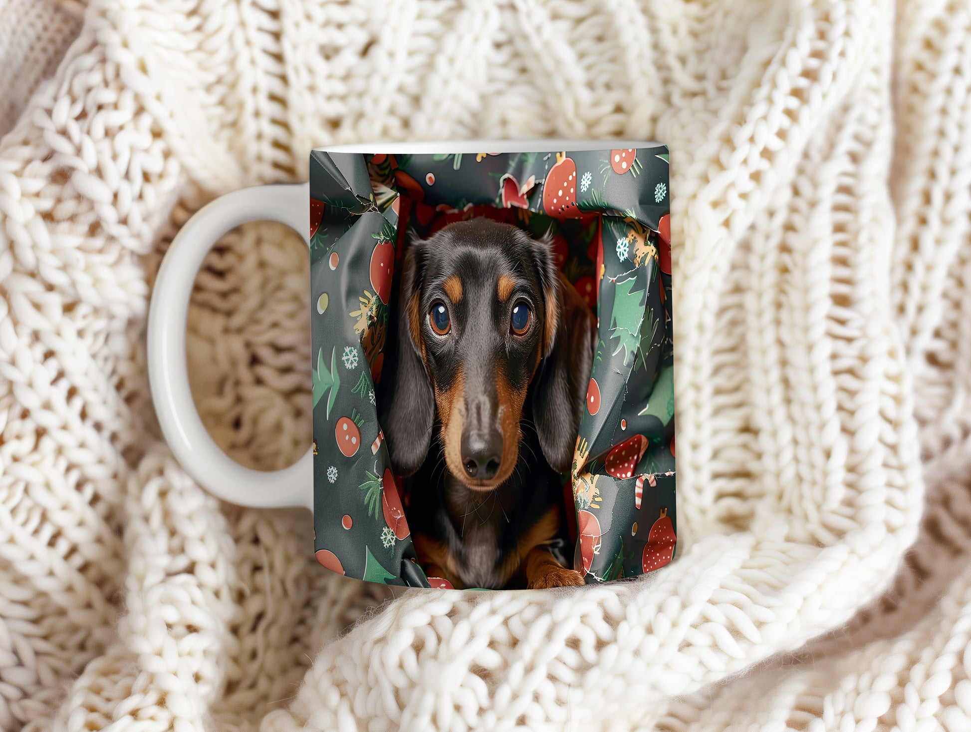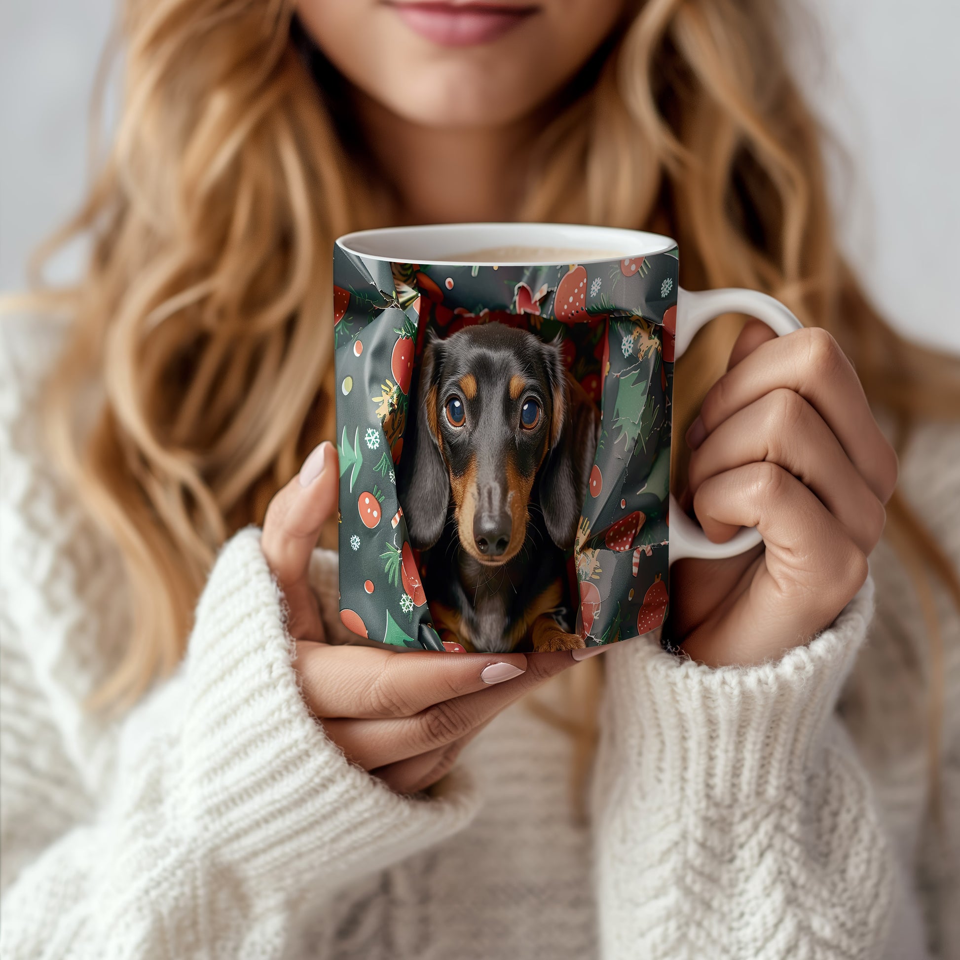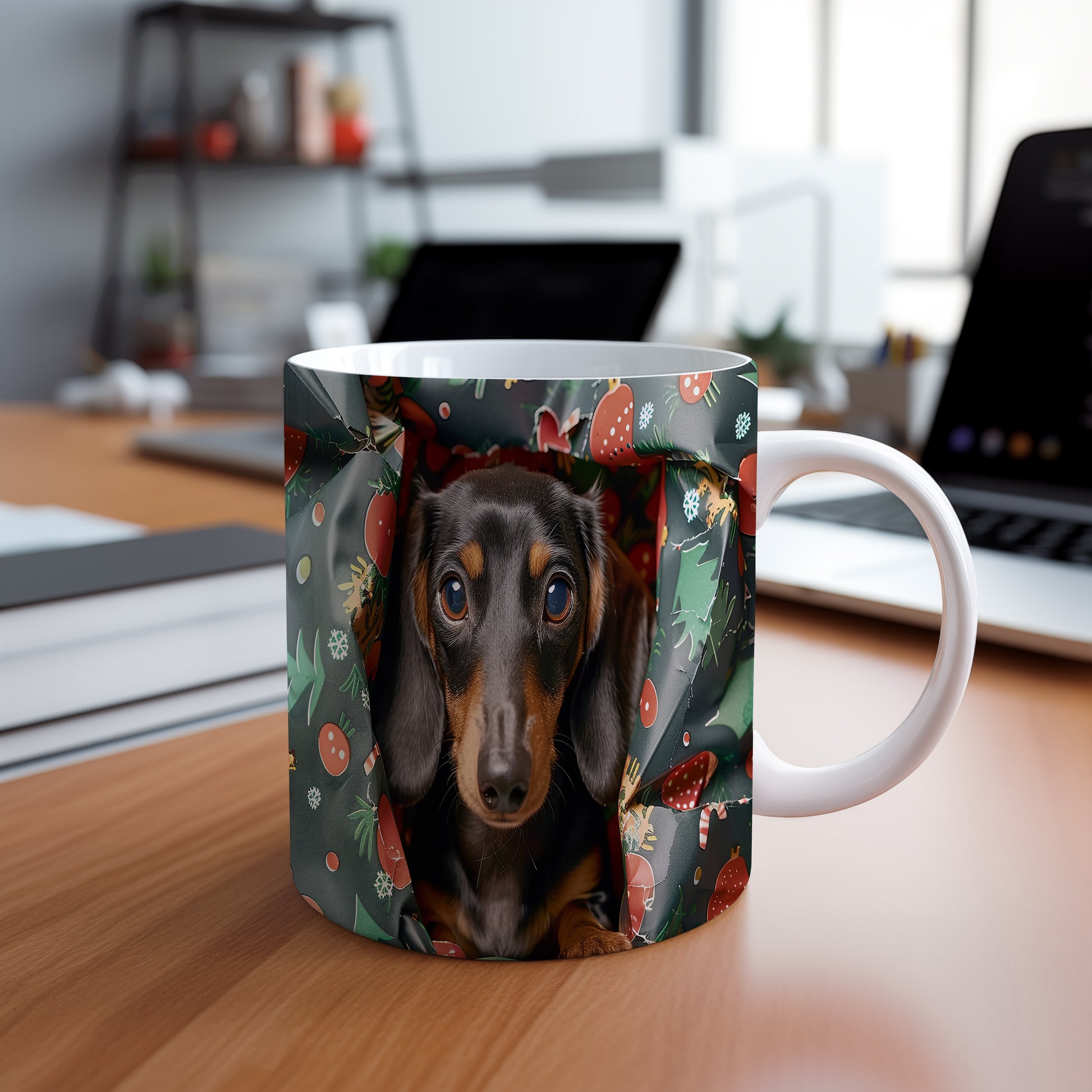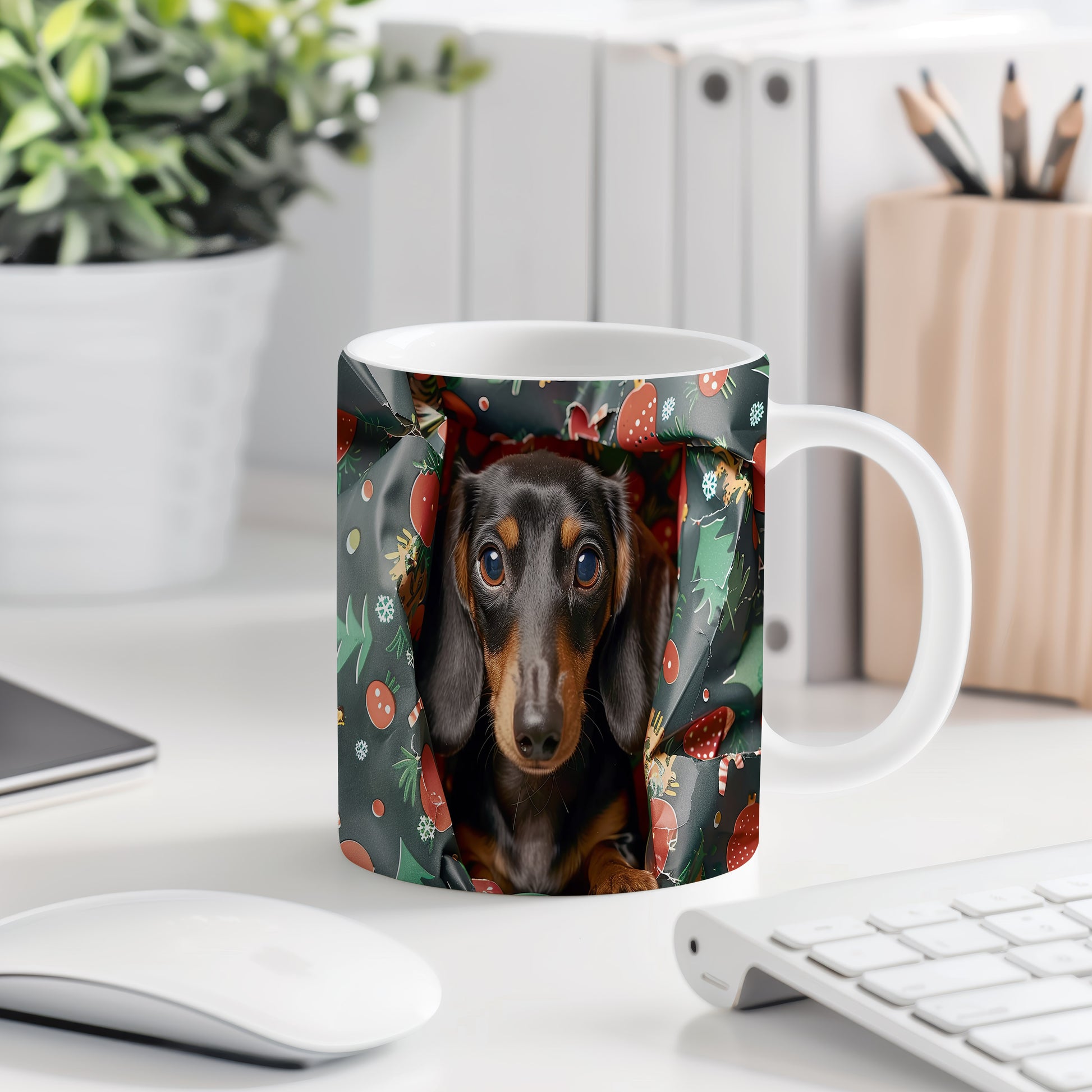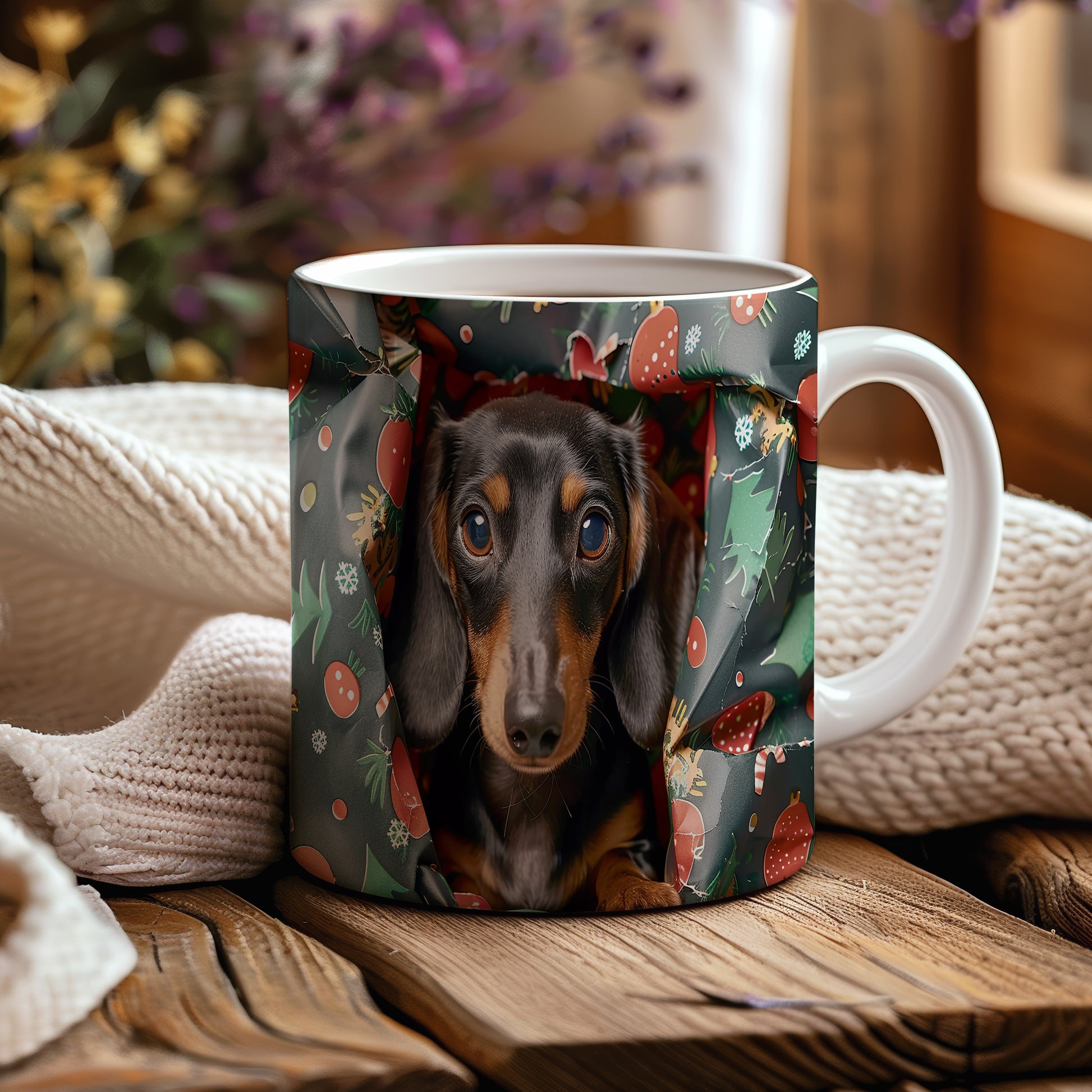 Tento hrnek zdobí roztomilý jezevčík v příjemném vánočním stylu. Je ideálním dárkem pro milovníky psů a vánoční atmosféry. Materiál: keramika. Objem: 330 ml. Vhodné do myčky i mikrovlnky. Užívejte si svůj oblíbený nápoj s úsměvem na tváři.