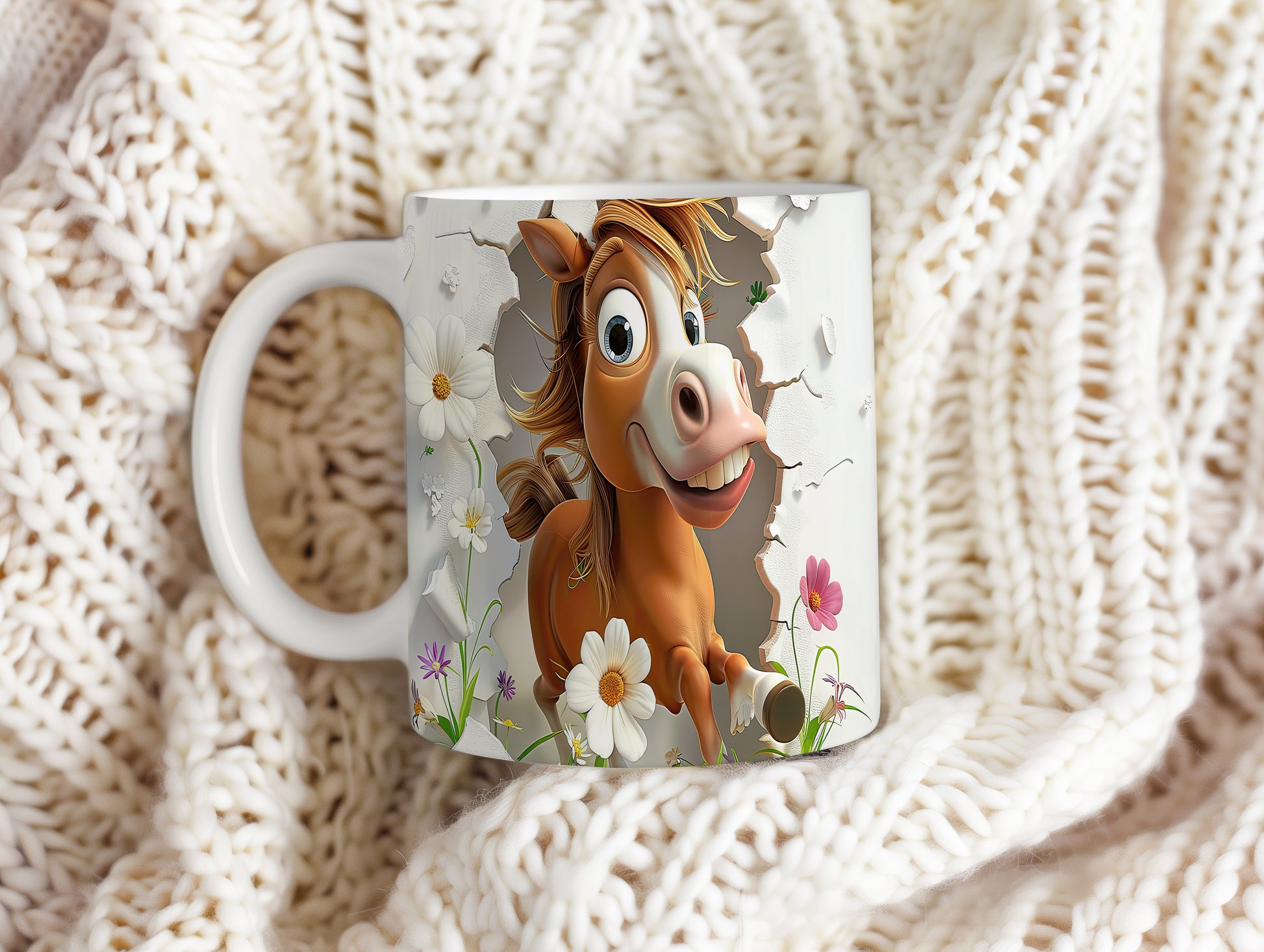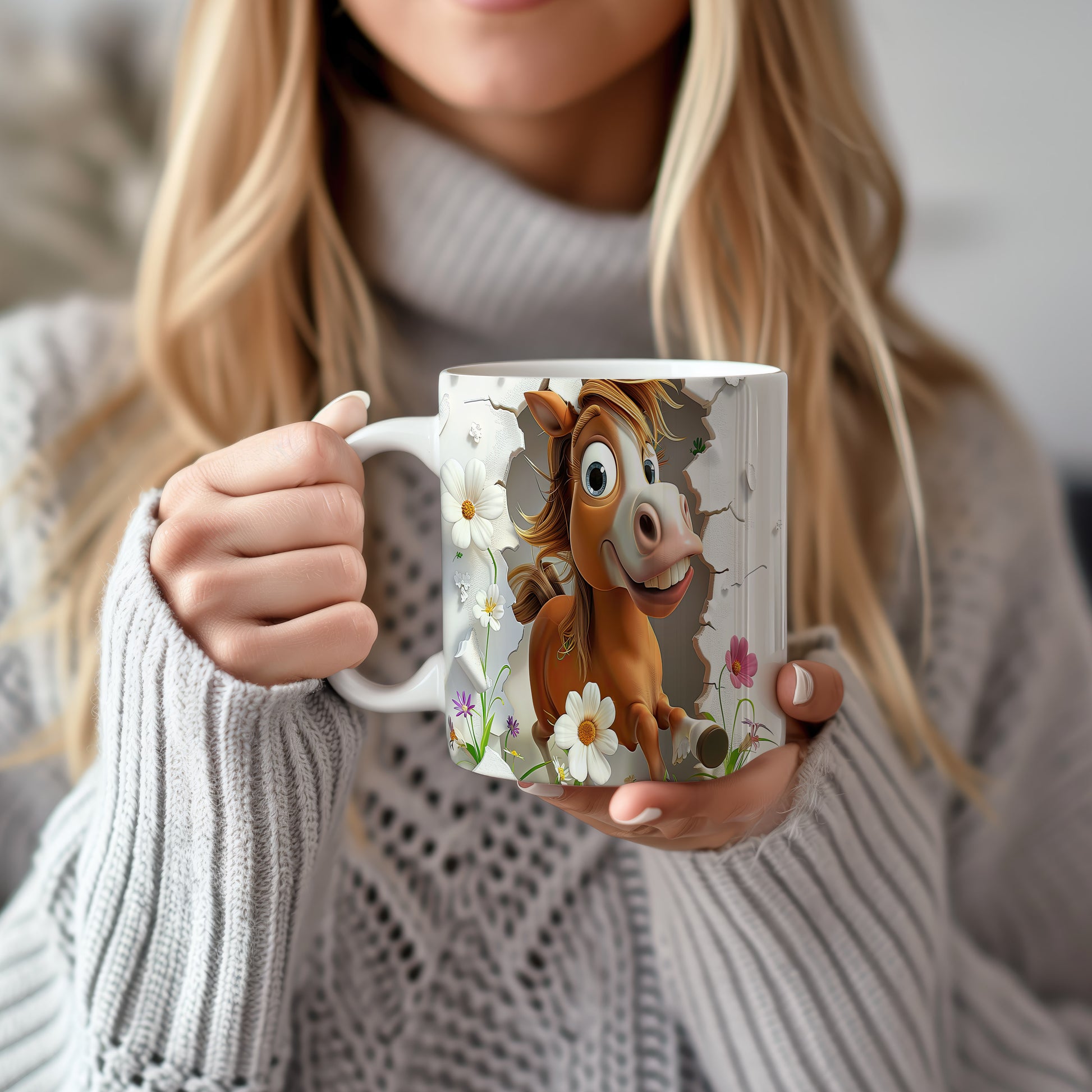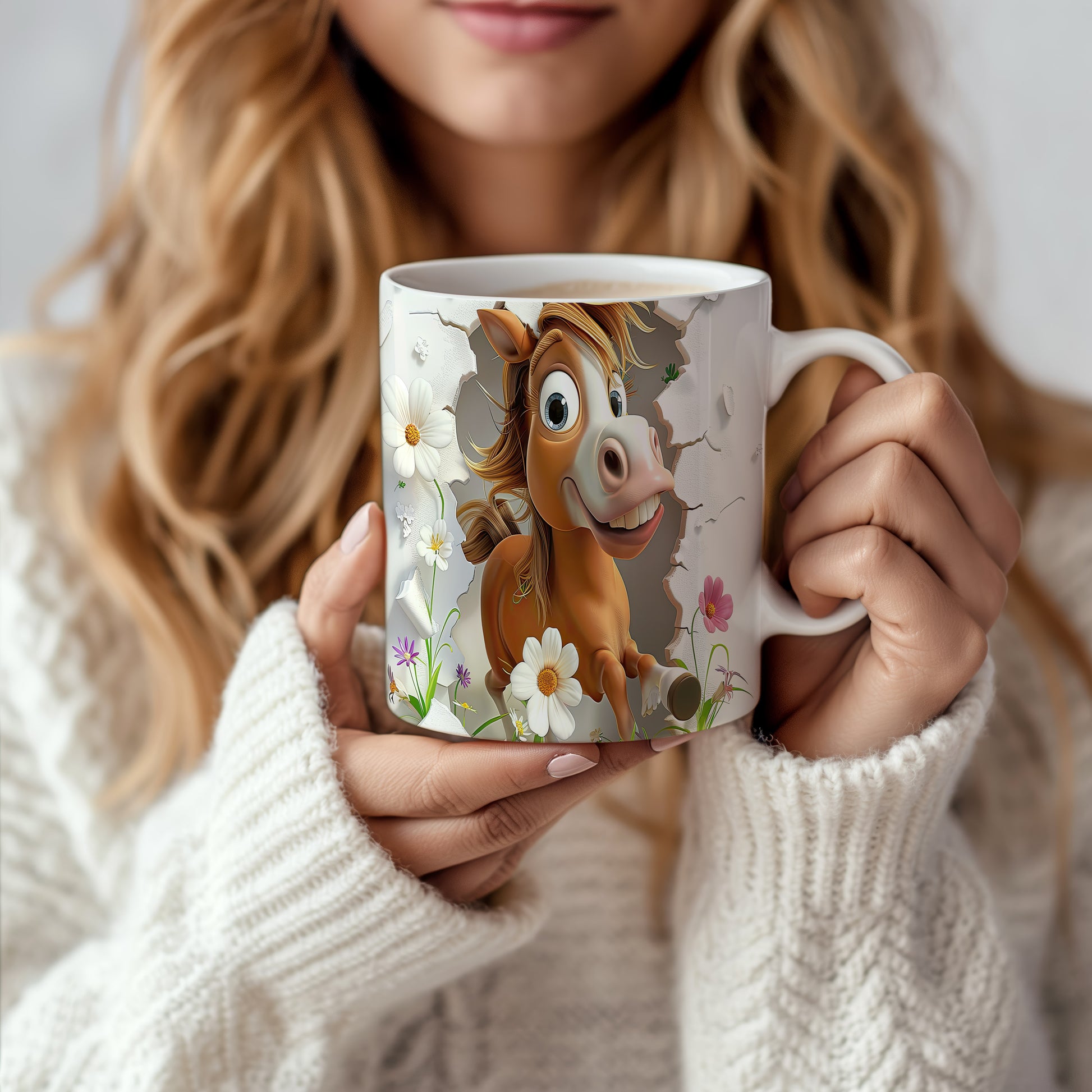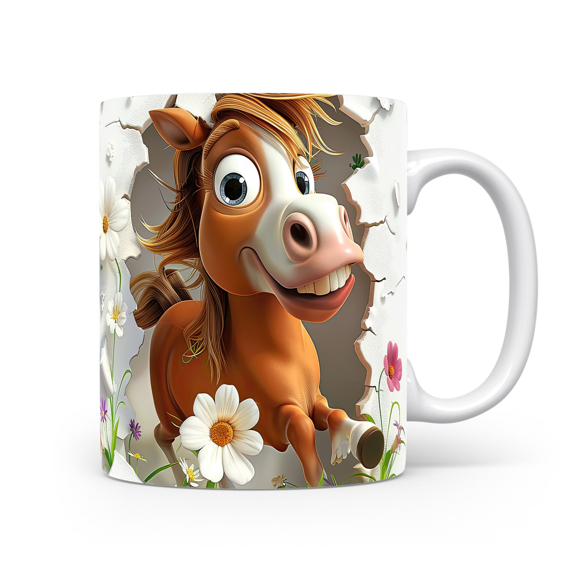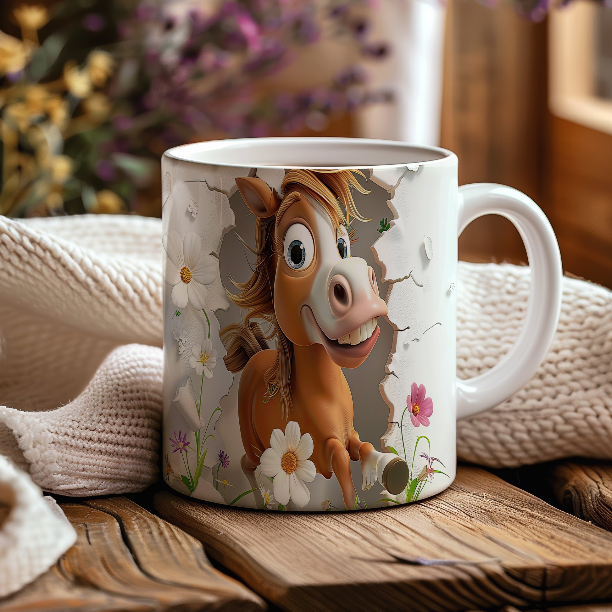 Tento hrnek zdobí veselý koník s květinami, který vytváří 3D efekt. Je ideální pro milovníky zvířat a skvělým dárkem pro každého, kdo ocení vtipný design. Materiál: keramika. Objem: 330 ml. Vhodné do myčky i mikrovlnky. Používání tohoto hrnku přináší radost a zábavu při každém doušku.