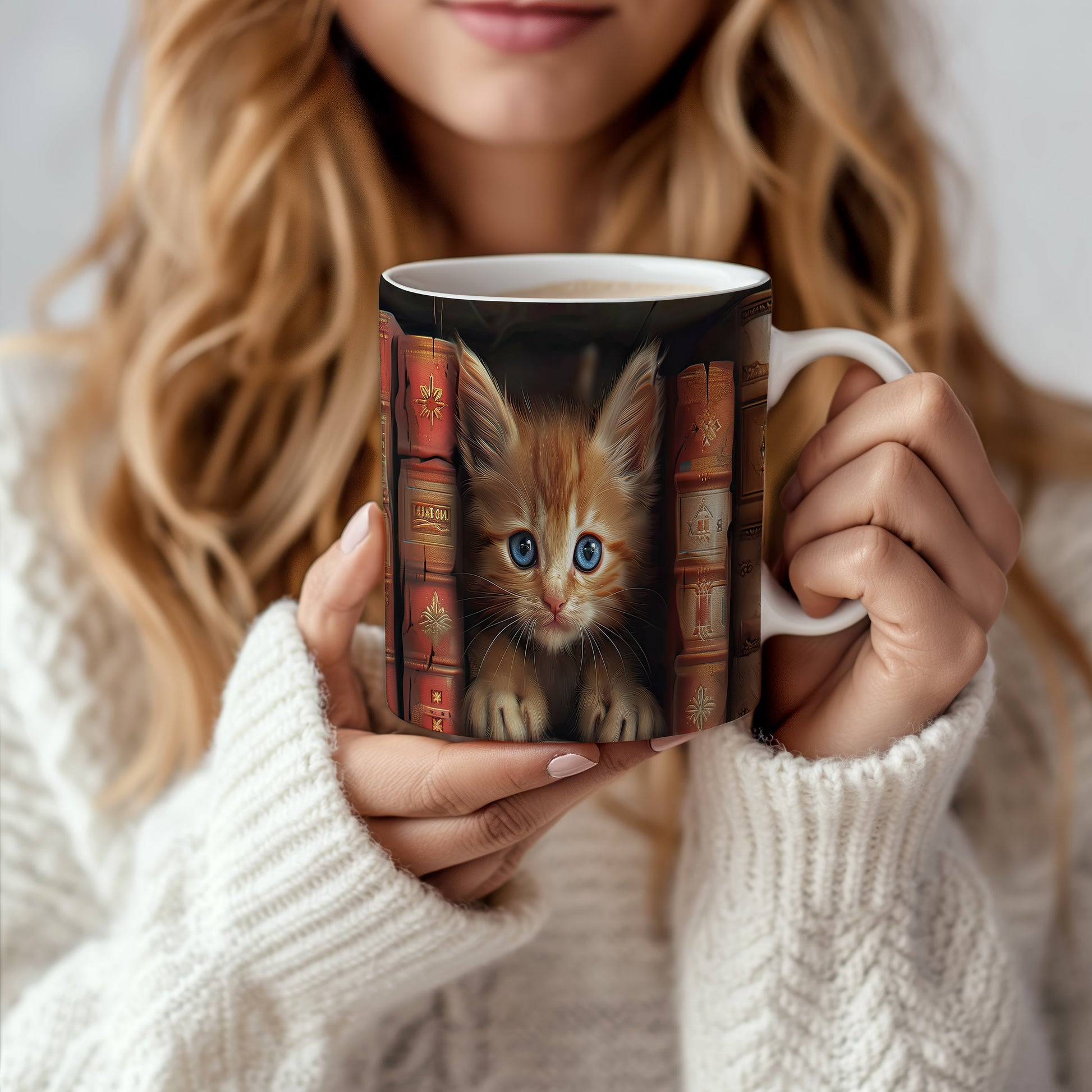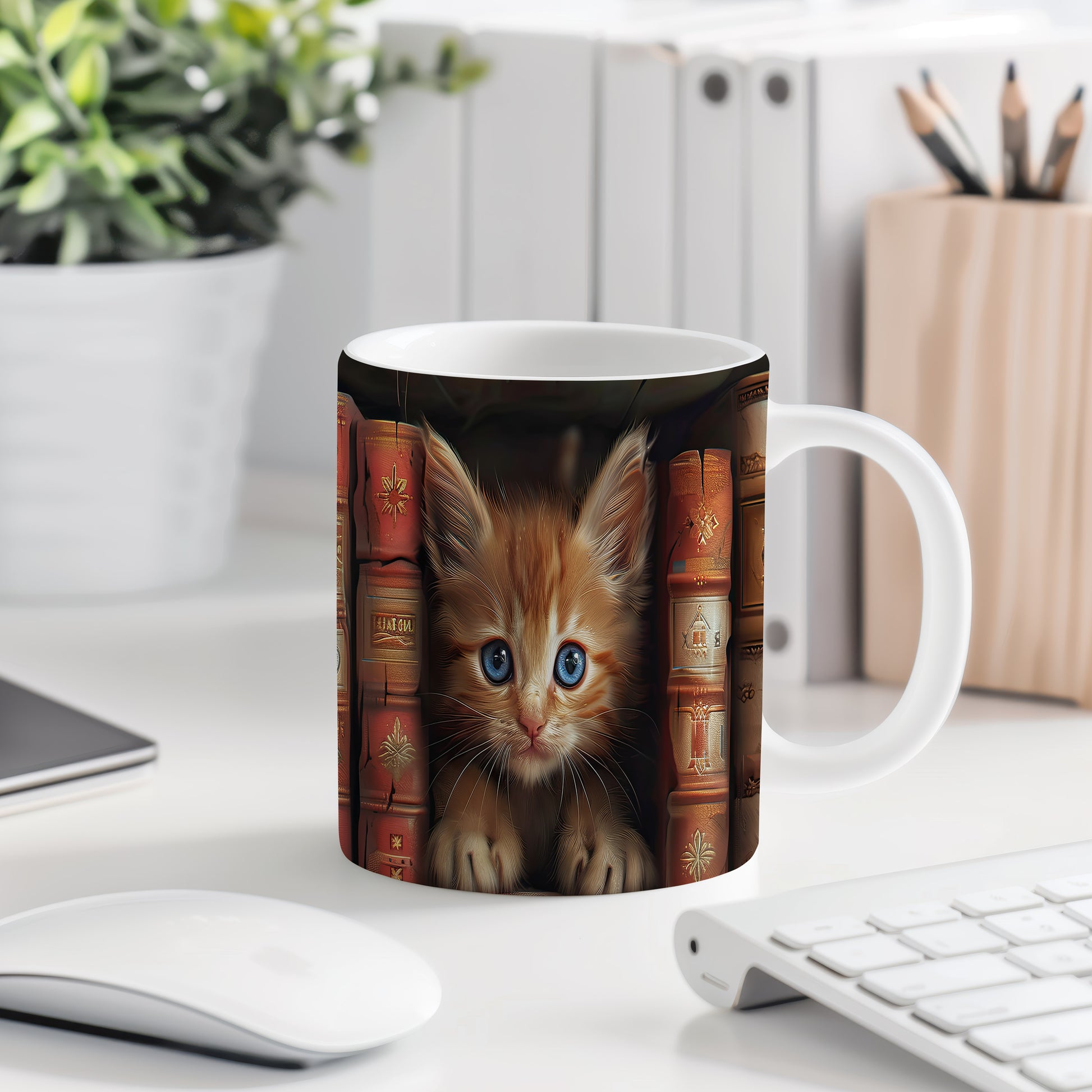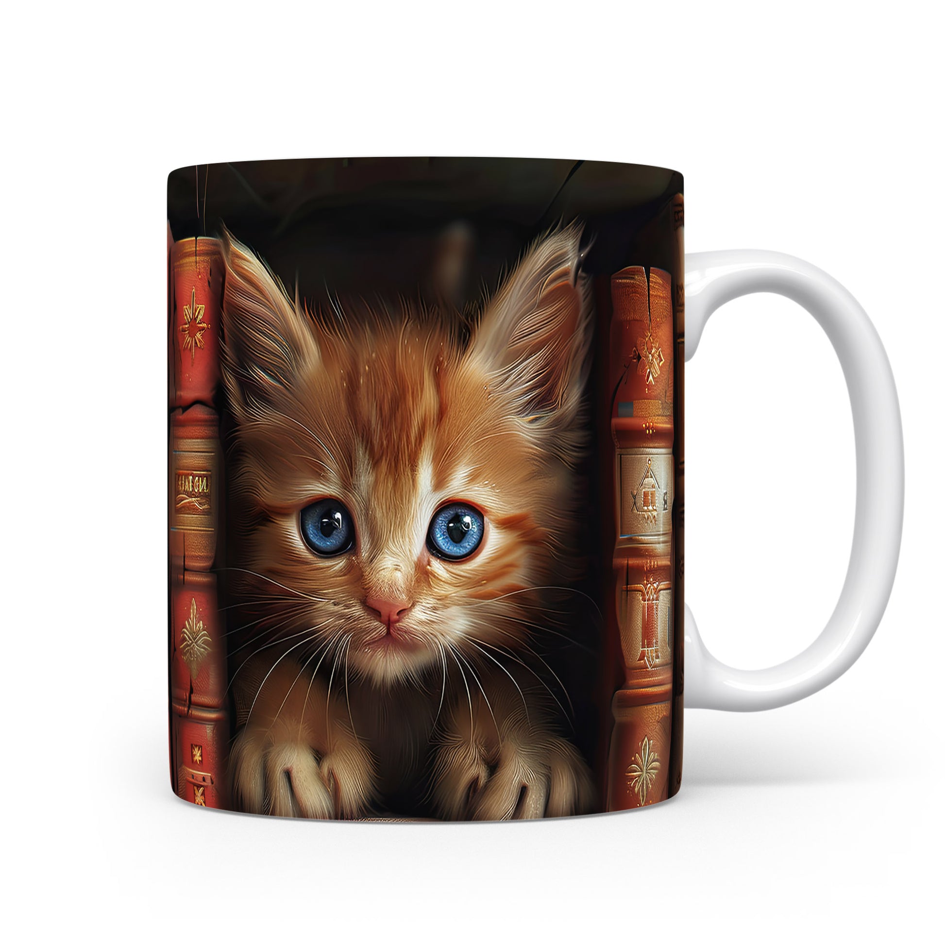 Hrnek zobrazuje roztomilé koťátko s velkýma modrýma očima, které se dívá zpoza knih. Tento hrnek je ideální pro milovníky koček a skvělým dárkem pro každého, kdo má rád zvířata. Materiál: keramika. Objem: 330 ml. Vhodné do myčky i mikrovlnky. Používání tohoto hrnku přináší radost a útulnost do každého dne.