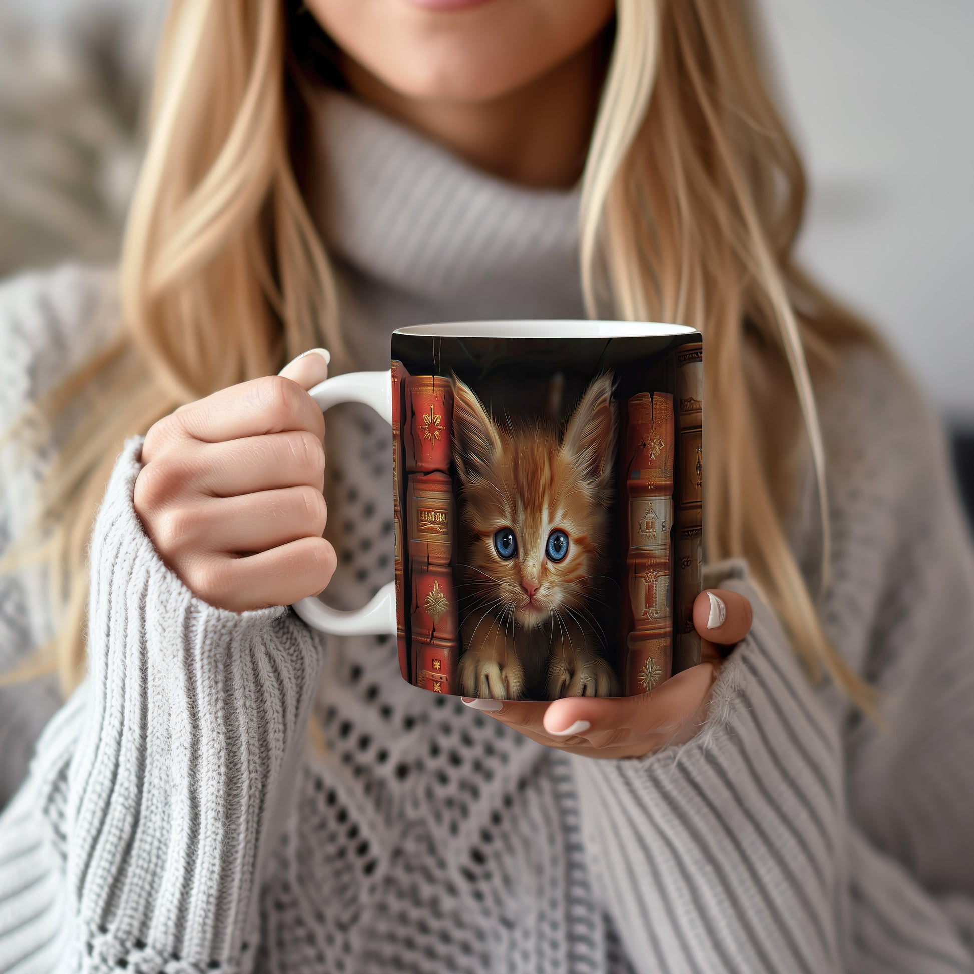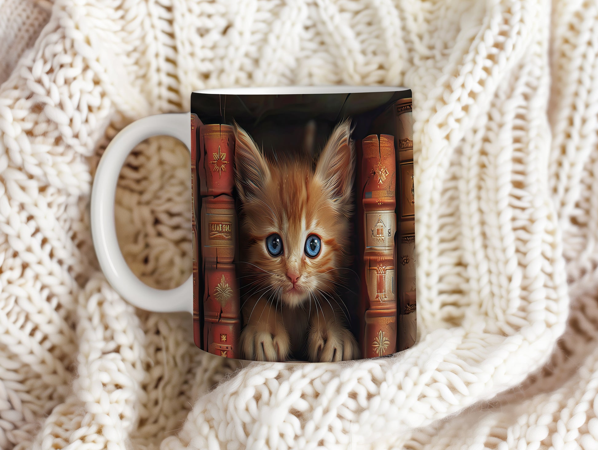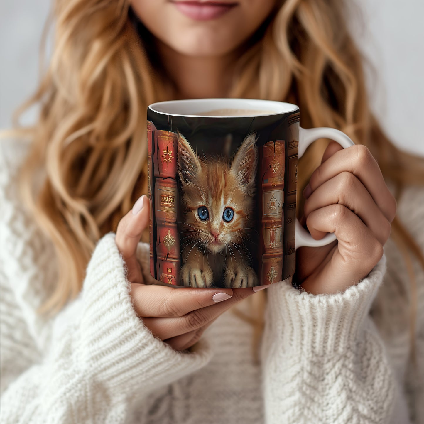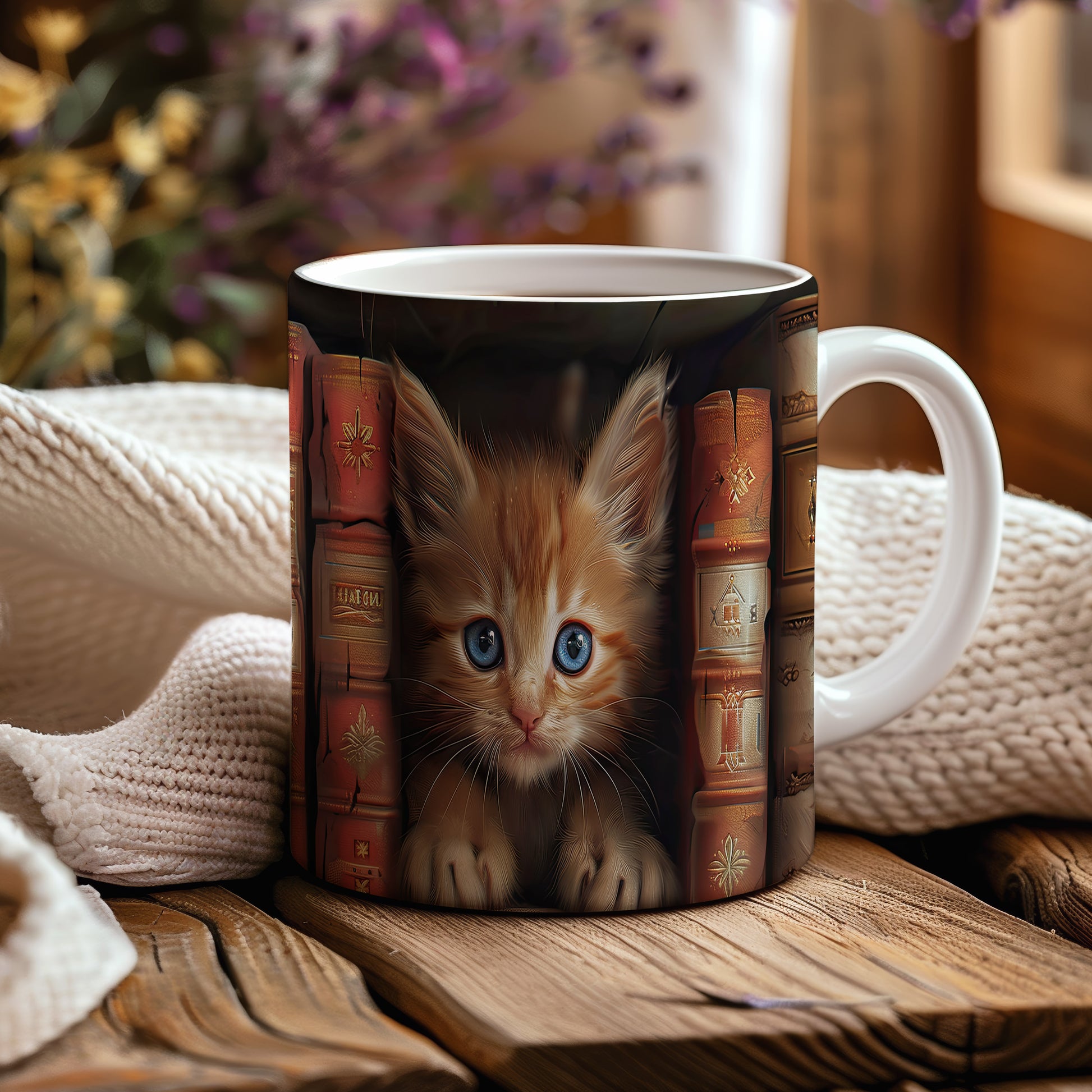 Hrnek zobrazuje roztomilé koťátko s velkýma modrýma očima, které se dívá zpoza knih. Tento hrnek je ideální pro milovníky koček a skvělým dárkem pro každého, kdo má rád zvířata. Materiál: keramika. Objem: 330 ml. Vhodné do myčky i mikrovlnky. Používání tohoto hrnku přináší radost a útulnost do každého dne.