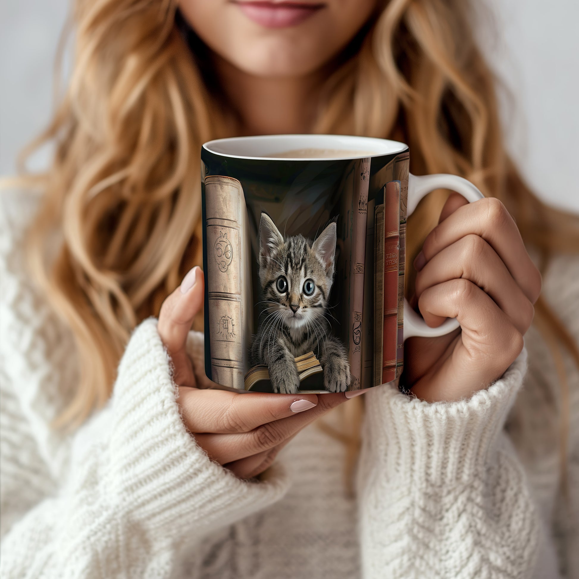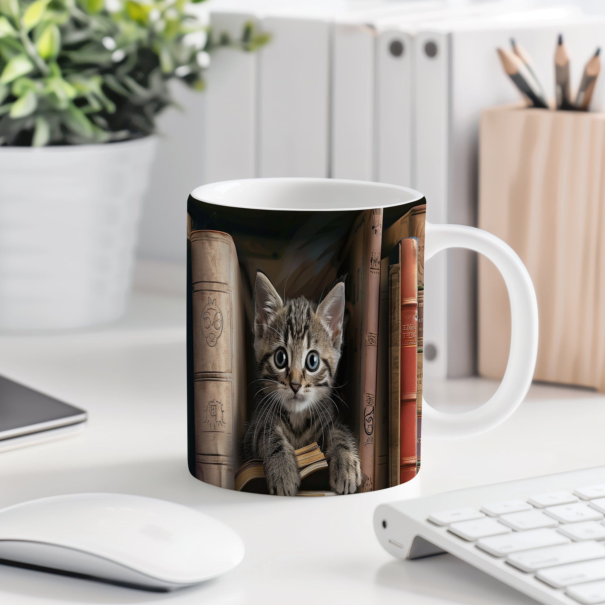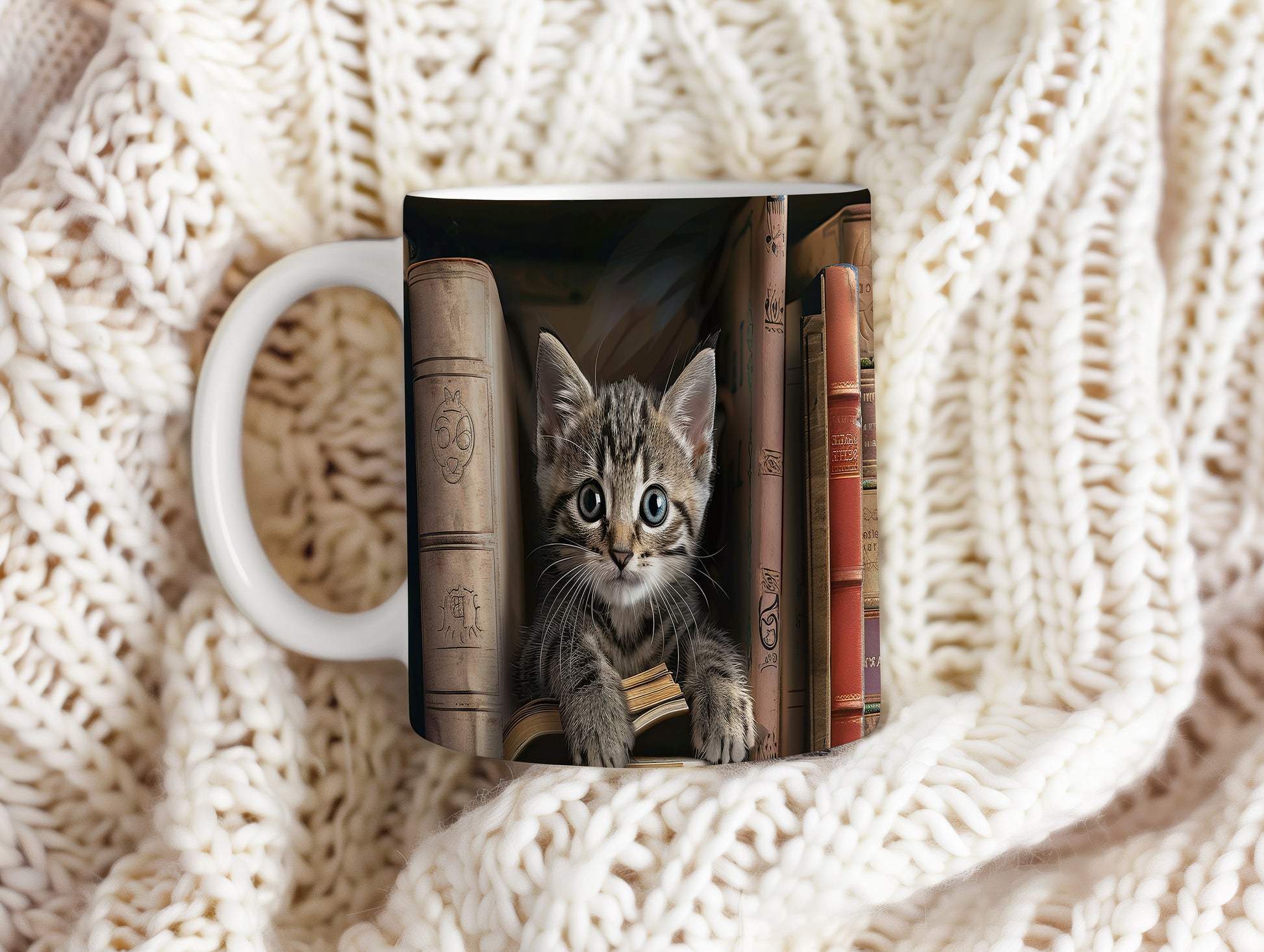 Hrnek s roztomilým koťátkem mezi knihami – roztomilým motivem