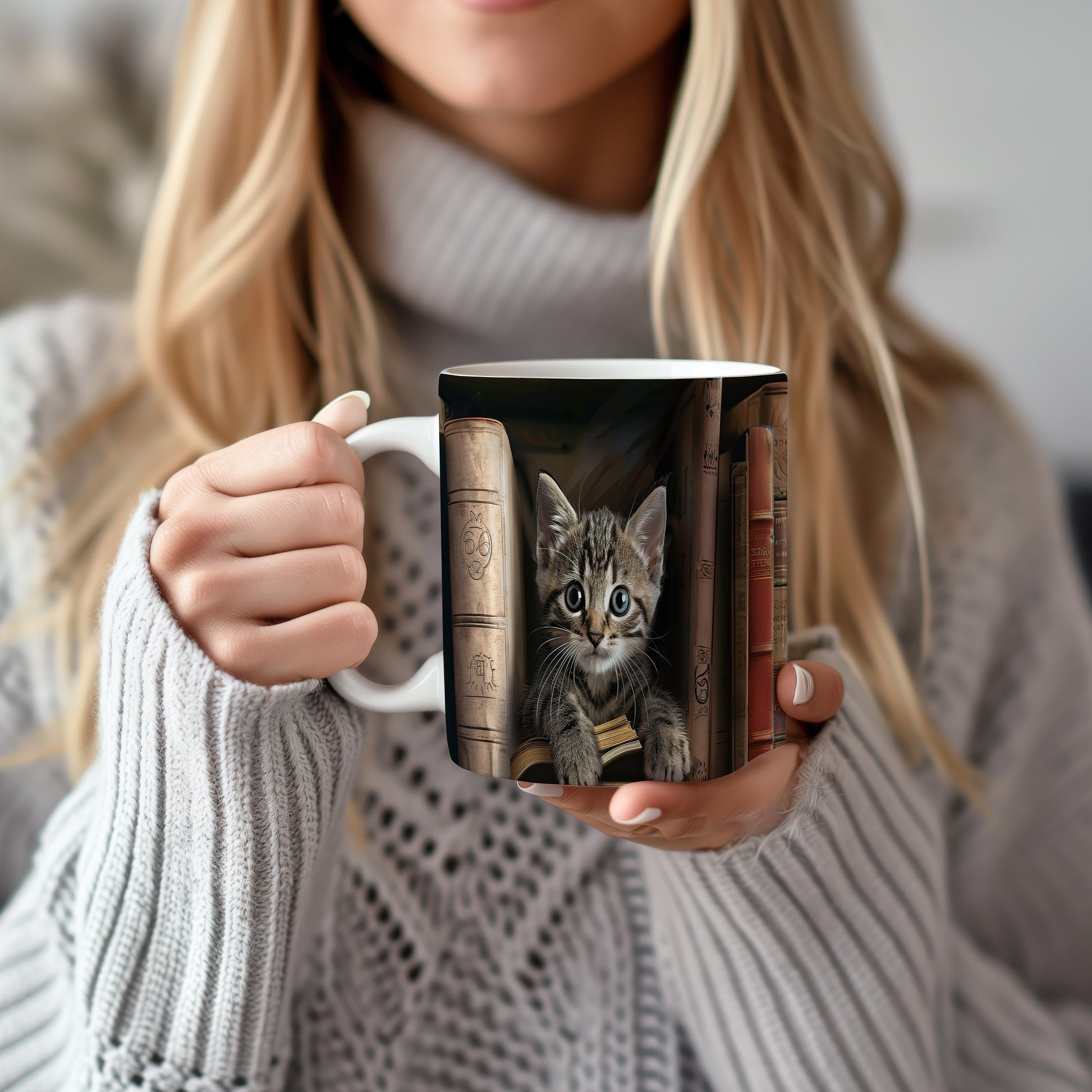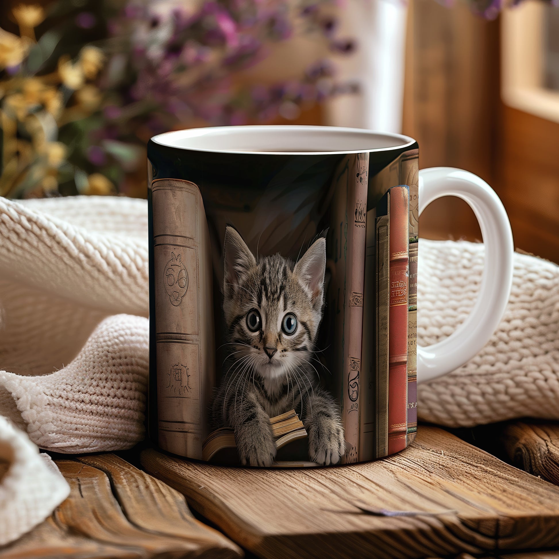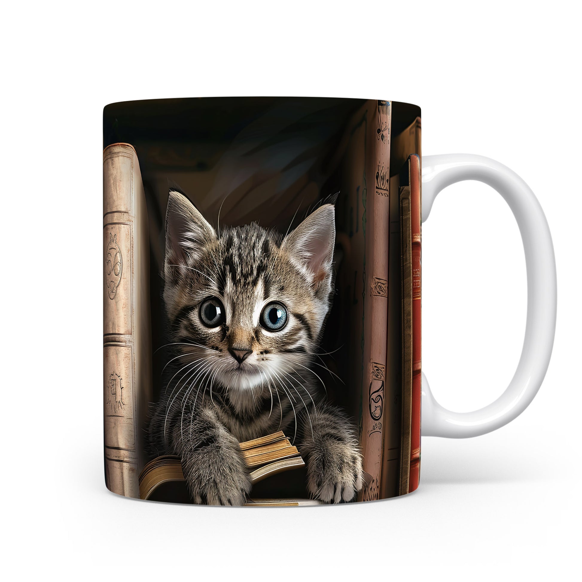 Hrnek s roztomilým koťátkem mezi knihami – roztomilým motivem