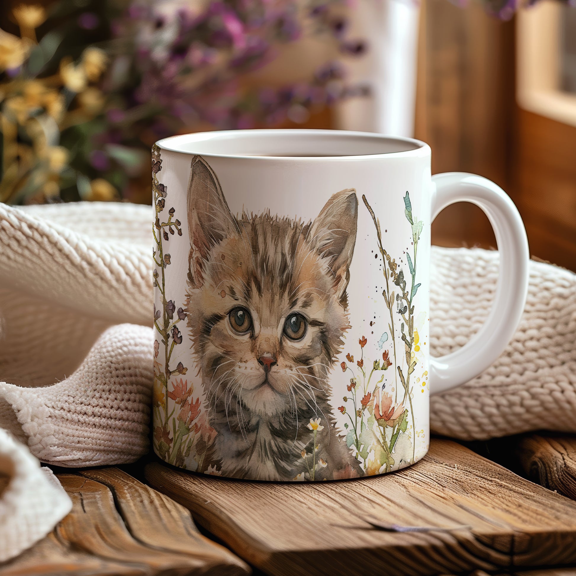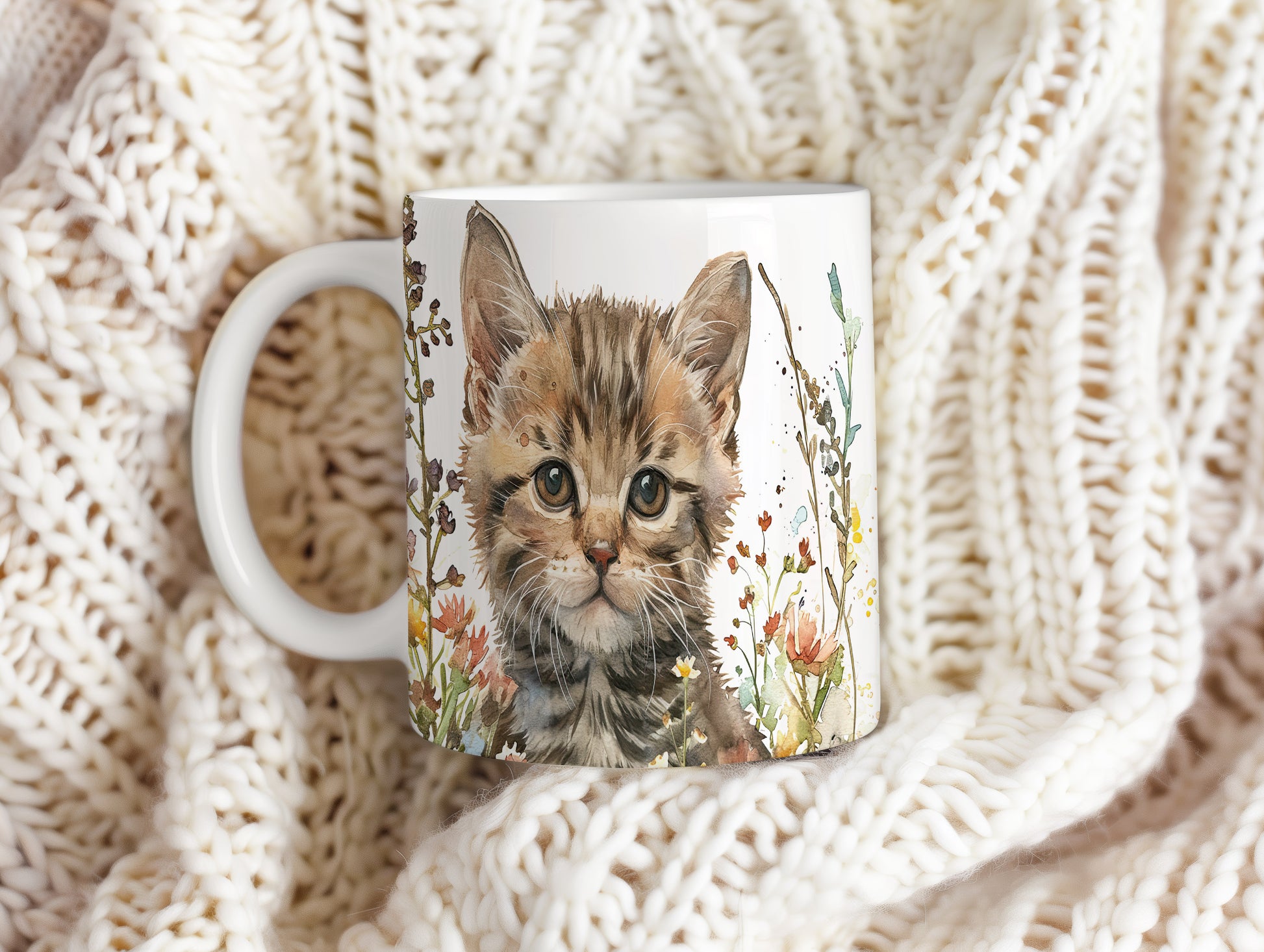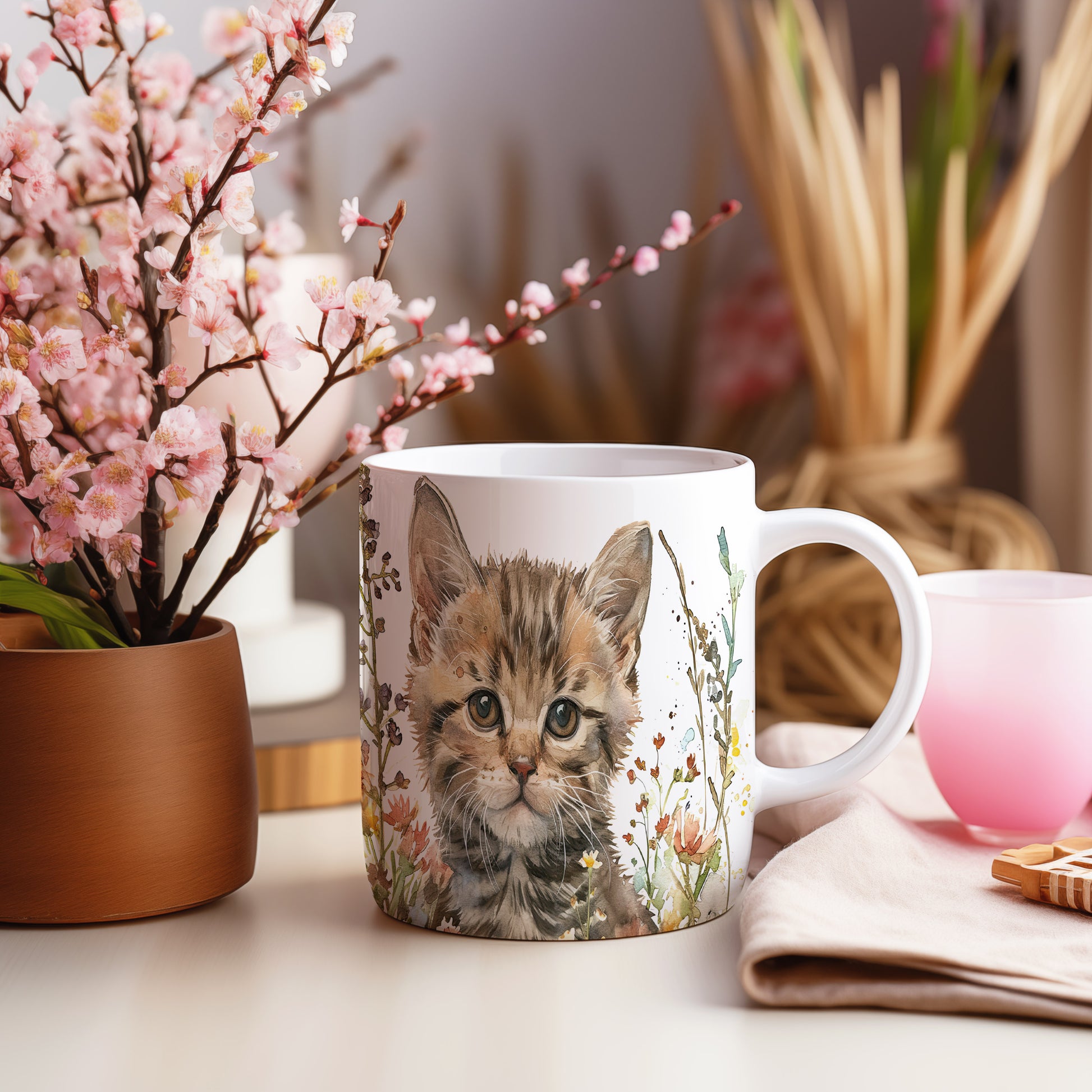 Hrnek s roztomilým koťátkem v květinách