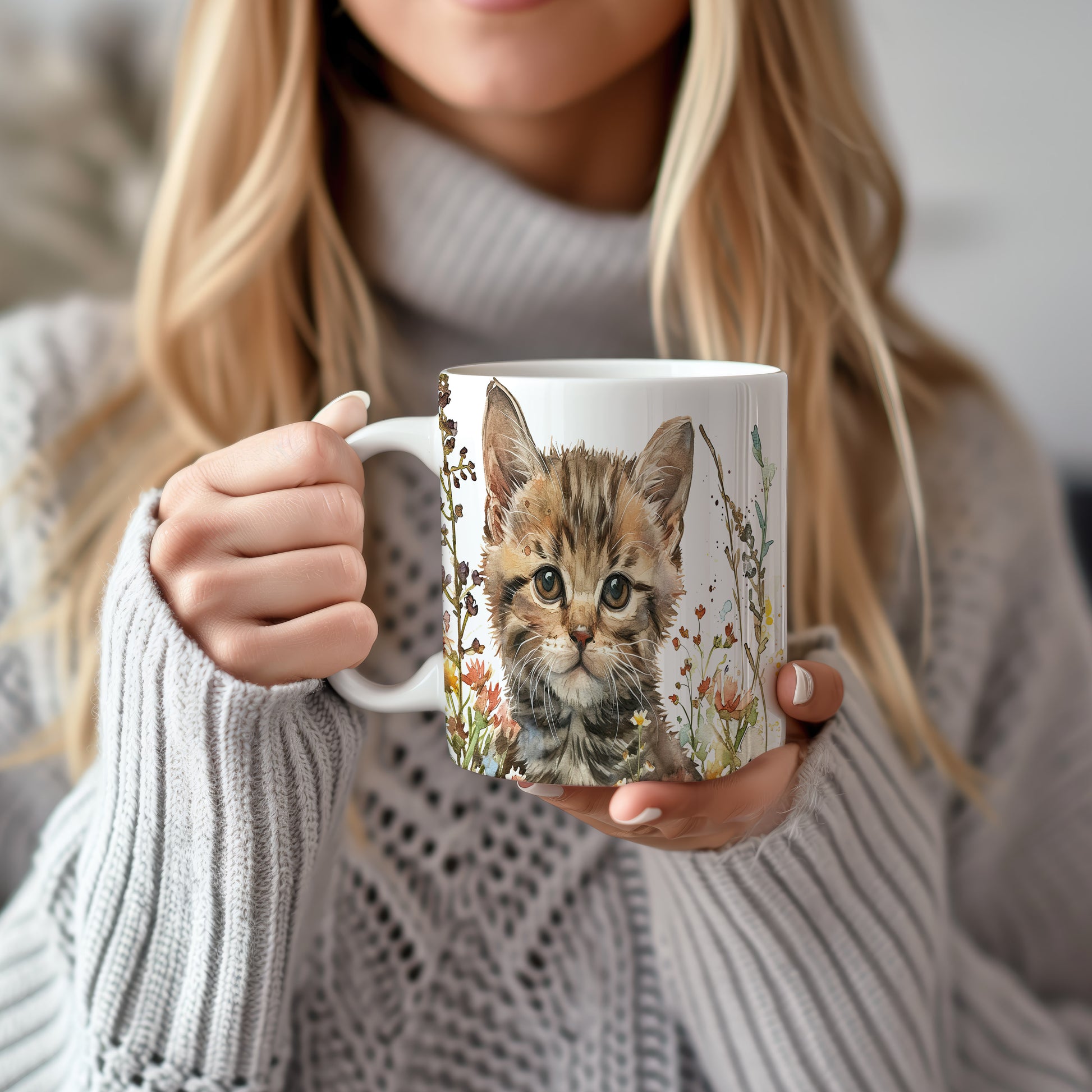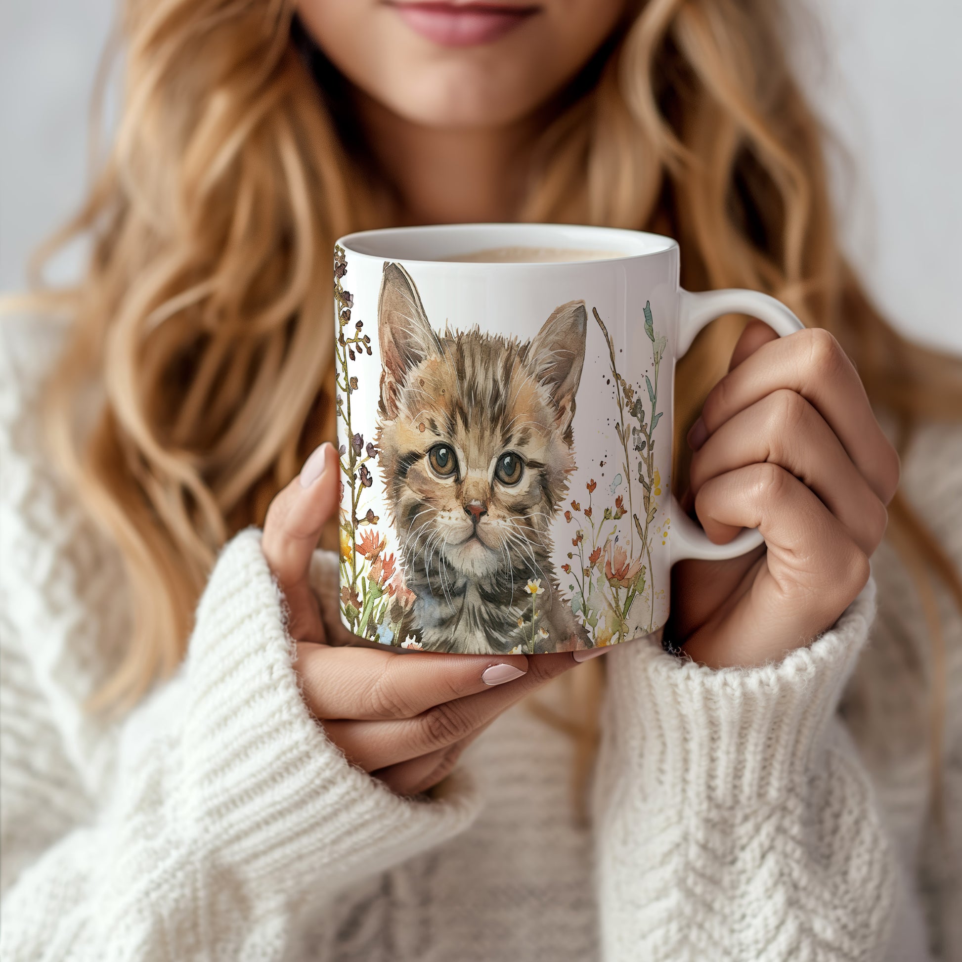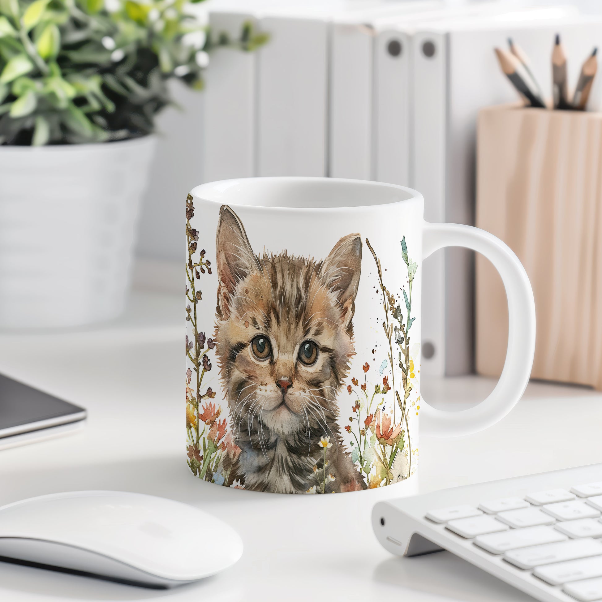 Hrnek s roztomilým koťátkem v květinách