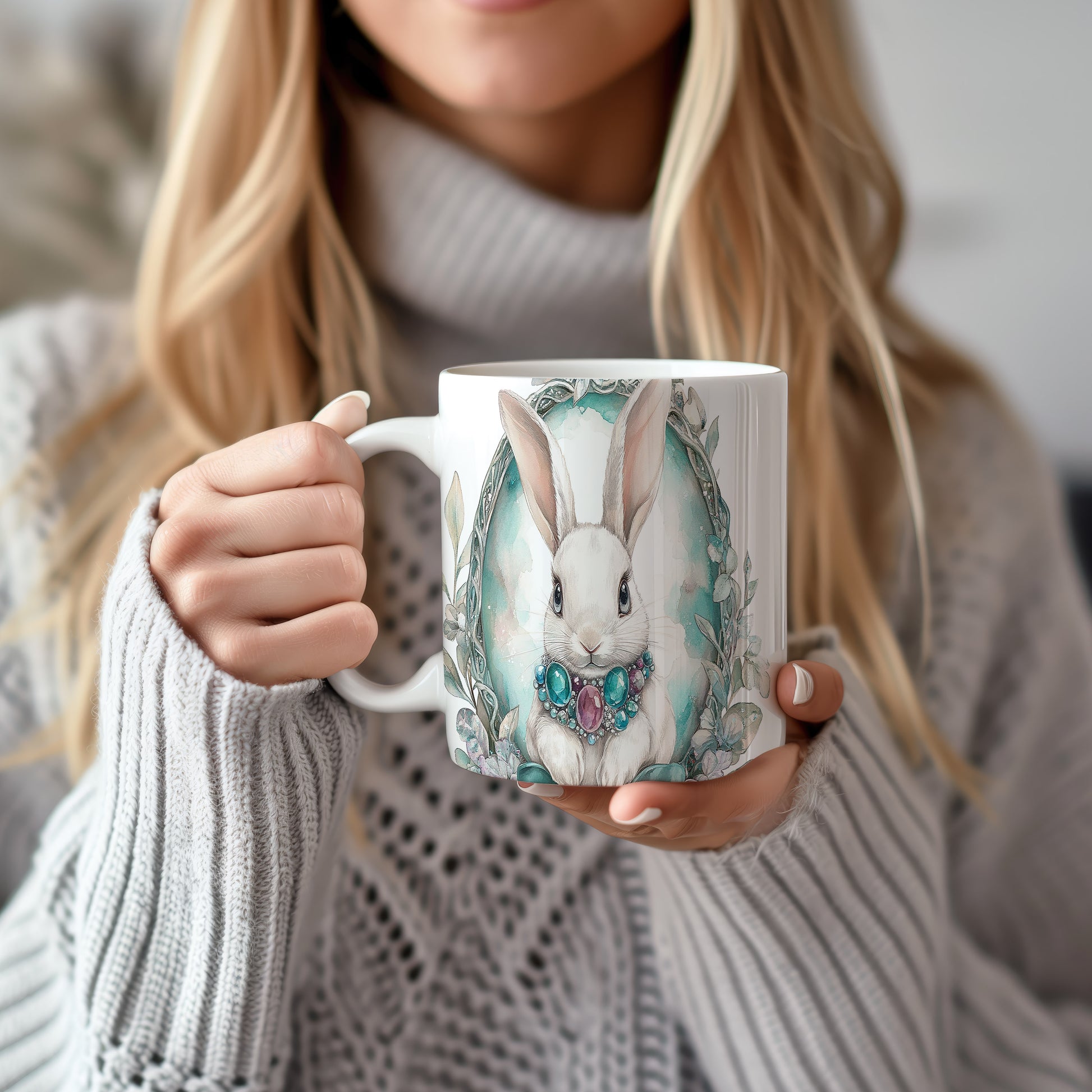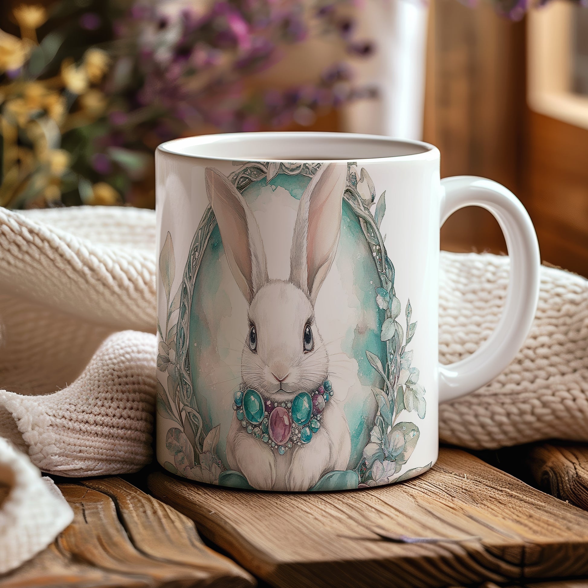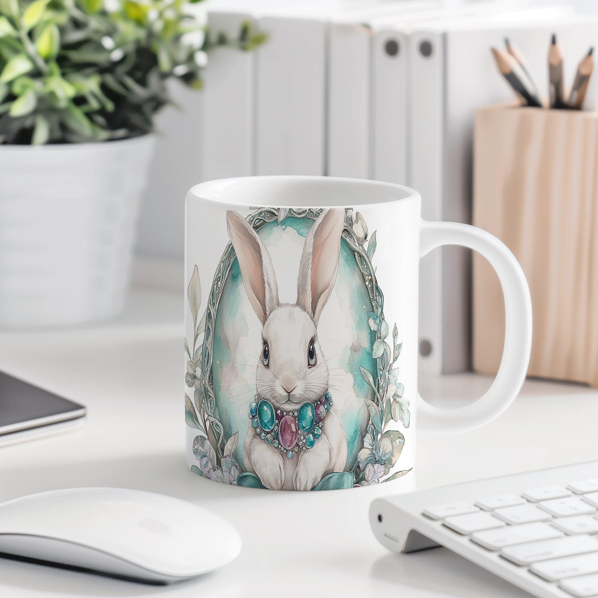 Hrnek s roztomilým králíkem a šperky je ideální volbou pro milovníky zvířat a pastelových barev. Tento hrnek potěší každého, kdo hledá originální dárek pro své blízké. Materiál: keramika. Objem: 330 ml. Vhodné do myčky i mikrovlnky. Používání tohoto hrnku přináší radost a zlepšuje každodenní pitný rituál.