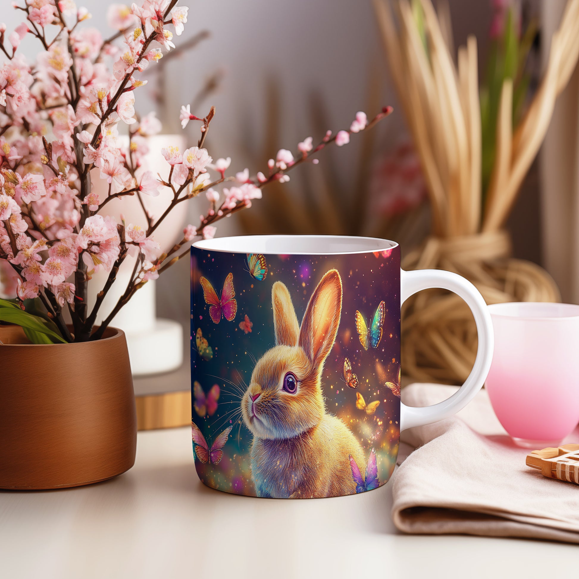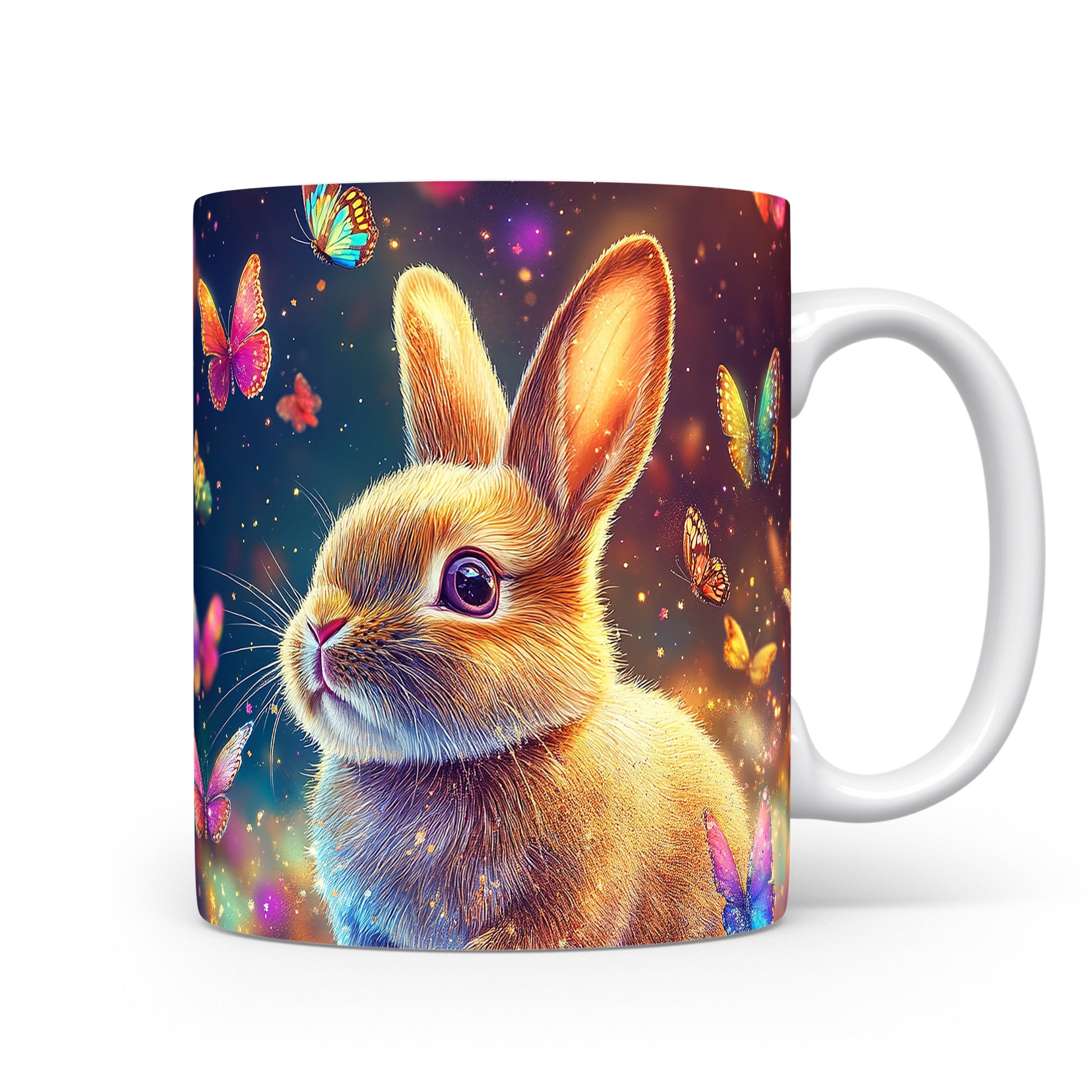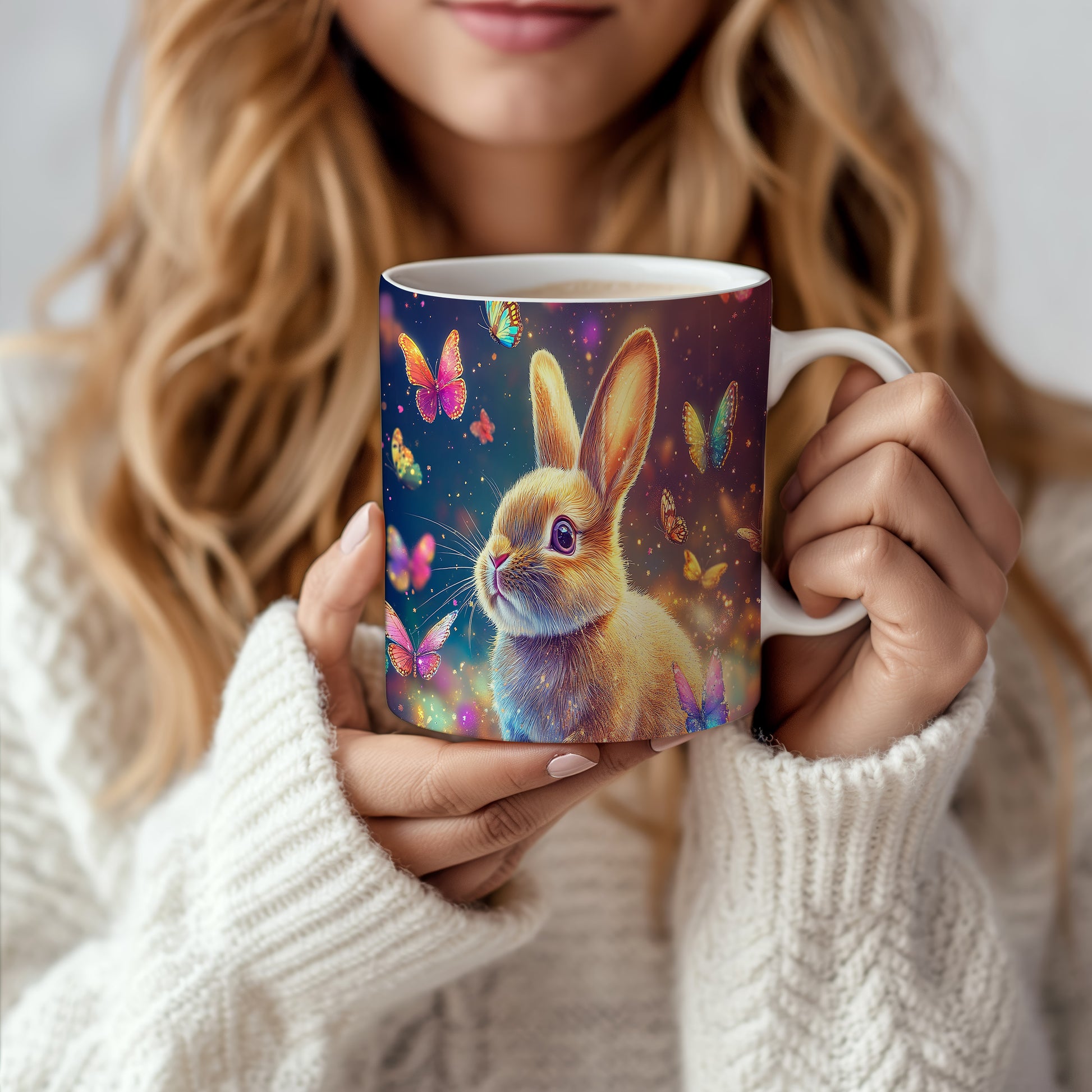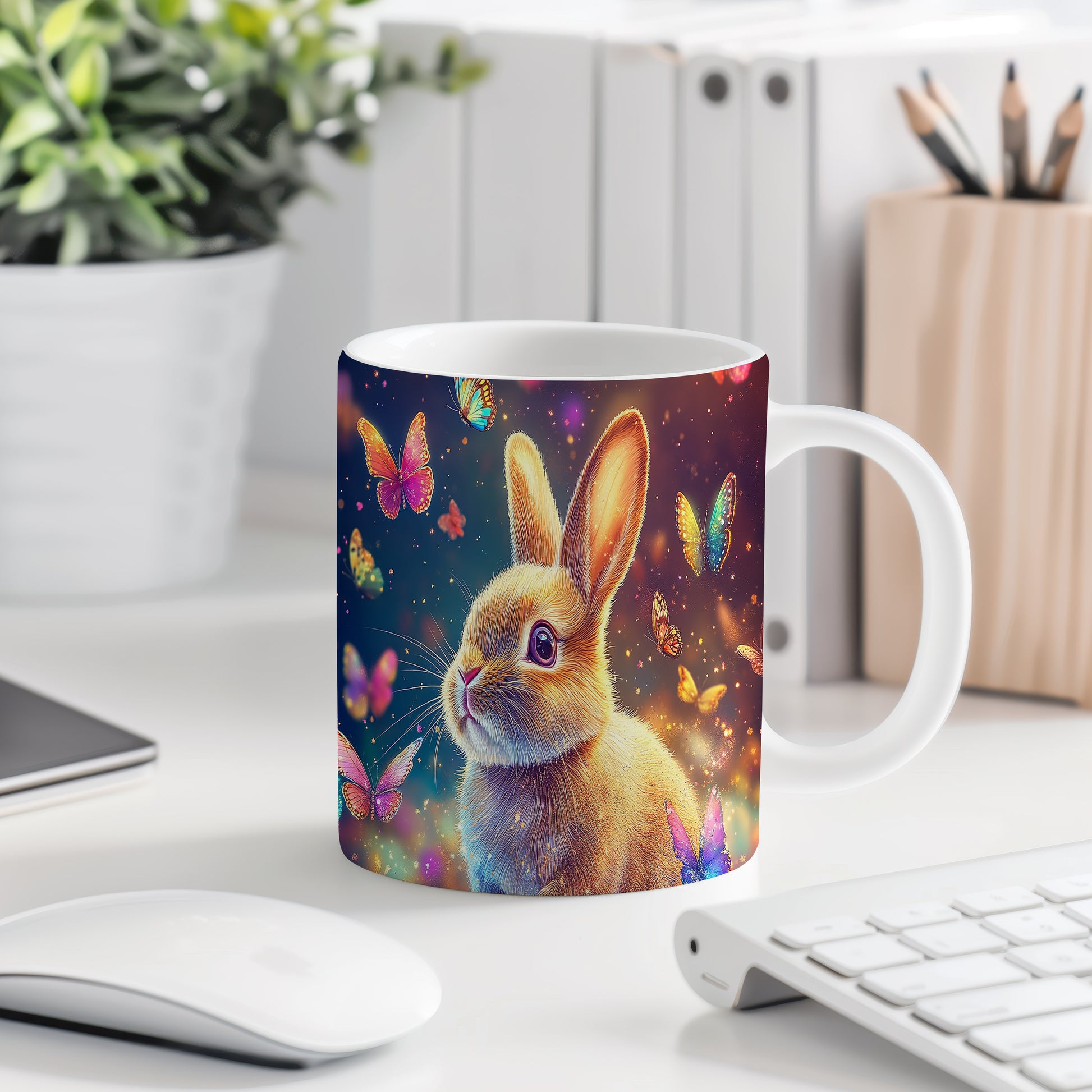 Na hrnku je zobrazen roztomilý králík obklopený barevnými motýly. Tento hrnek je ideální pro milovníky zvířat a skvělý tip na dárek pro děti nebo přátele. Materiál: keramika. Objem: 330 ml. Vhodné do myčky i mikrovlnky. Používání tohoto hrnku přináší radost a oživí každé ráno.