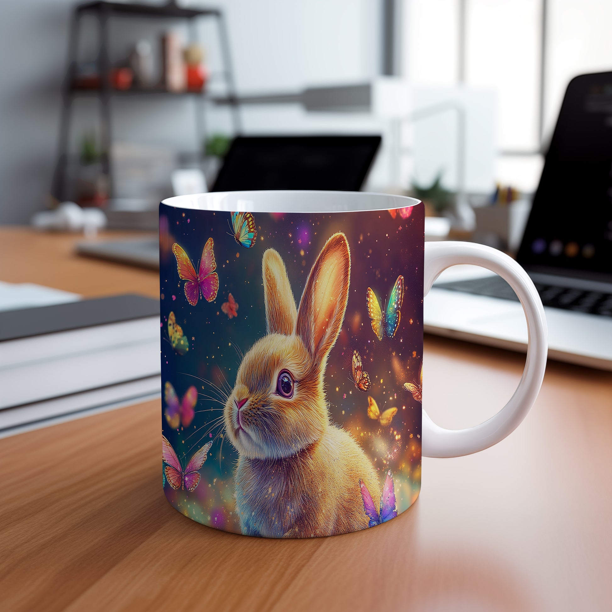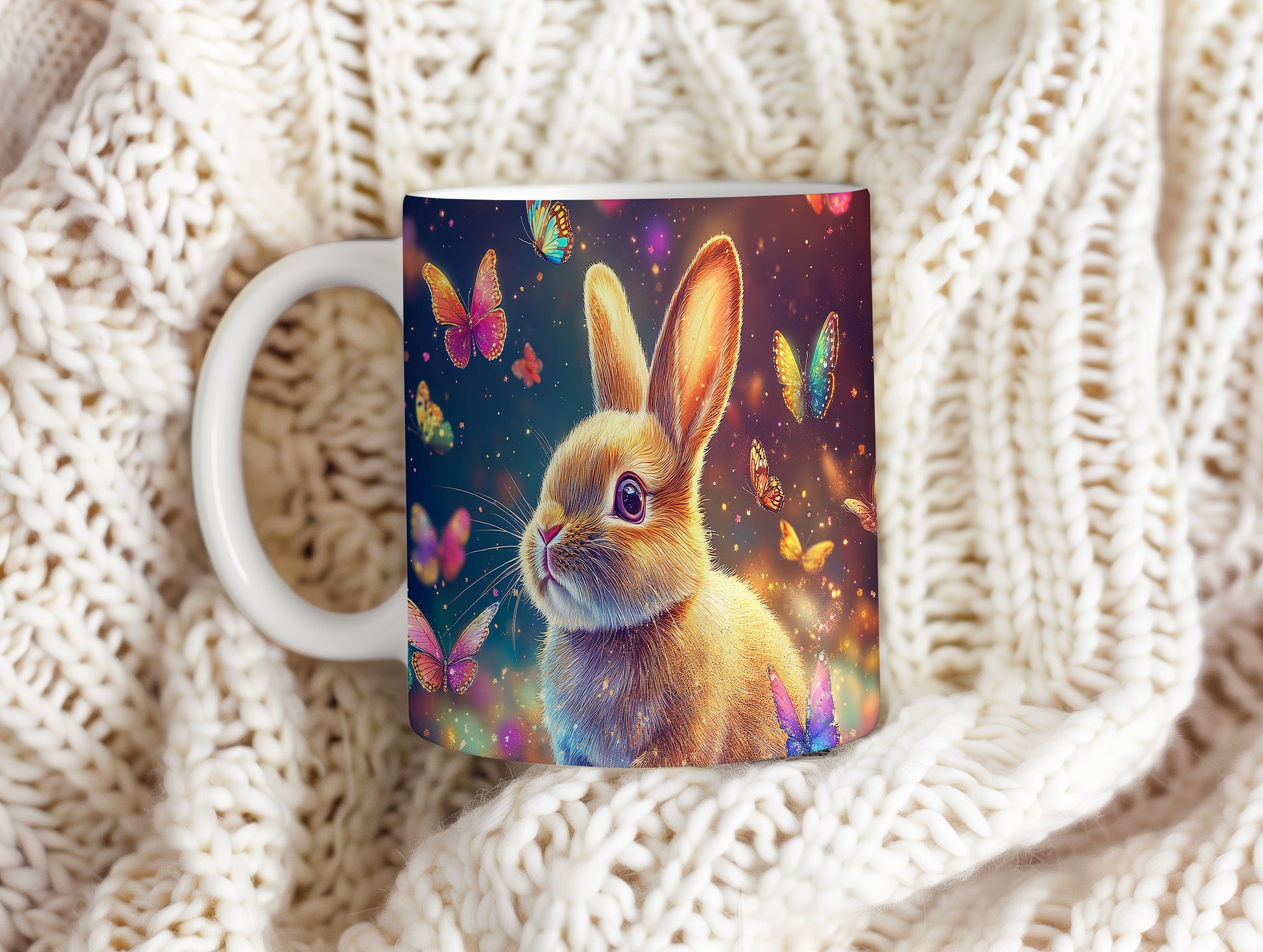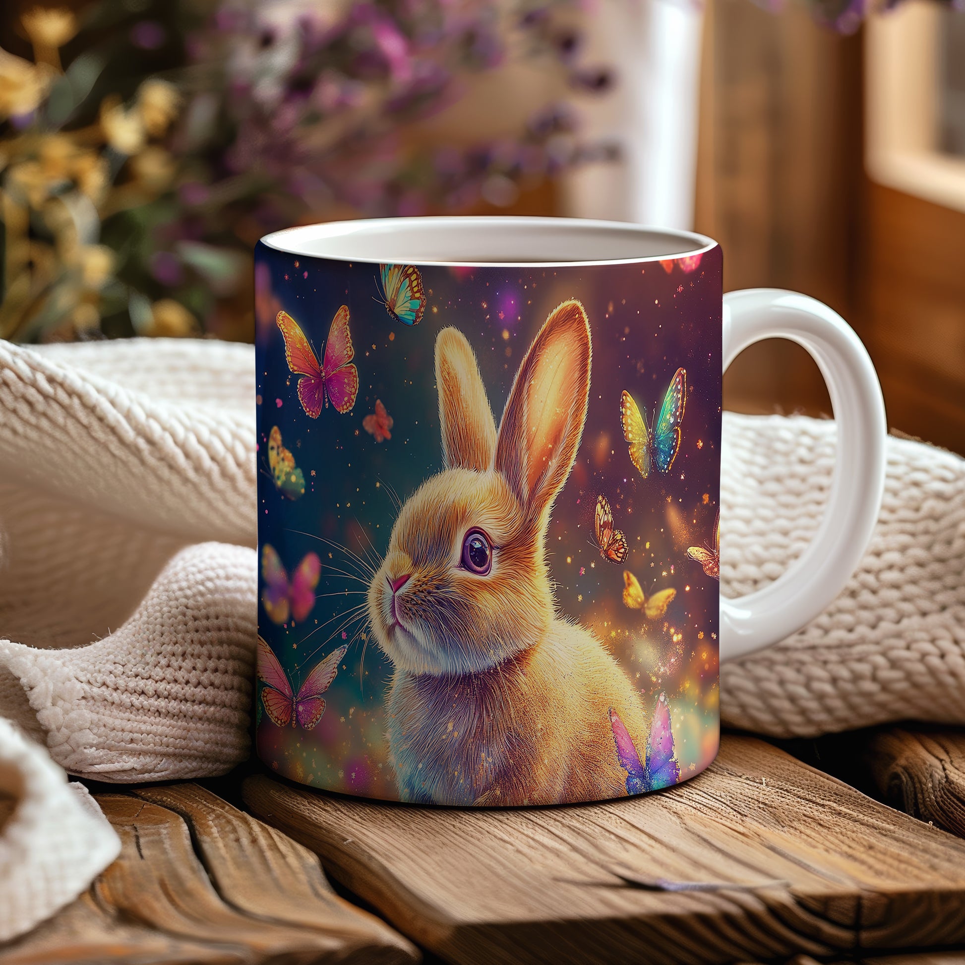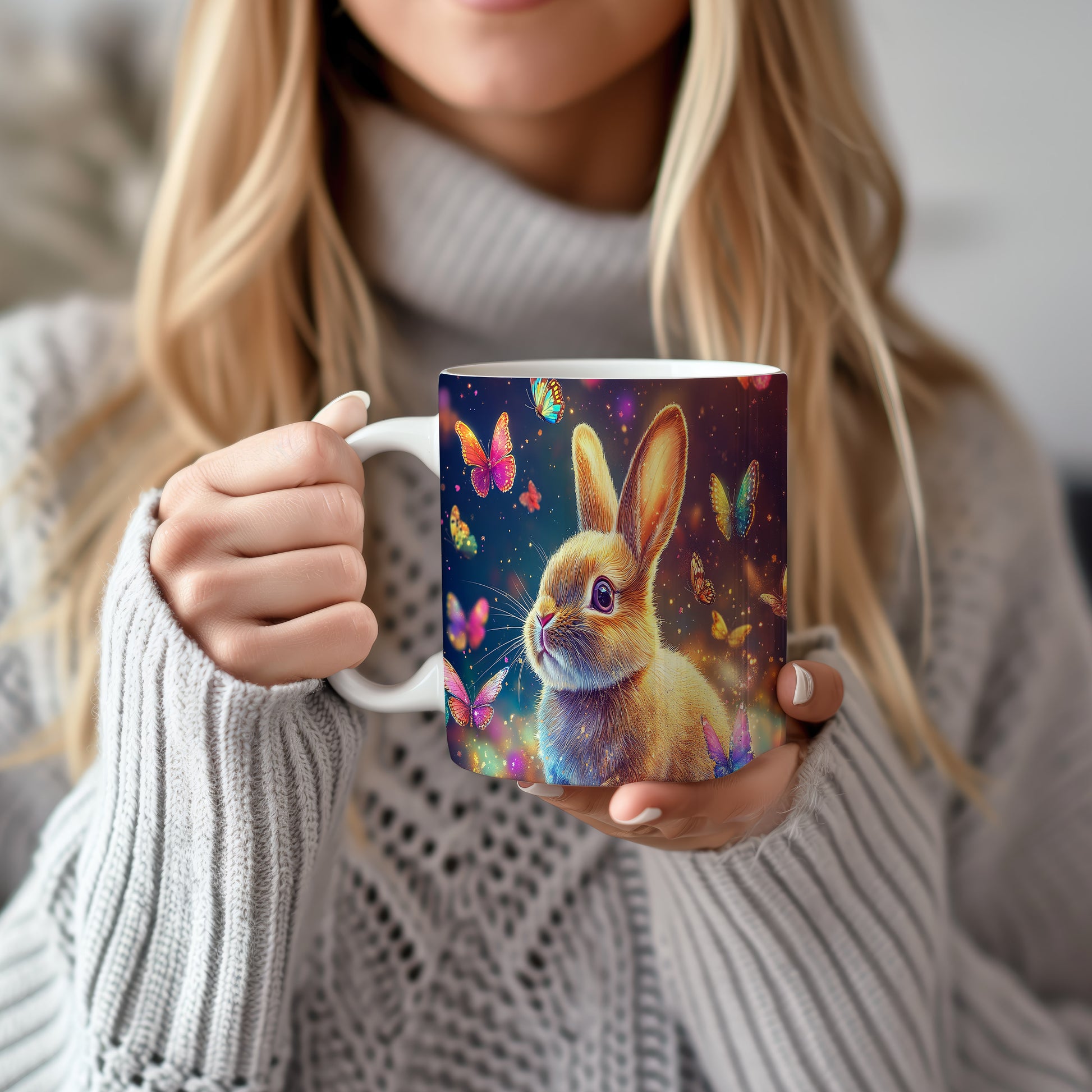 Na hrnku je zobrazen roztomilý králík obklopený barevnými motýly. Tento hrnek je ideální pro milovníky zvířat a skvělý tip na dárek pro děti nebo přátele. Materiál: keramika. Objem: 330 ml. Vhodné do myčky i mikrovlnky. Používání tohoto hrnku přináší radost a oživí každé ráno.