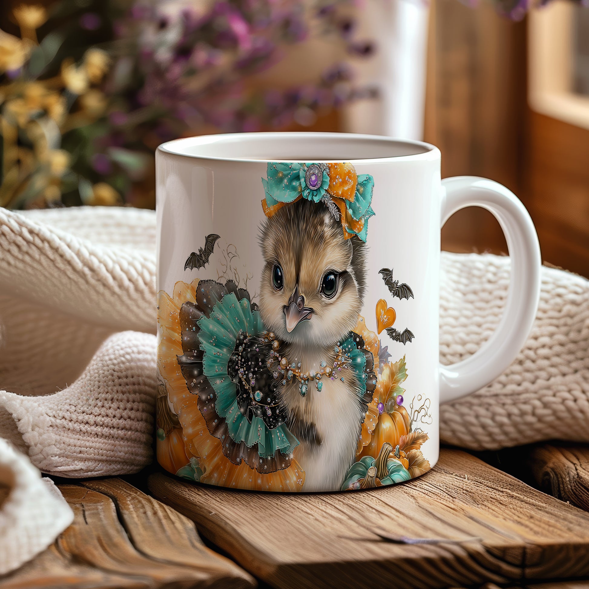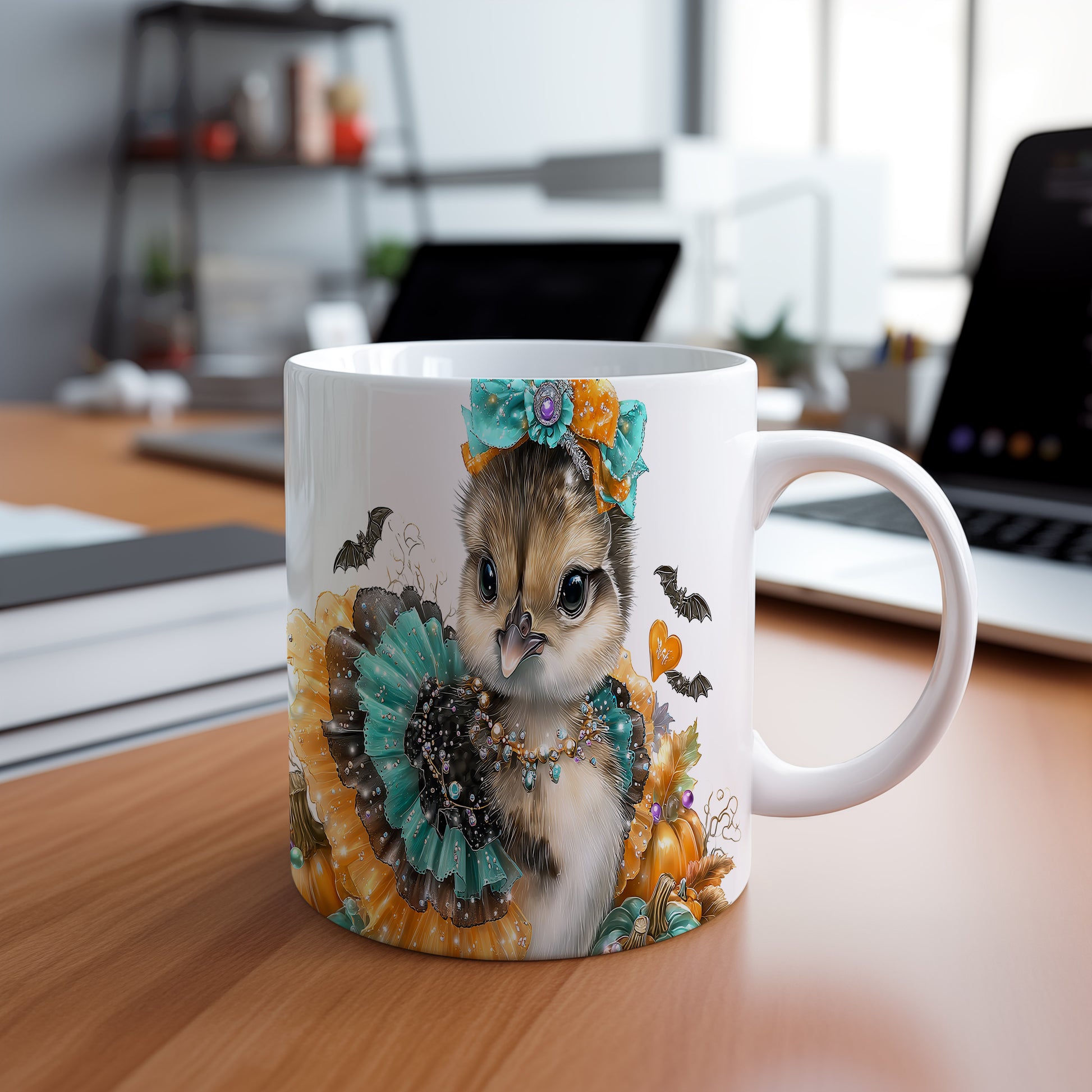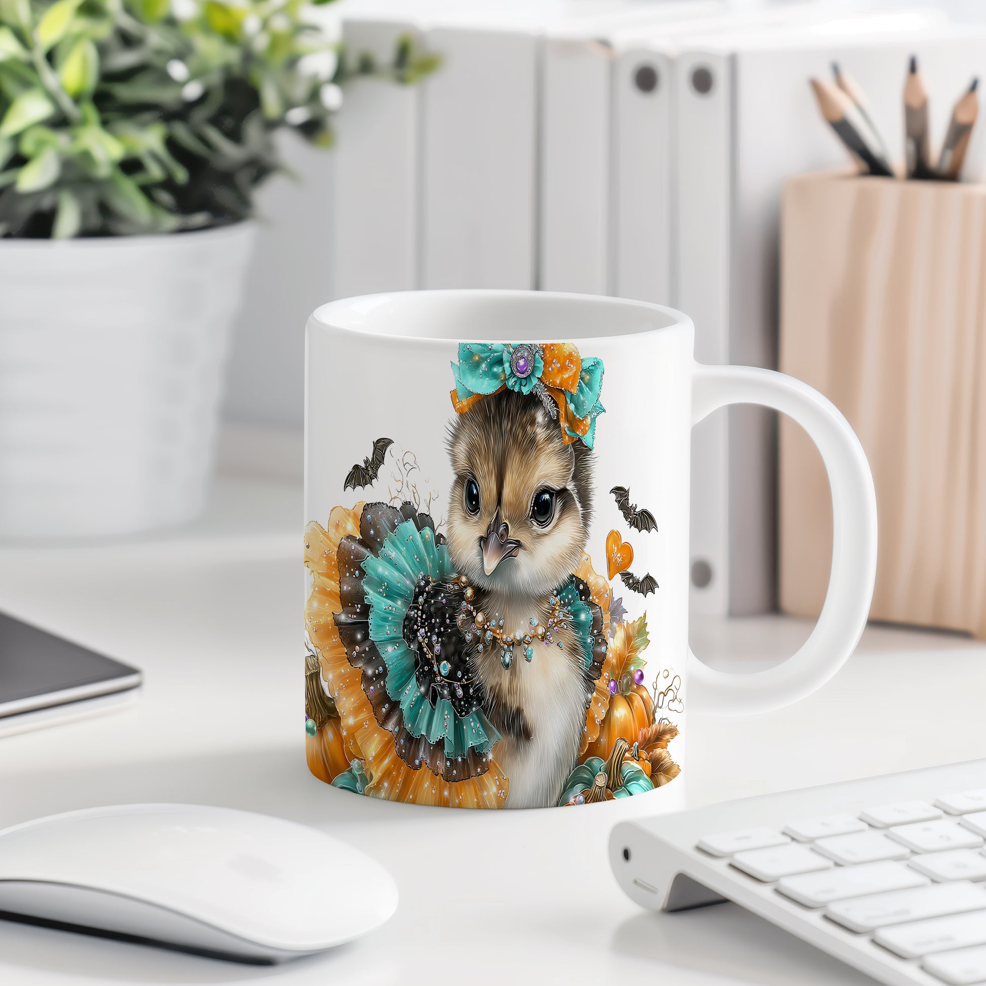 Hrnek s roztomilým kuřátkem v kostýmu