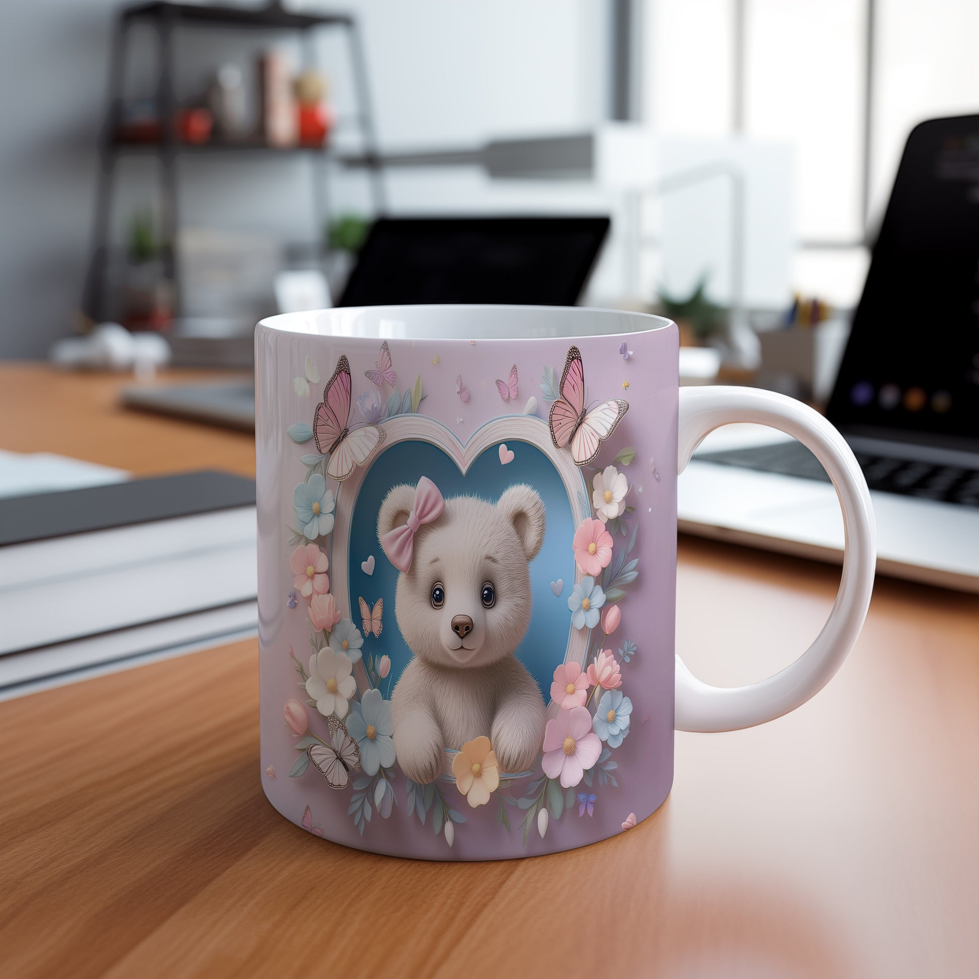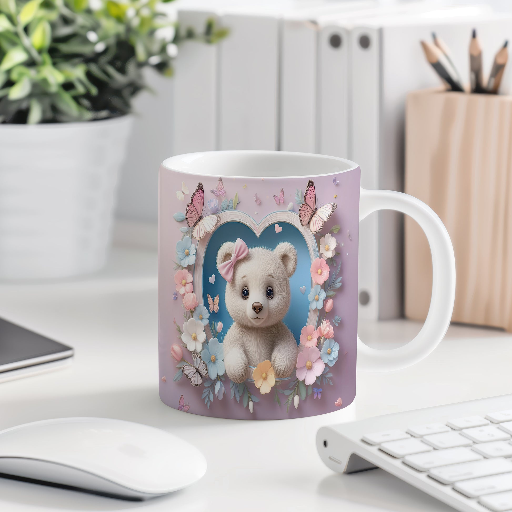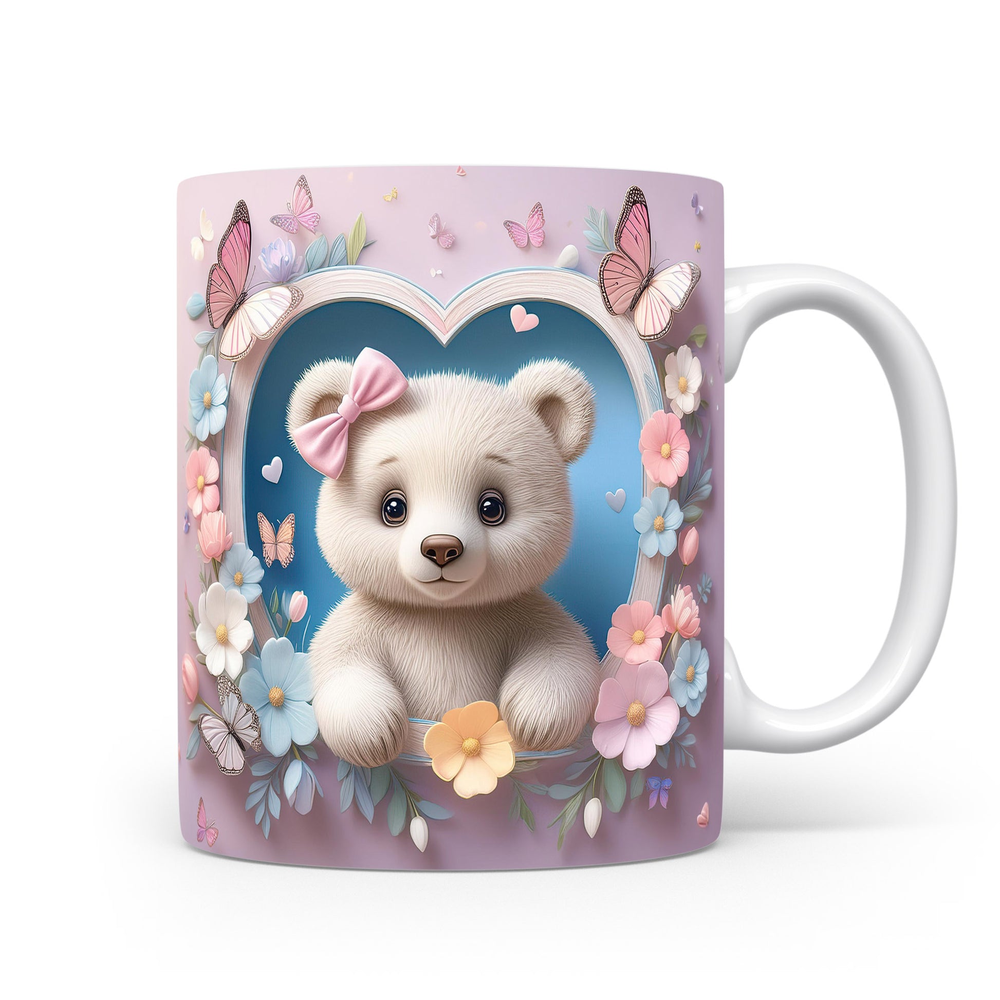 Hrnek s motivem roztomilého medvídka obklopeného květinami a motýli. Tento hrnek je ideální pro všechny, kteří mají rádi barevné a hravé designy. Skvělý tip na dárek pro děti nebo milovníky medvídků. Materiál: keramika. Objem: 330 ml. Vhodné do myčky i mikrovlnky. Používání tohoto hrnku přináší radost a útulnost do každého dne.