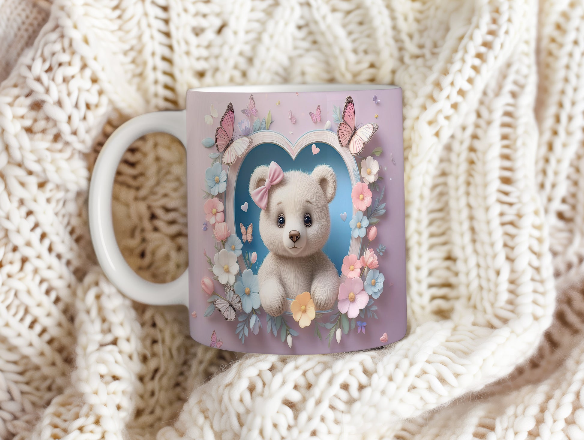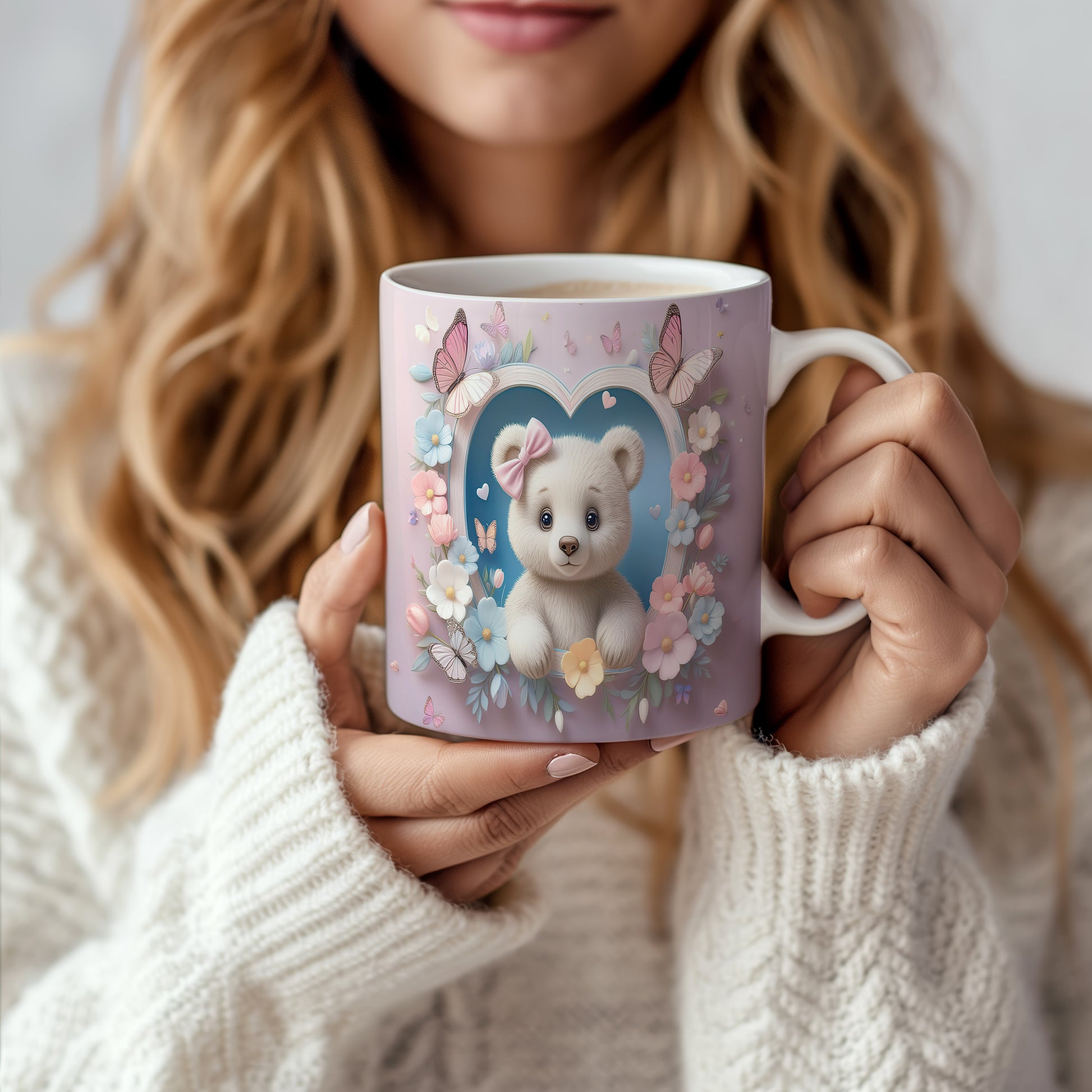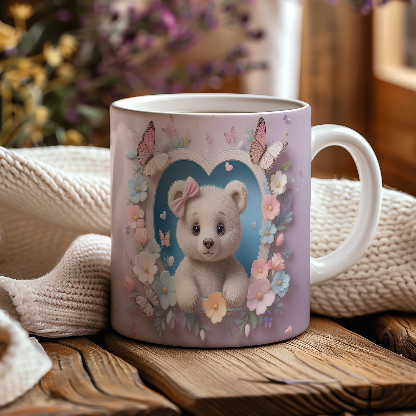 Hrnek s motivem roztomilého medvídka obklopeného květinami a motýli. Tento hrnek je ideální pro všechny, kteří mají rádi barevné a hravé designy. Skvělý tip na dárek pro děti nebo milovníky medvídků. Materiál: keramika. Objem: 330 ml. Vhodné do myčky i mikrovlnky. Používání tohoto hrnku přináší radost a útulnost do každého dne.