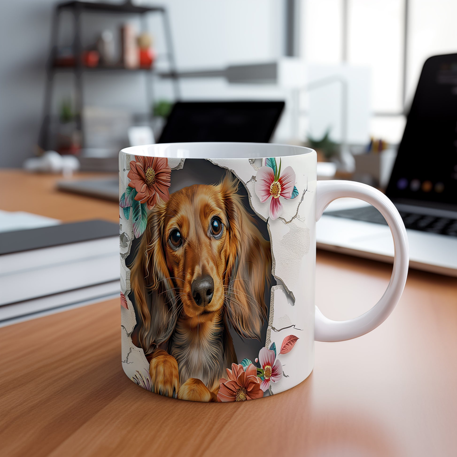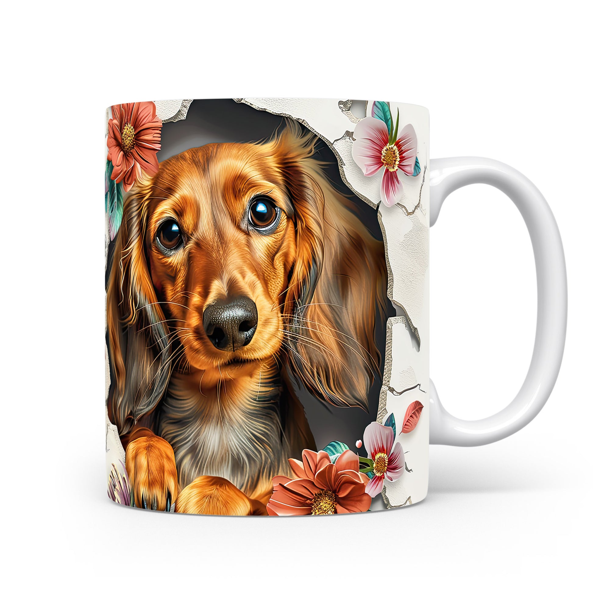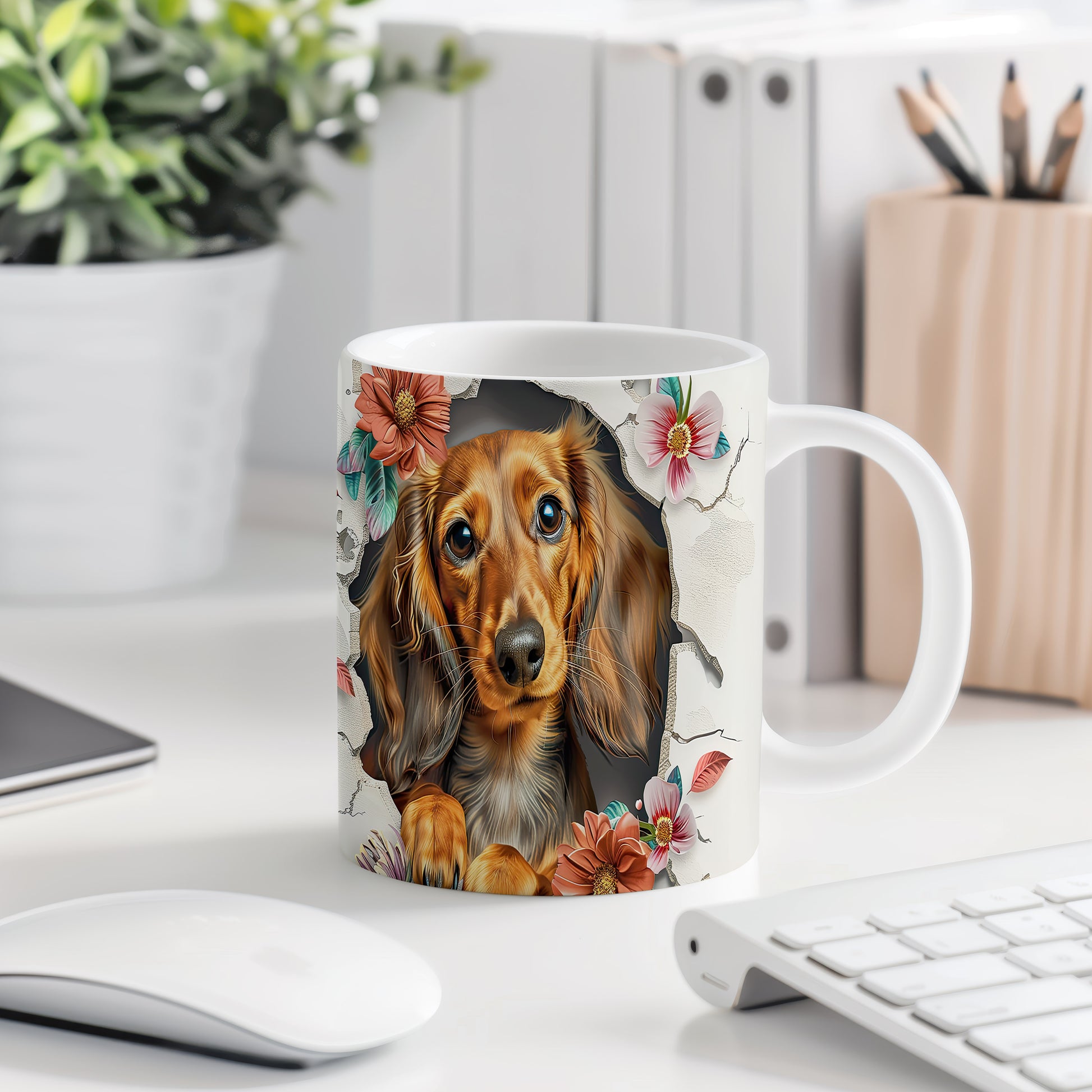 Hrnek zobrazuje roztomilého pejska s dlouhými ušima na pozadí květin. Tento hrnek je ideální pro milovníky psů a skvělým dárkem pro každého, kdo má rád zvířata. Materiál: keramika. Objem: 330 ml. Vhodné do myčky i mikrovlnky. Používáním tohoto hrnku si můžete vychutnat svůj oblíbený nápoj s úsměvem.