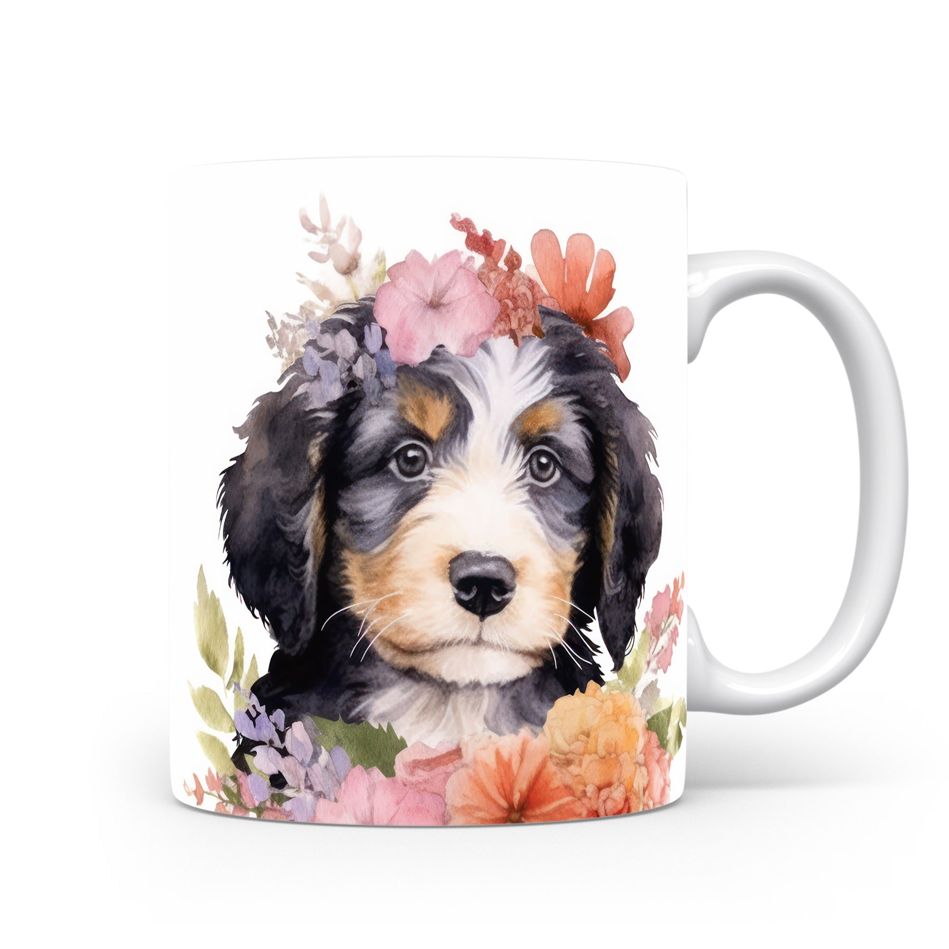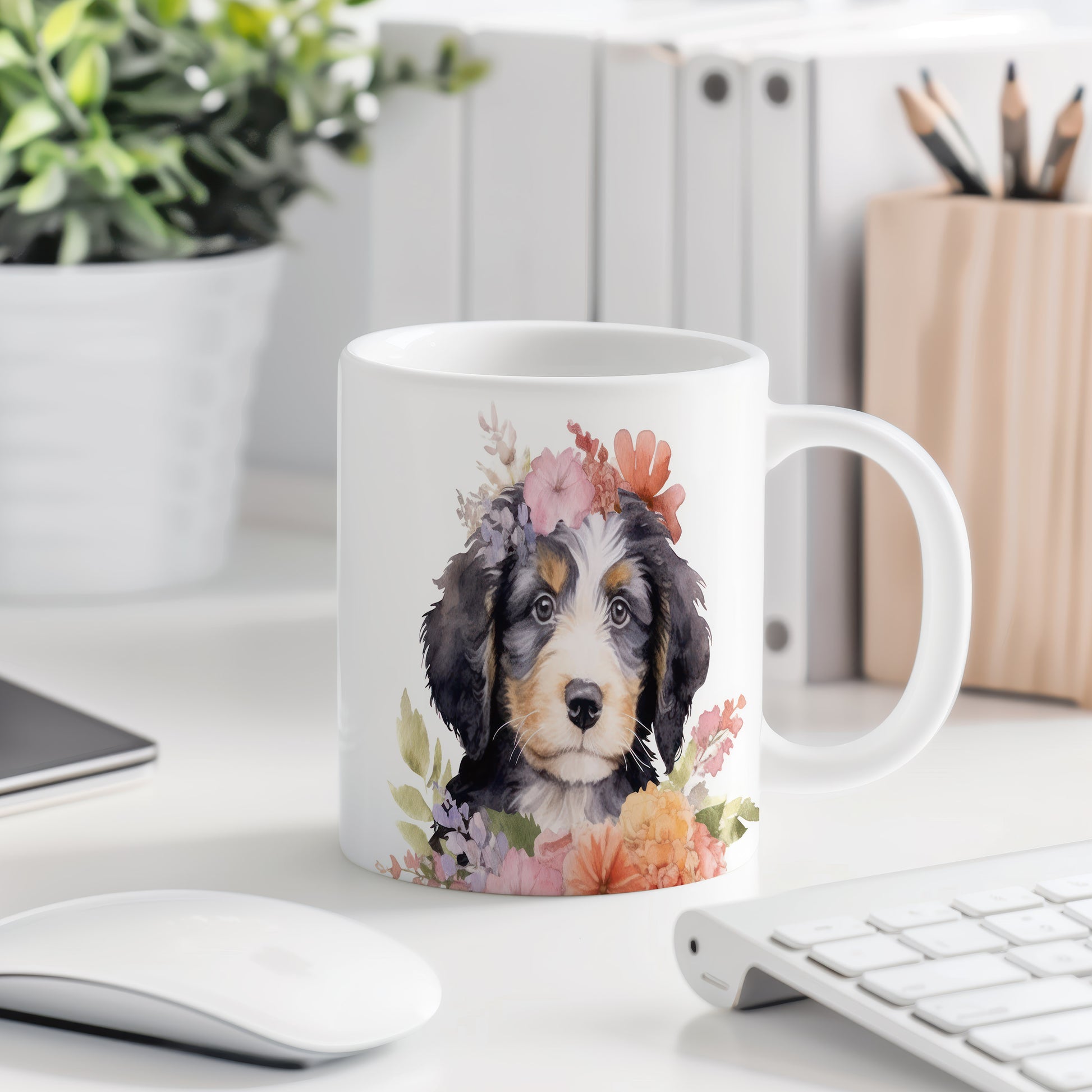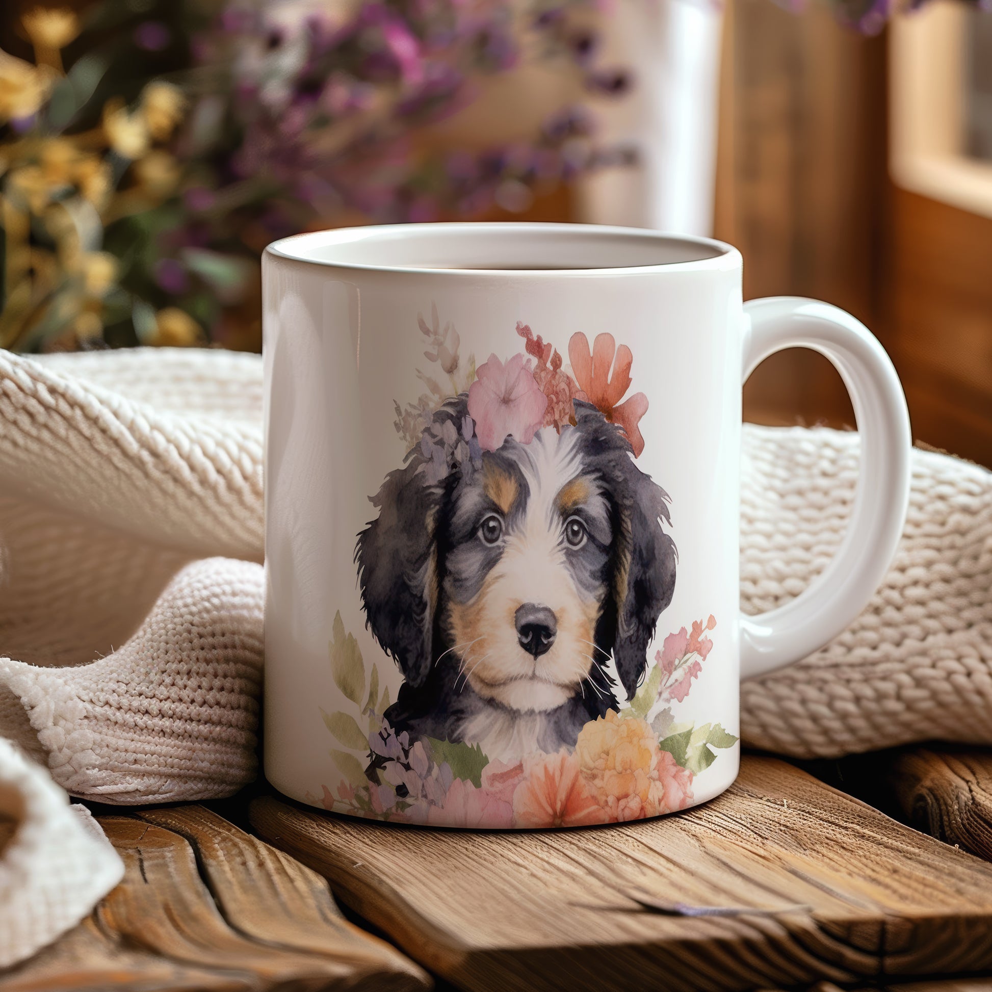 Tento keramický hrnek zdobí roztomilý pejsek s květinovým věncem. Je ideální pro milovníky psů a květin, skvěle se hodí jako dárek pro přátele nebo rodinu. Materiál: keramika. Objem: 330 ml. Vhodné do myčky i mikrovlnky. Používání tohoto hrnku přináší radost a útulnost do každého dne.