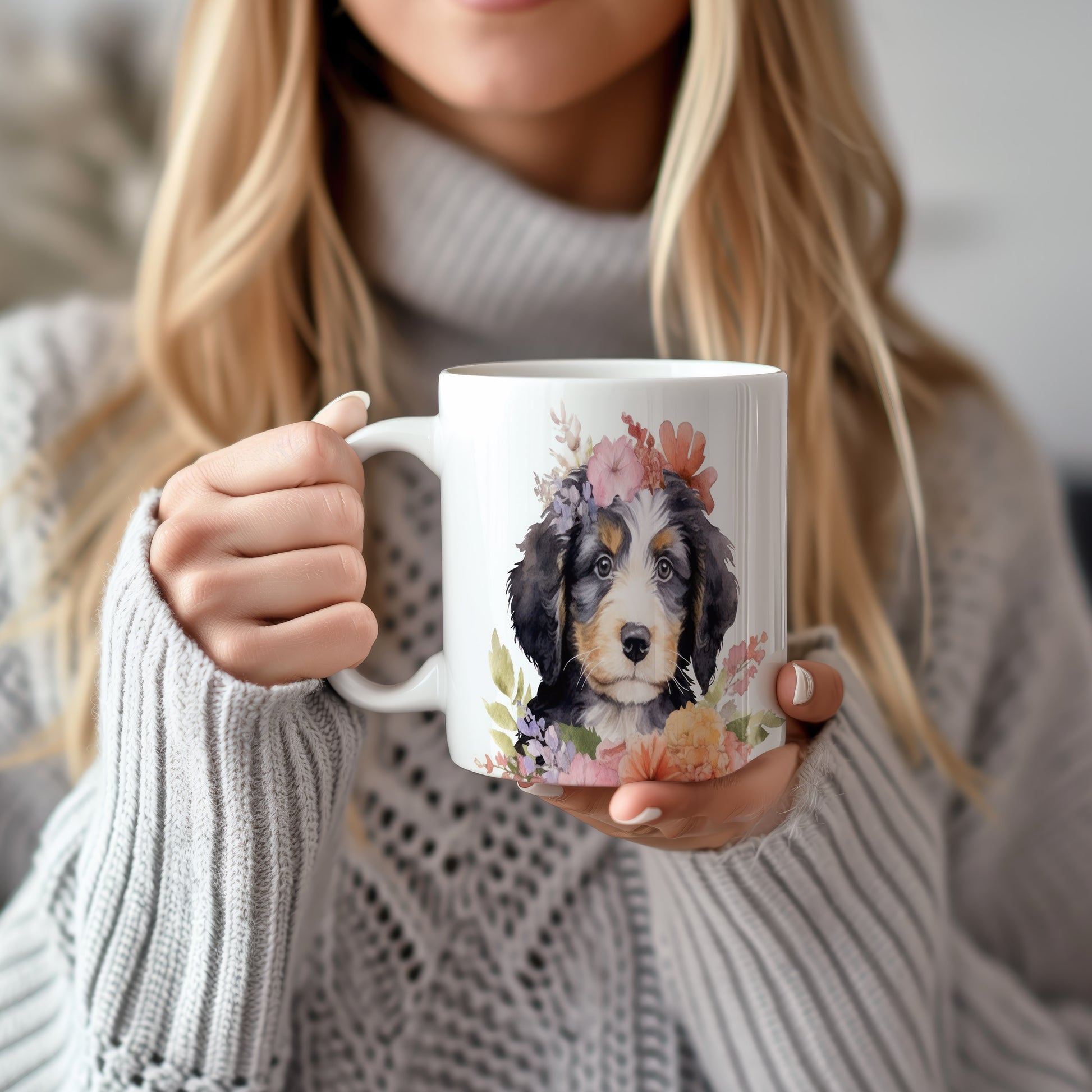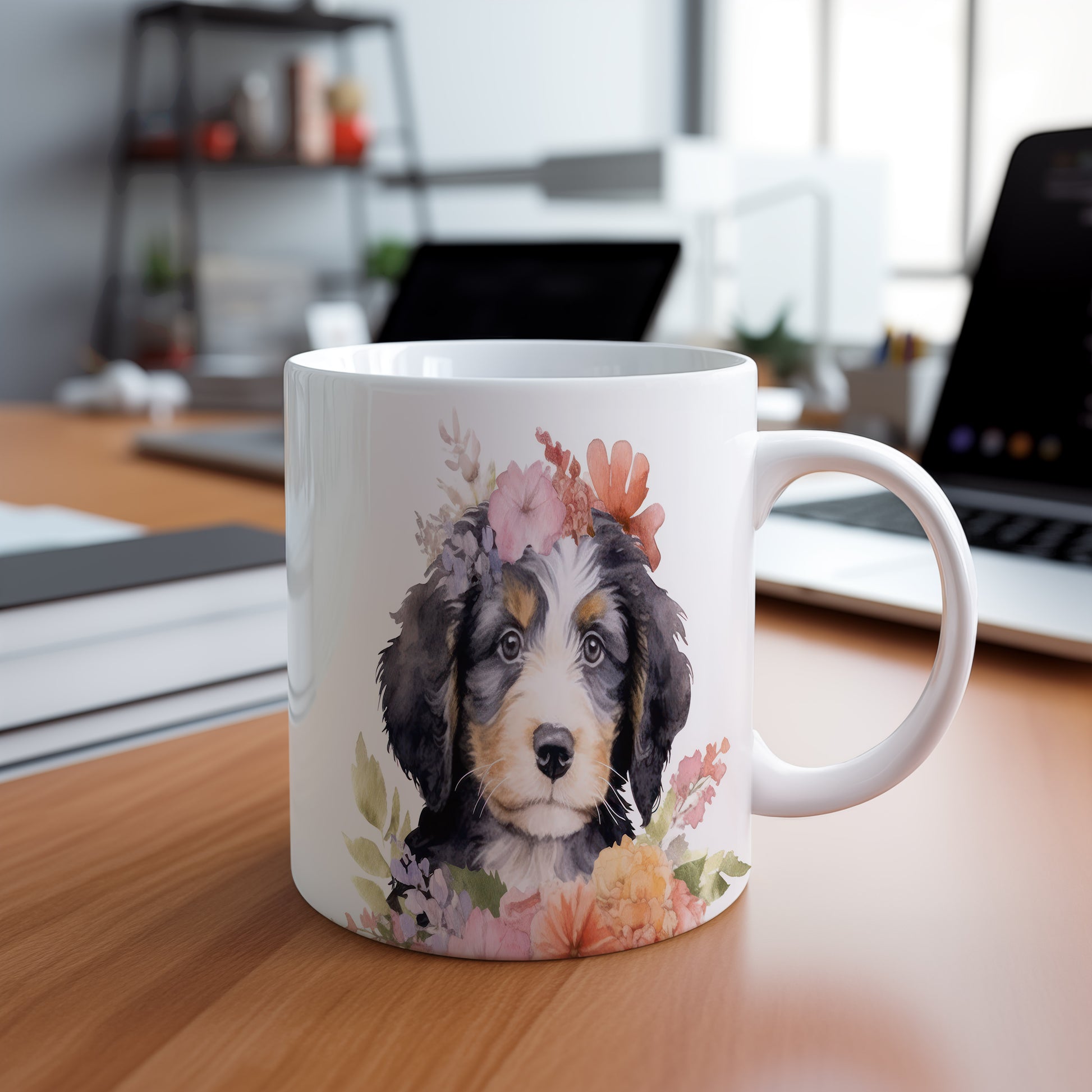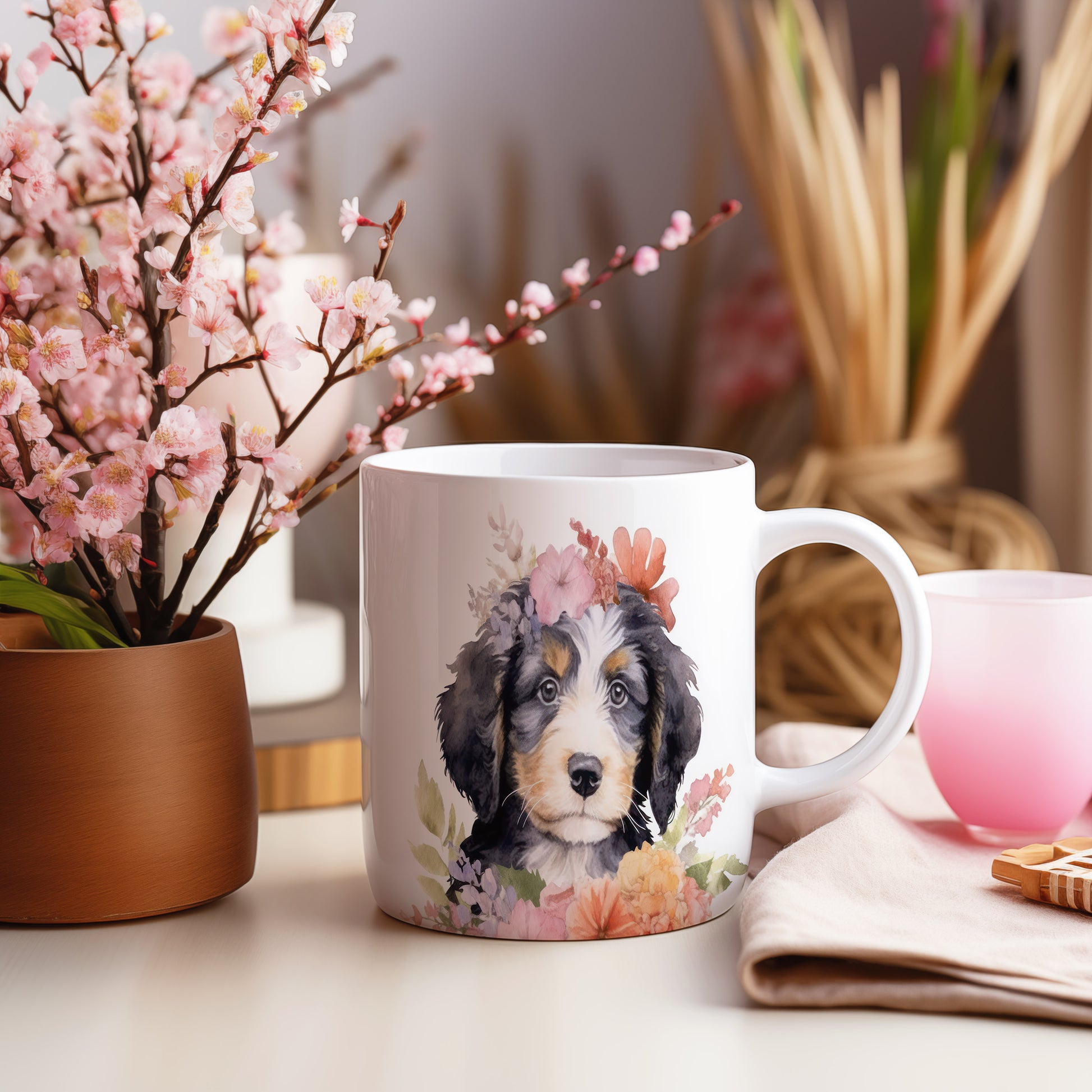 Tento keramický hrnek zdobí roztomilý pejsek s květinovým věncem. Je ideální pro milovníky psů a květin, skvěle se hodí jako dárek pro přátele nebo rodinu. Materiál: keramika. Objem: 330 ml. Vhodné do myčky i mikrovlnky. Používání tohoto hrnku přináší radost a útulnost do každého dne.