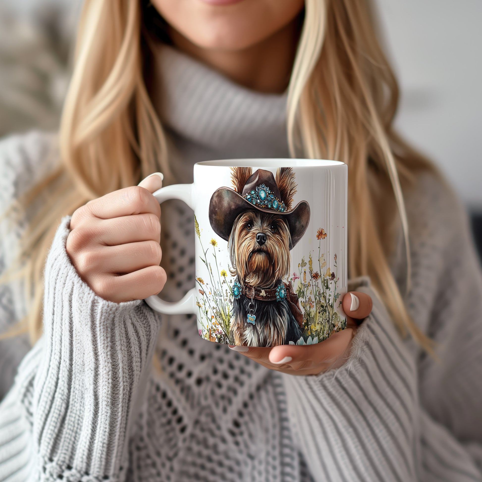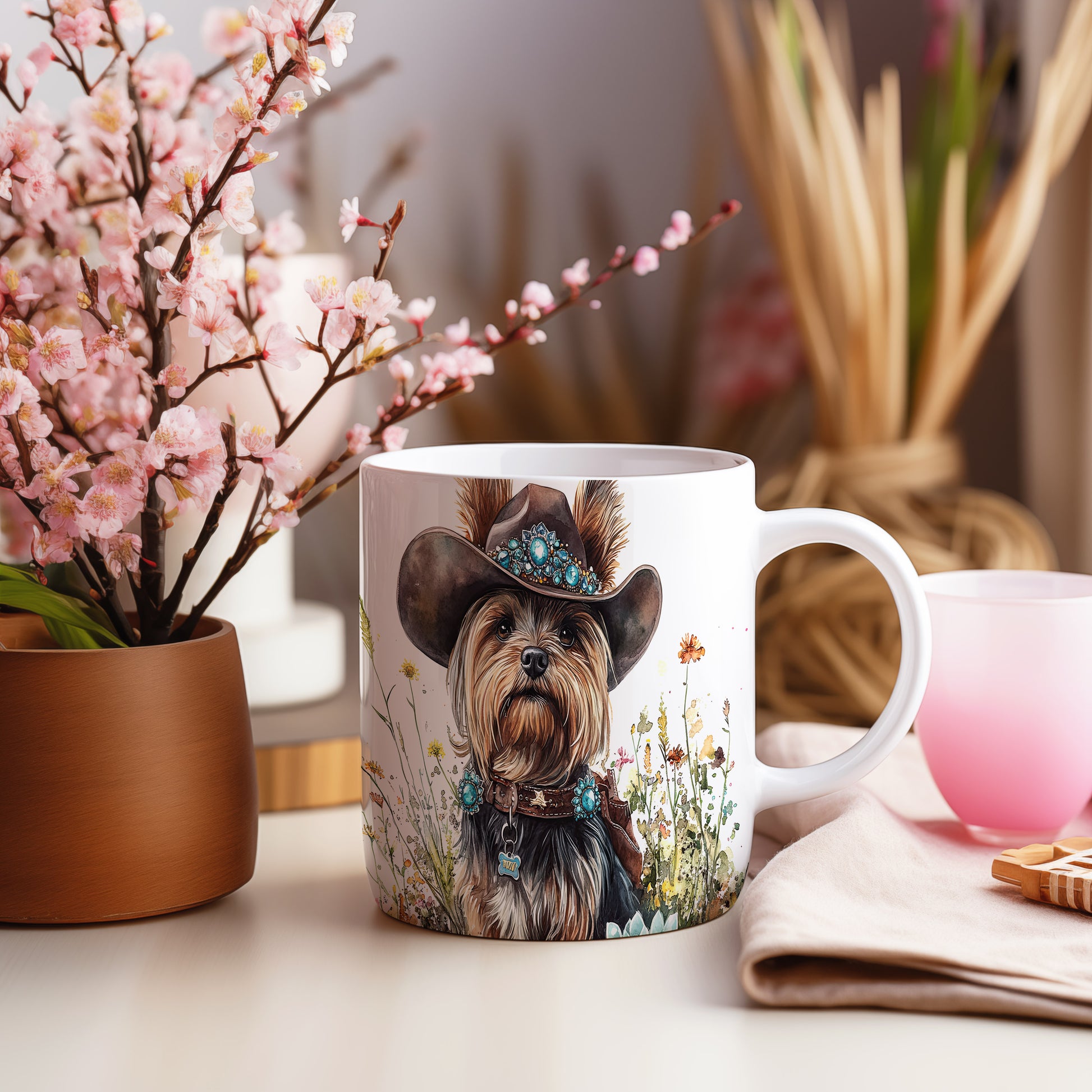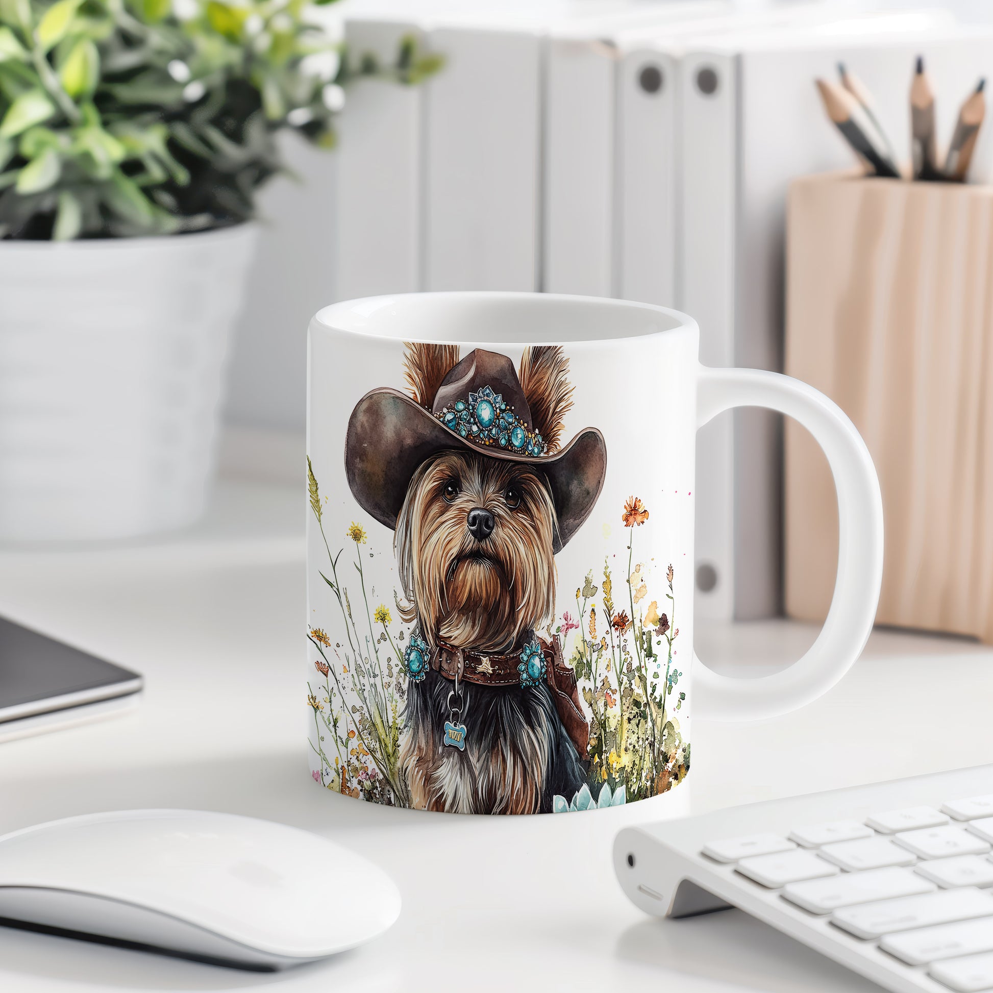 Hrnek s roztomilým yorkshirským teriérem v klobouku – jemnými detaily