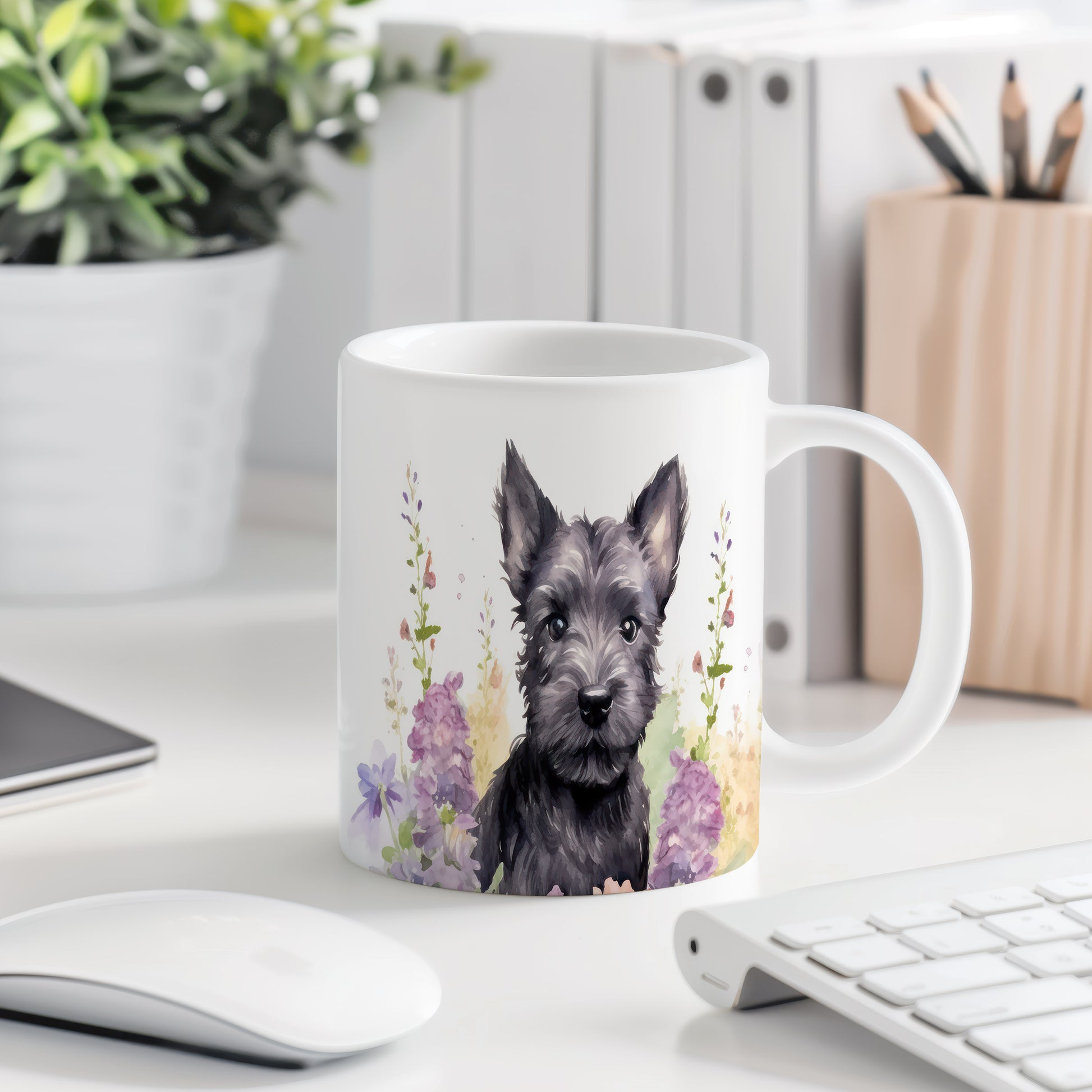 Hrnek s roztomilým pejskem v růžových tónech a květinovém pozadí