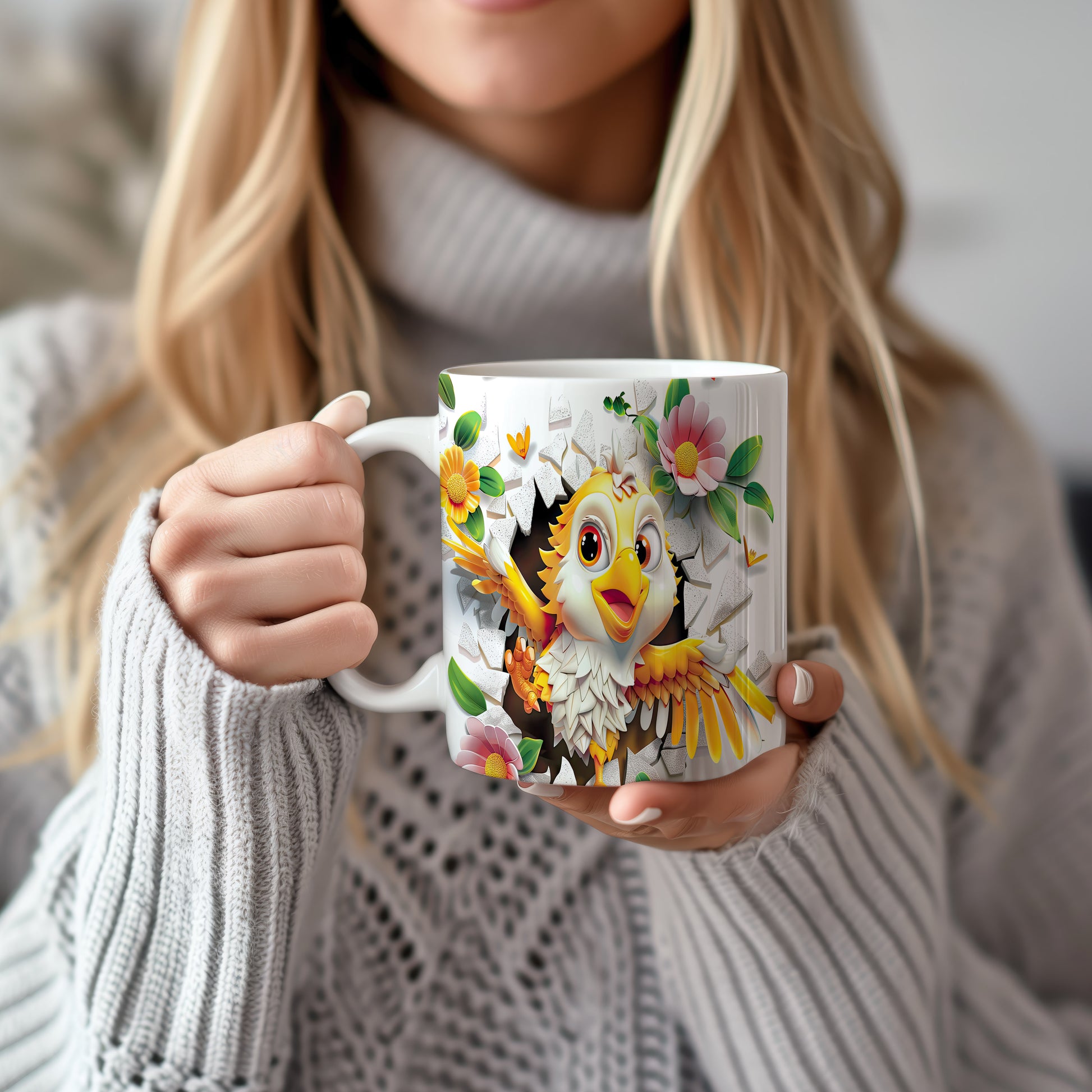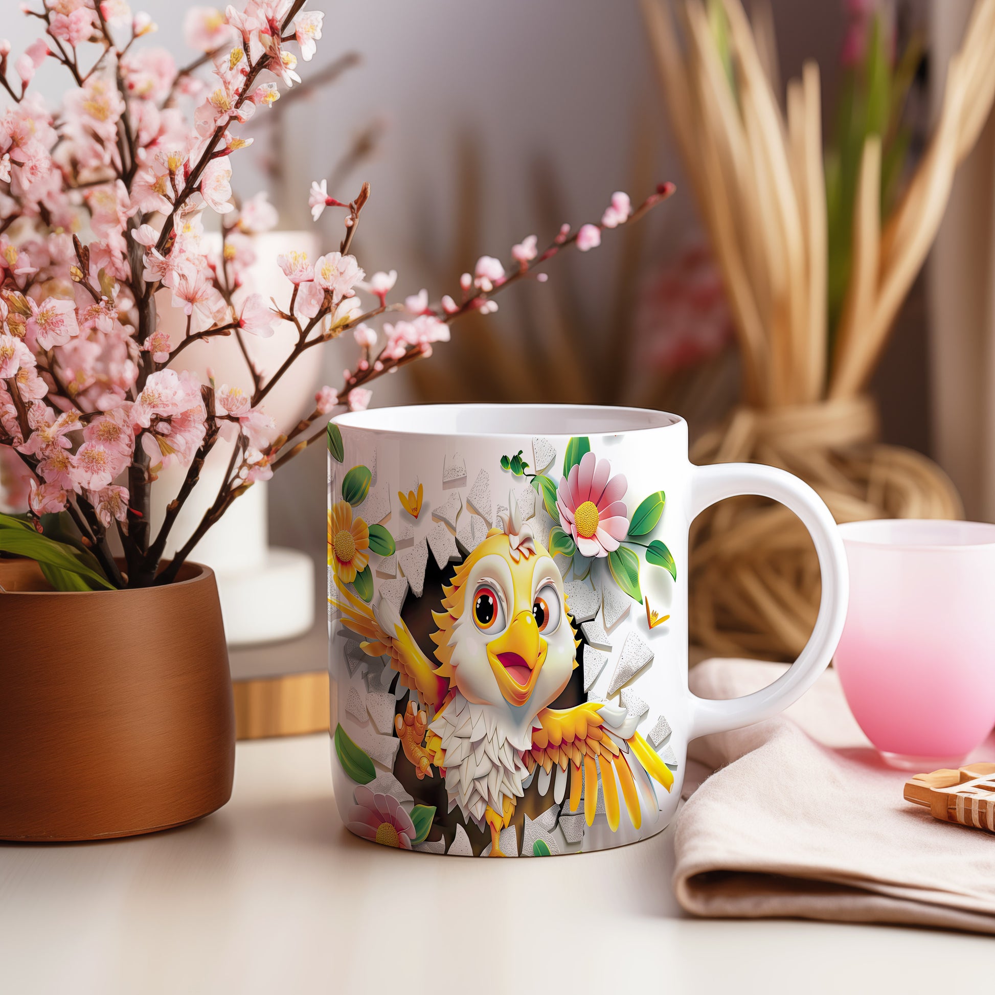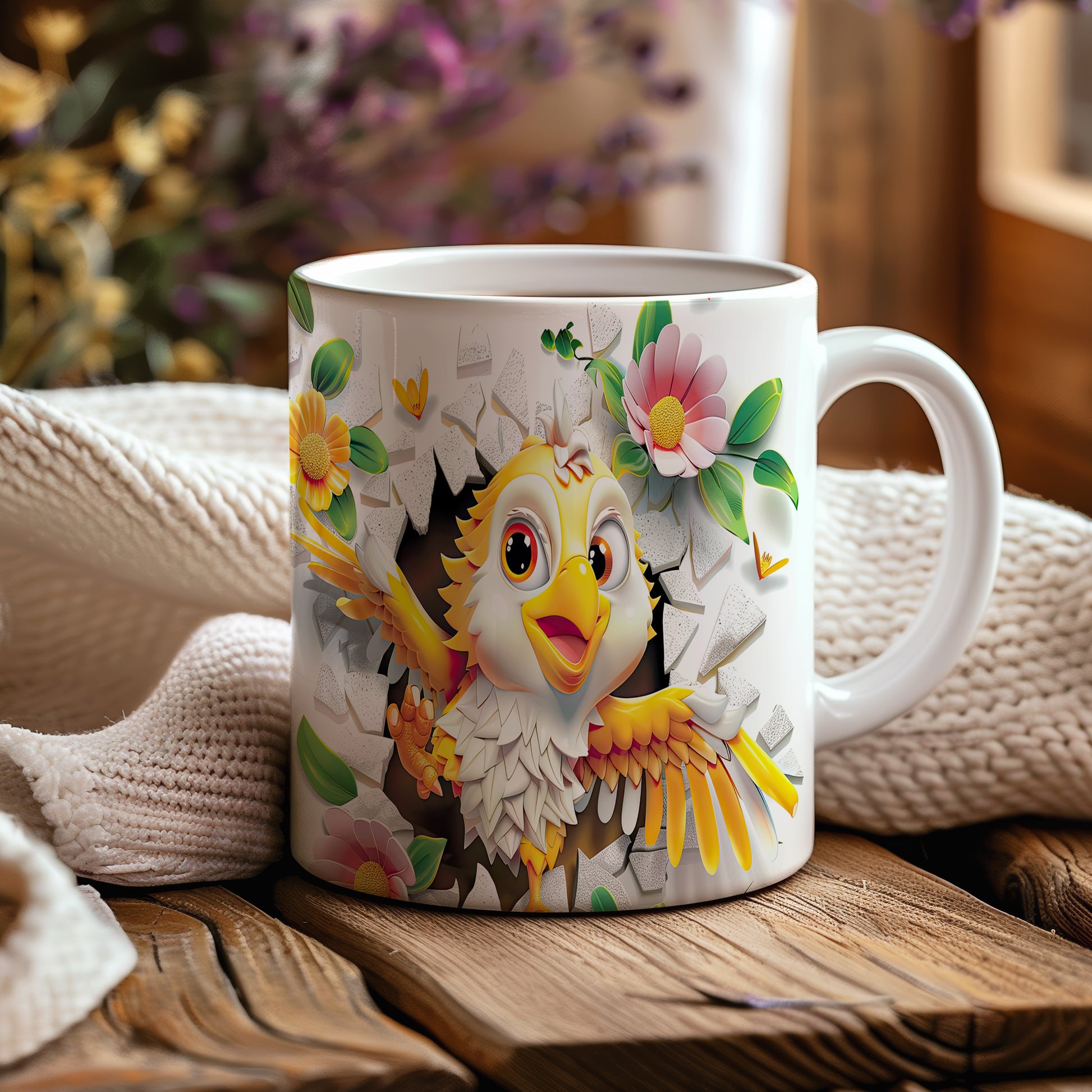 Tento hrnek zobrazuje veselého ptáčka vyklánějícího se z rozbitého vejce, obklopeného květinami. Je ideální pro milovníky přírody a skvělým dárkem pro přátele nebo rodinu. Materiál: keramika. Objem: 330 ml. Vhodné do myčky i mikrovlnky. Užívejte si každé sousto s tímto hrnkem, který přináší radost do každého dne.