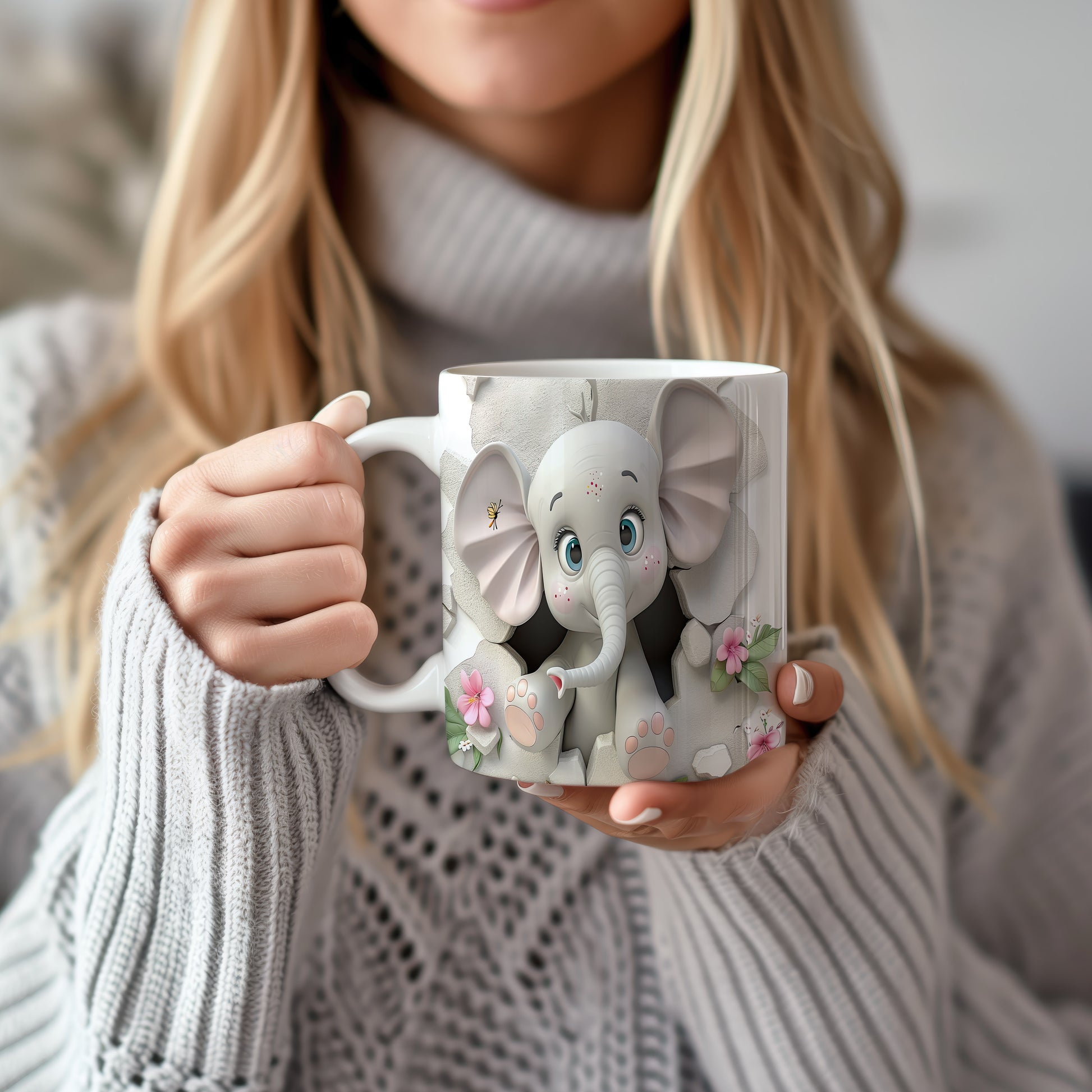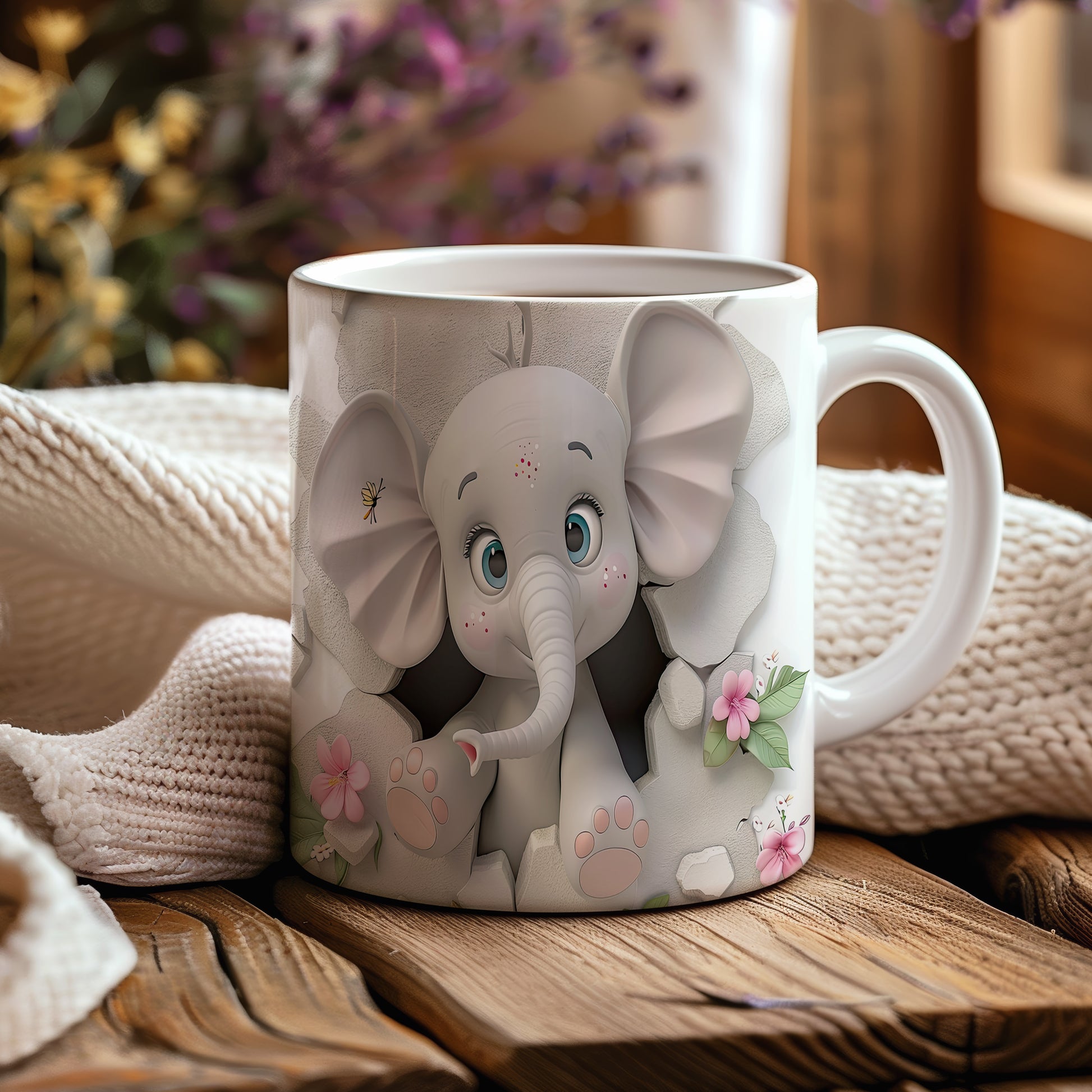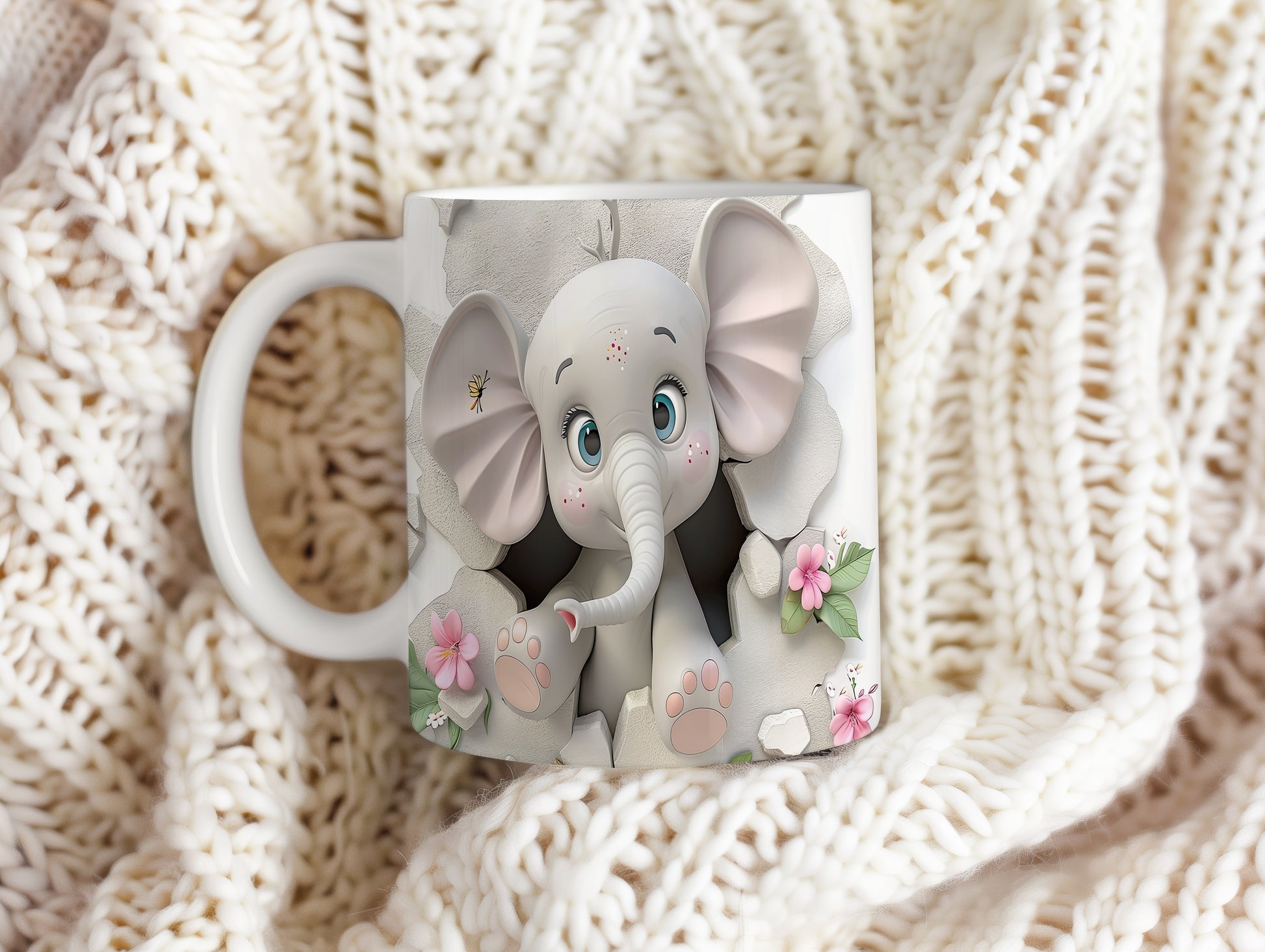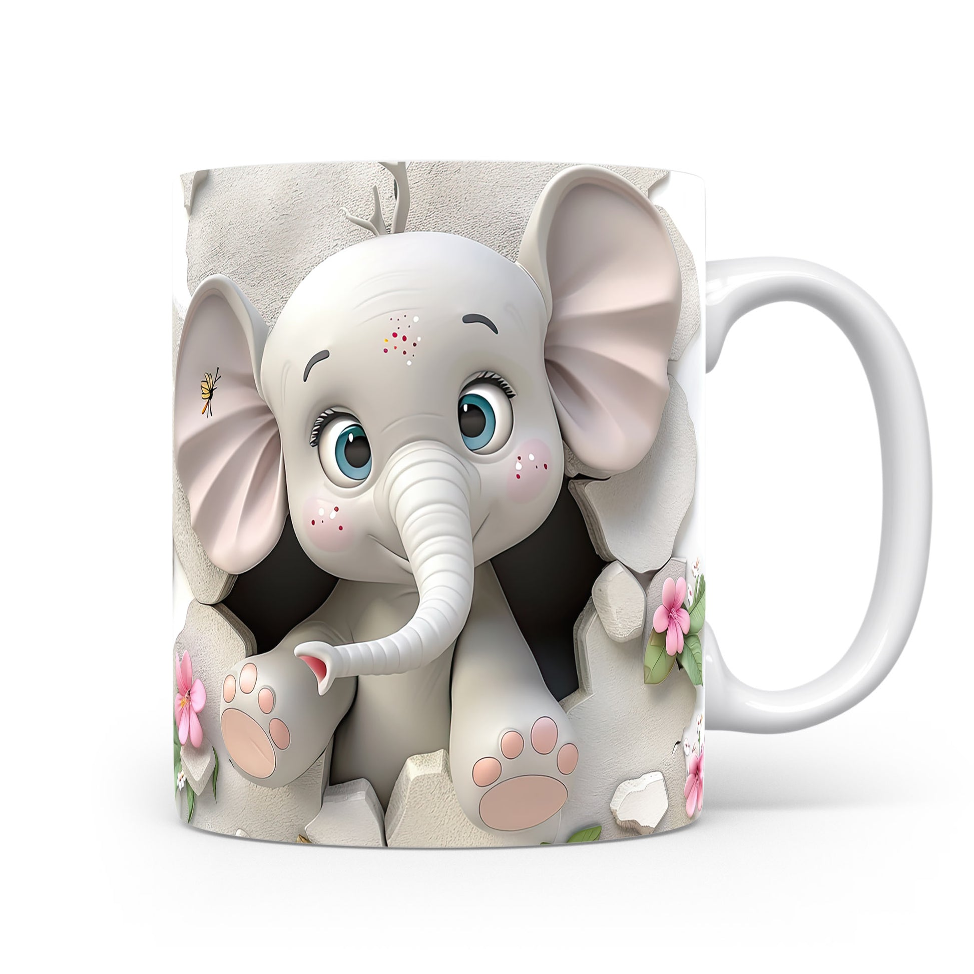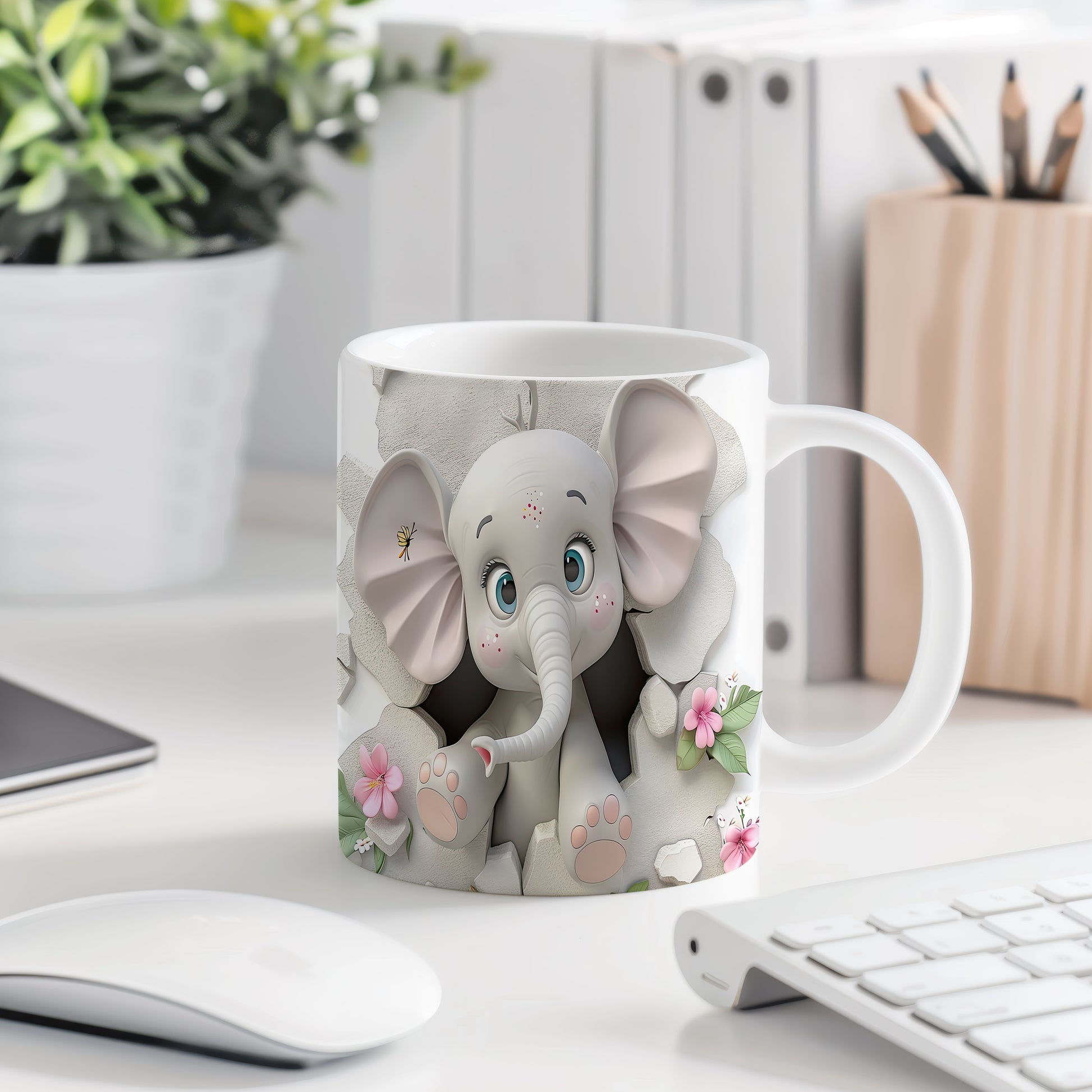 Hrnek s roztomilým slonem v květinách – 3D efektem