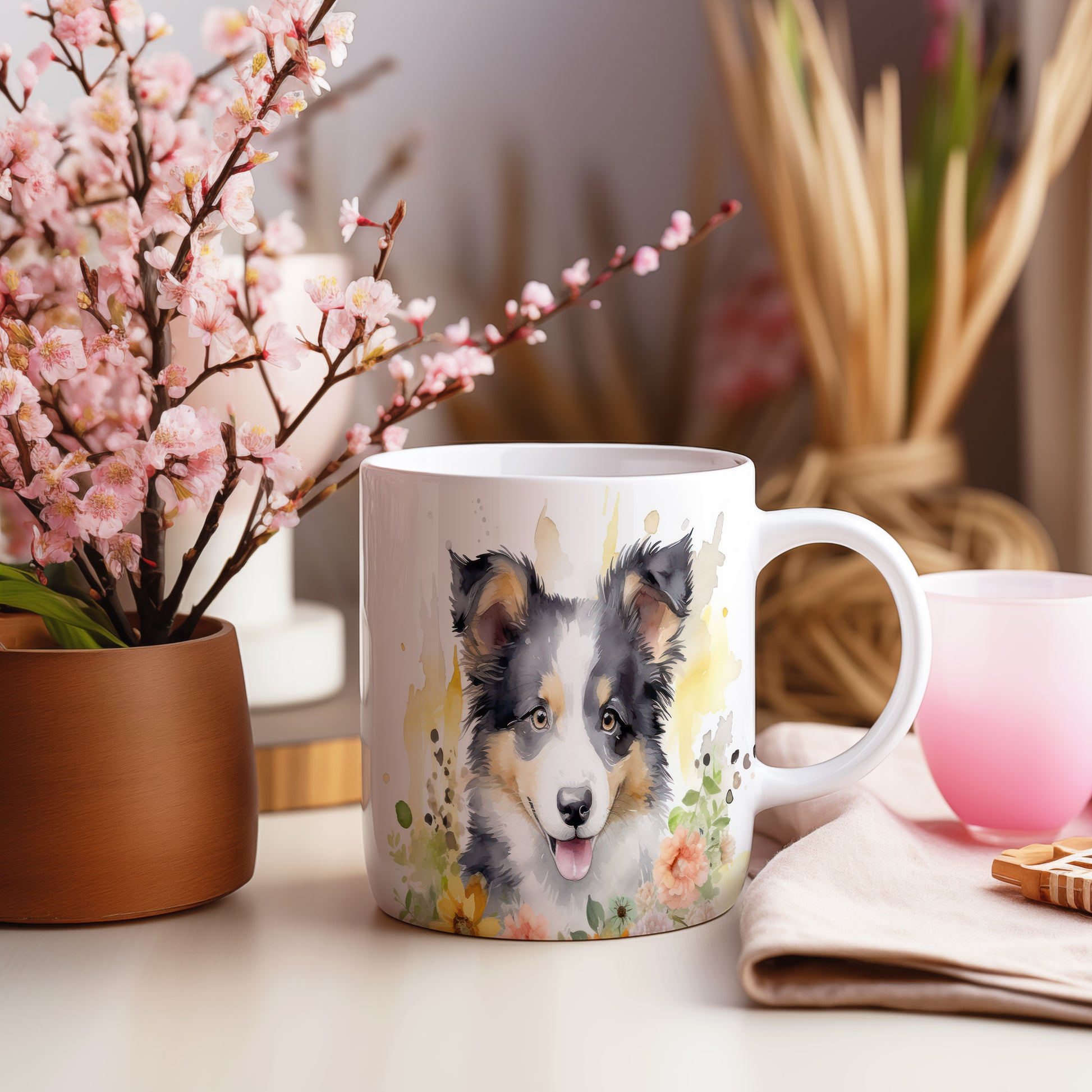 Hrnek s roztomilým špicem a květinami
